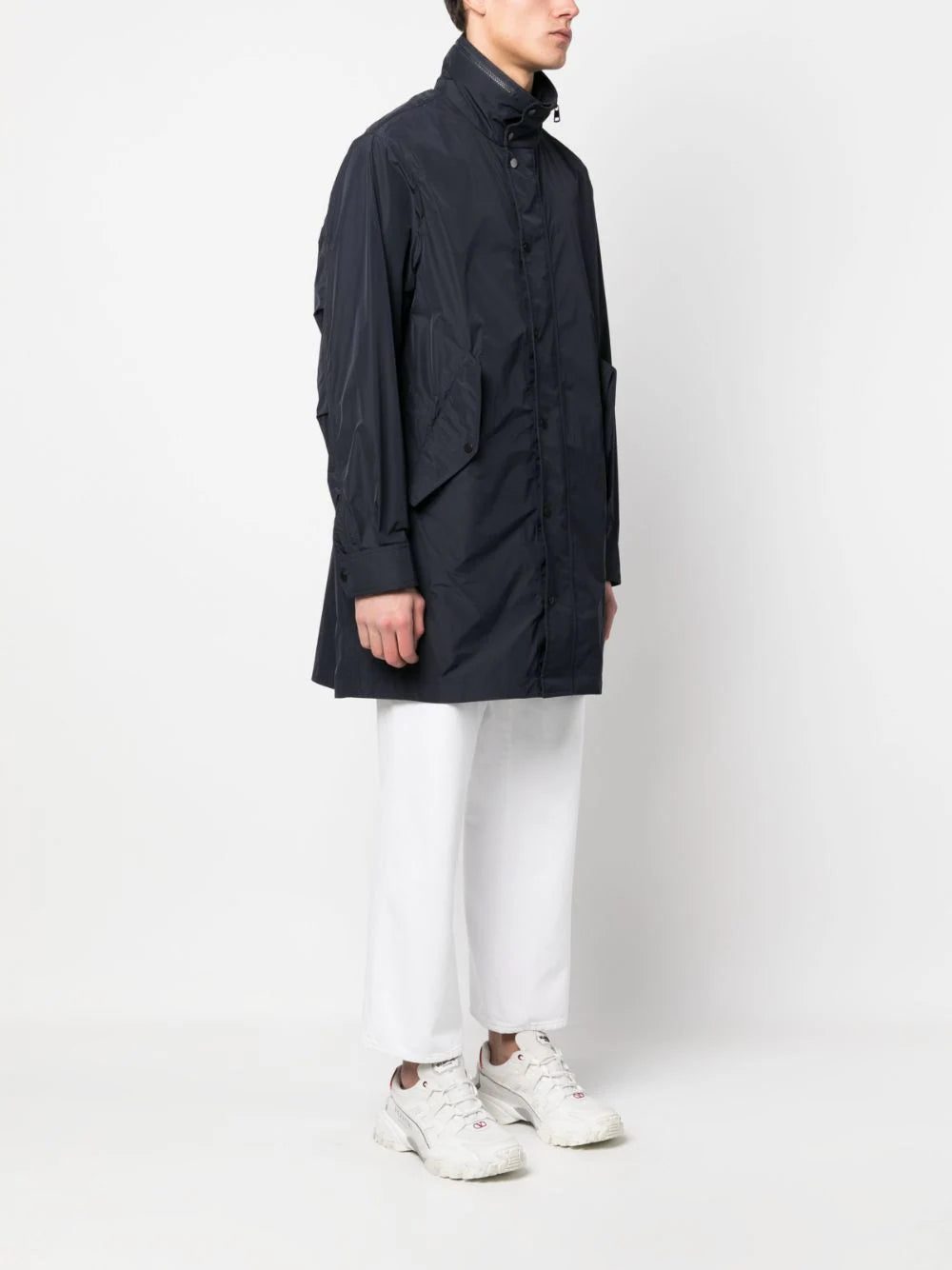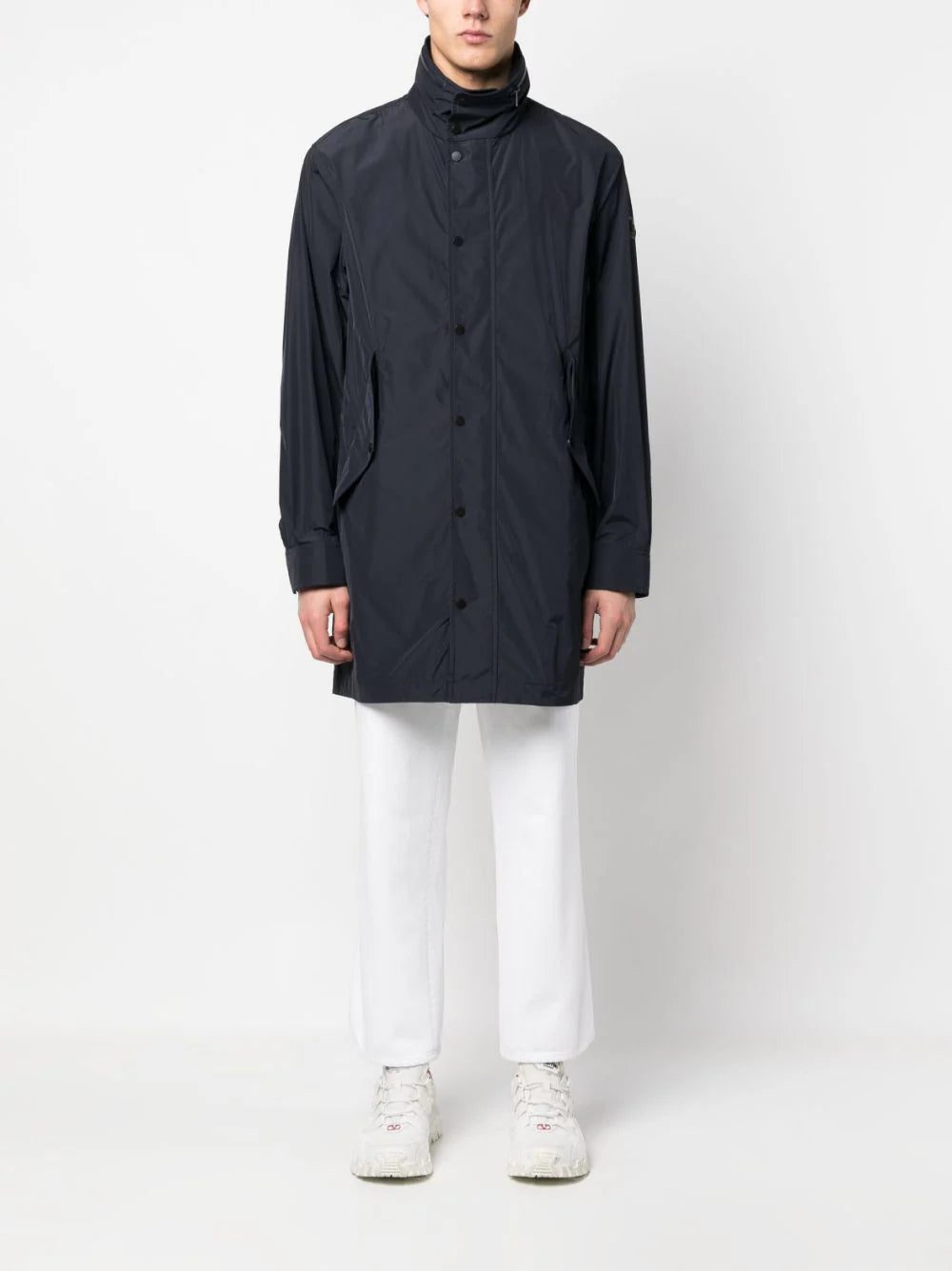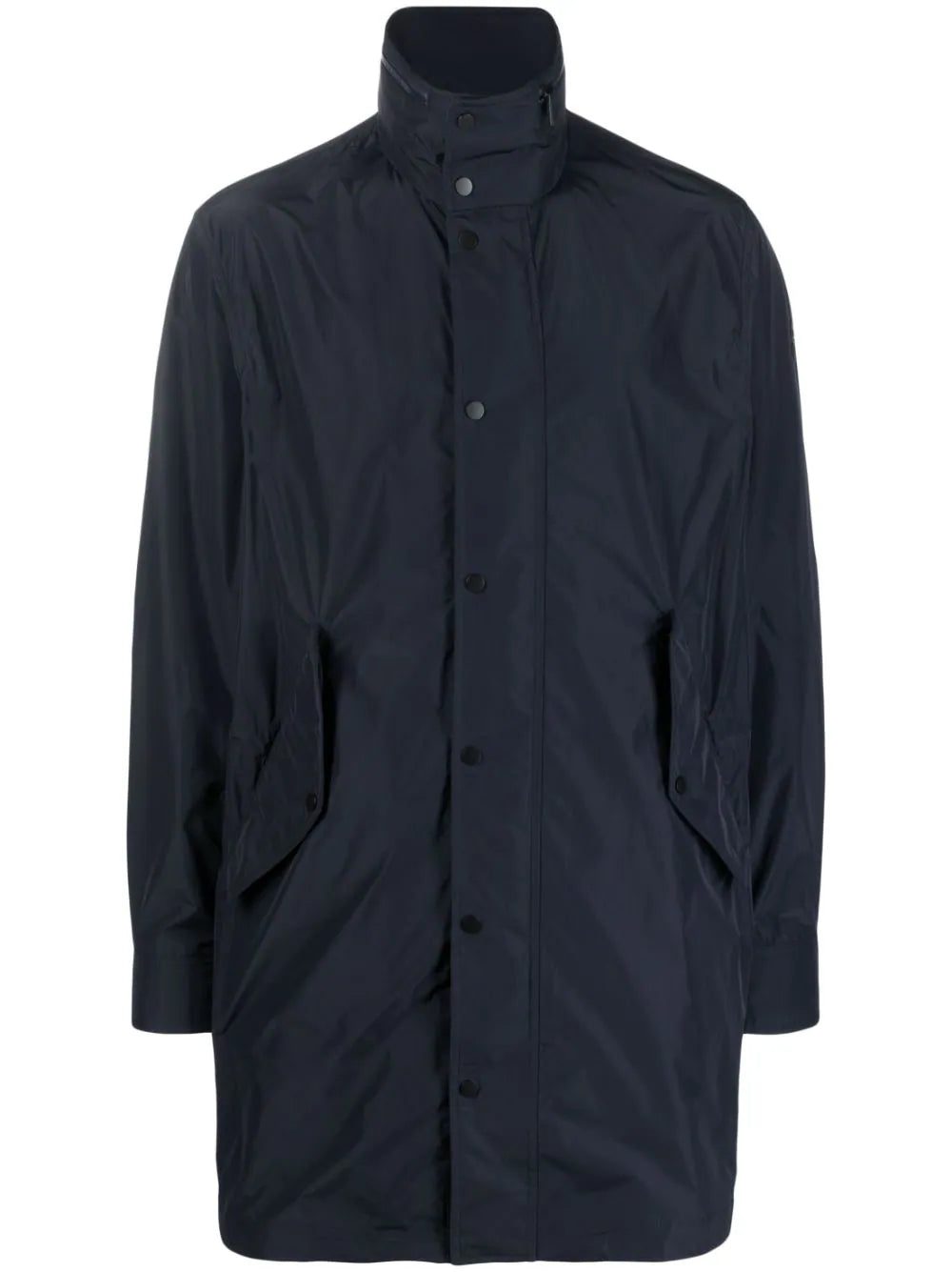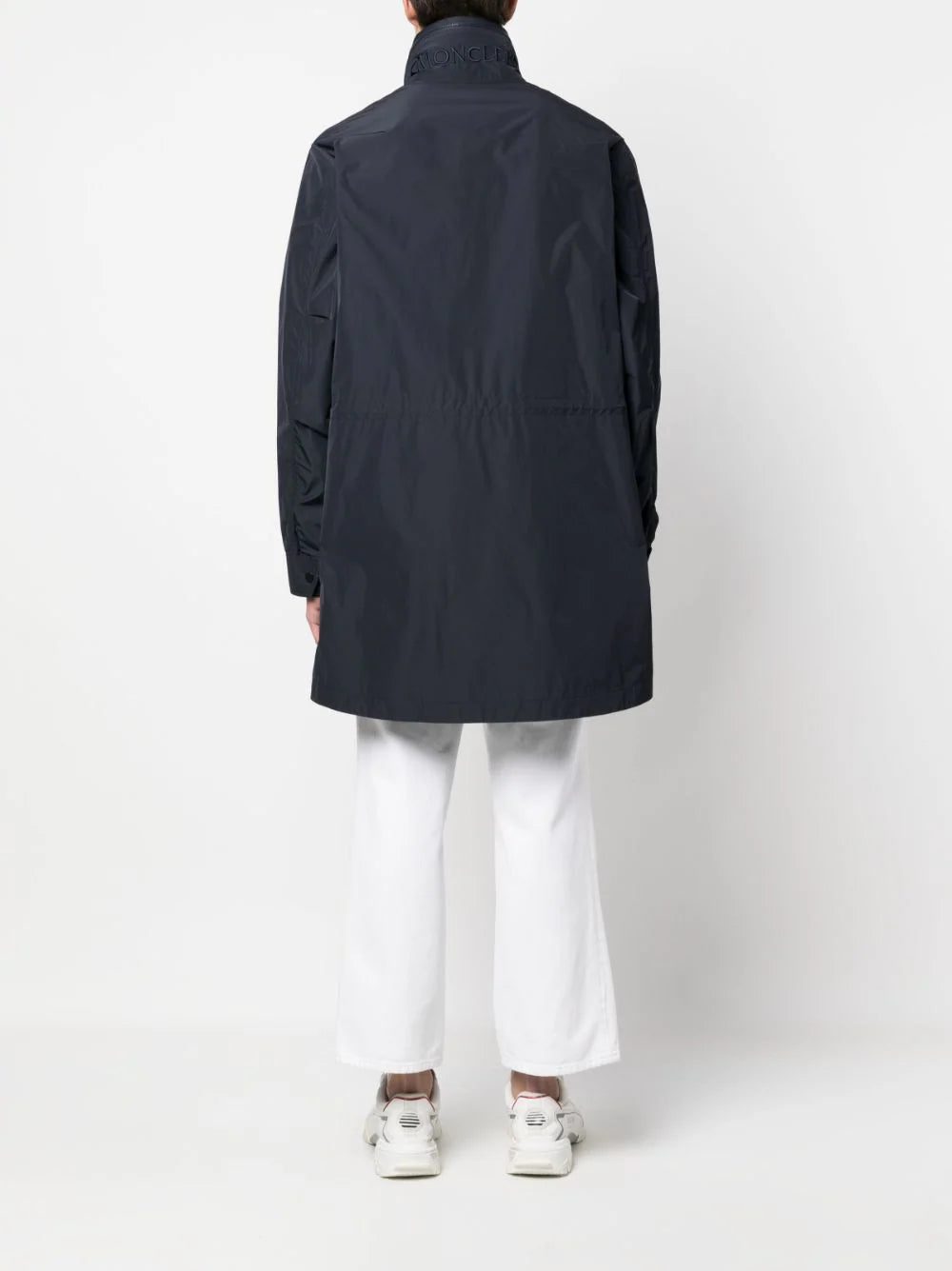 Moncler's jacket is inspired by both sportswear and tailoring. Made from a water-repellent technical fabric that keeps its shape despite folding and packing. Notice the embroidered logo at the collar.