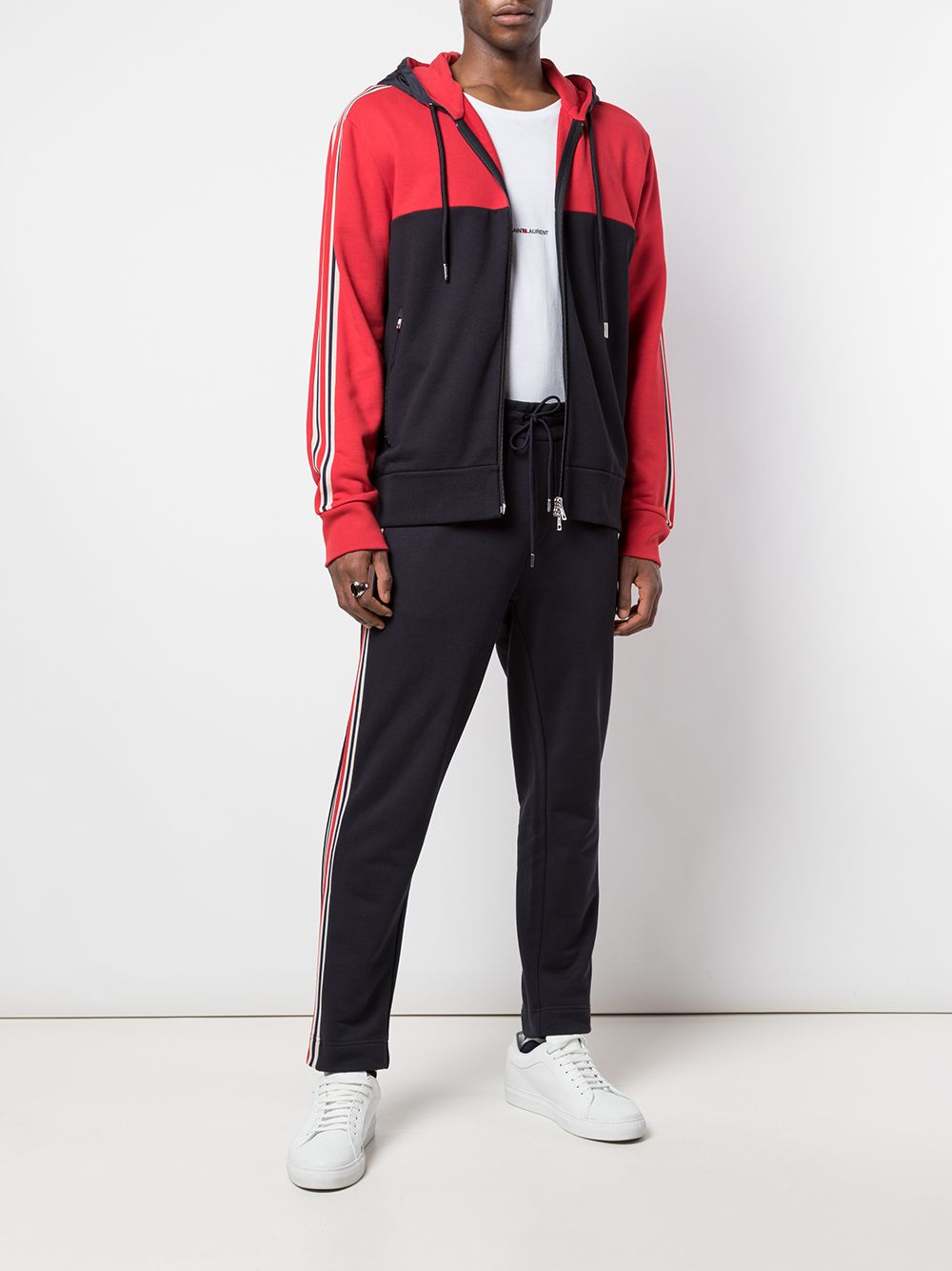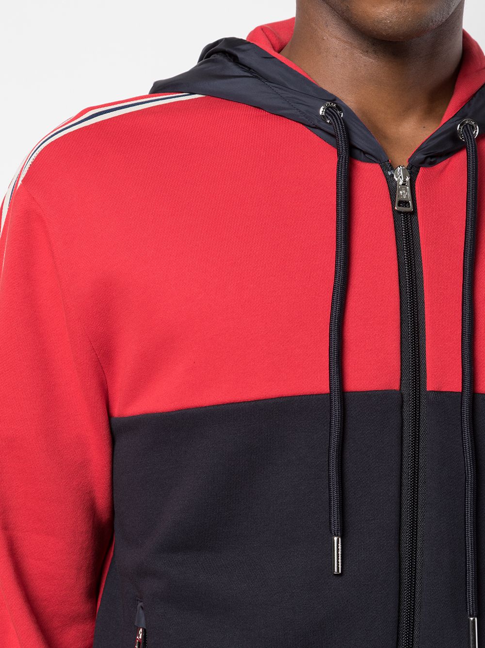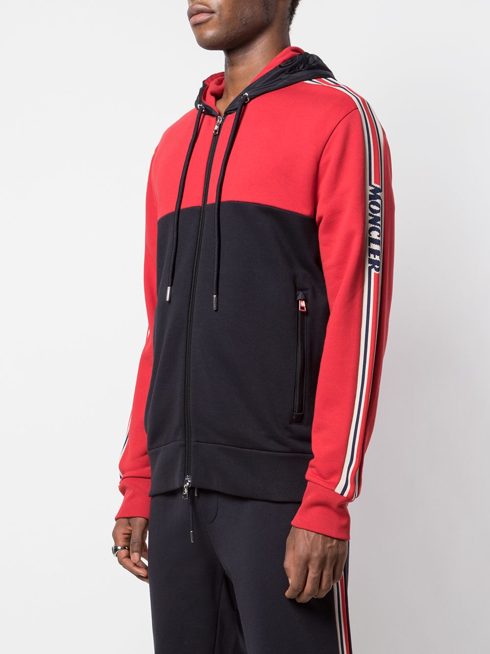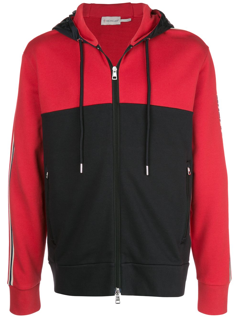 Red and navy cotton colour blocked zipped hoodie from Moncler featuring a stripe detail to the side, long sleeves, a front zip fastening, front zipped pockets and a straight hem.