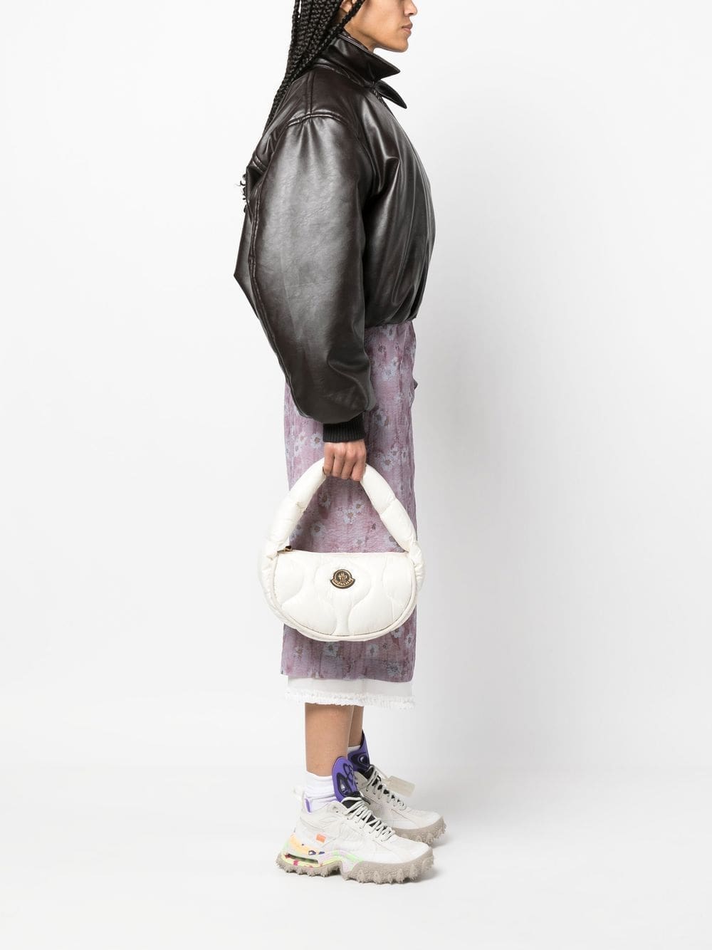white quilted padded design logo patch to the front gold-tone hardware single shoulder strap top zip fastening main compartment internal zip-fastening pocket