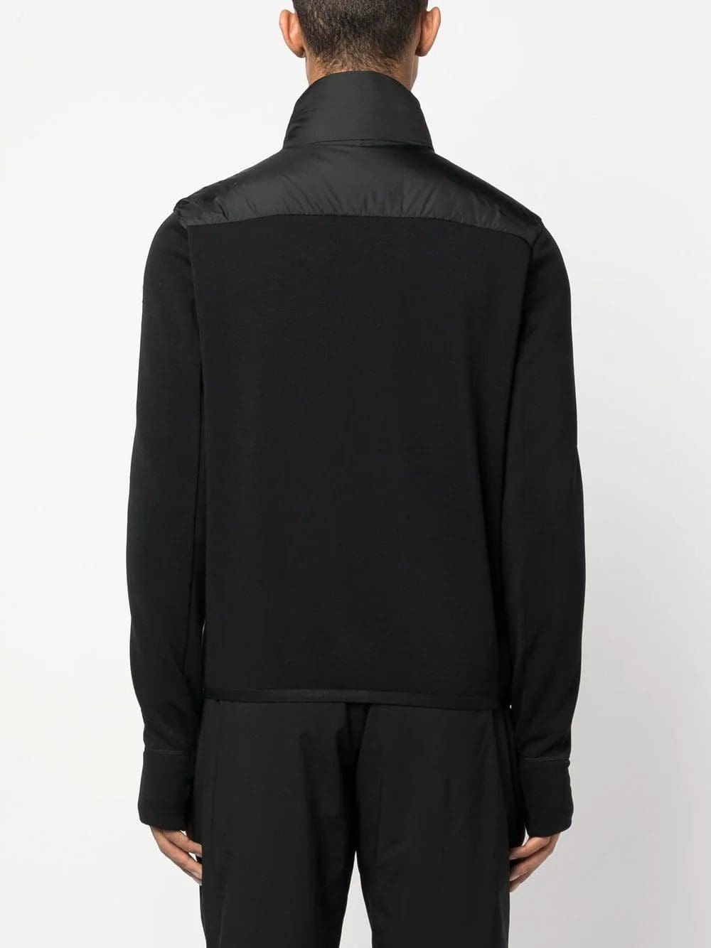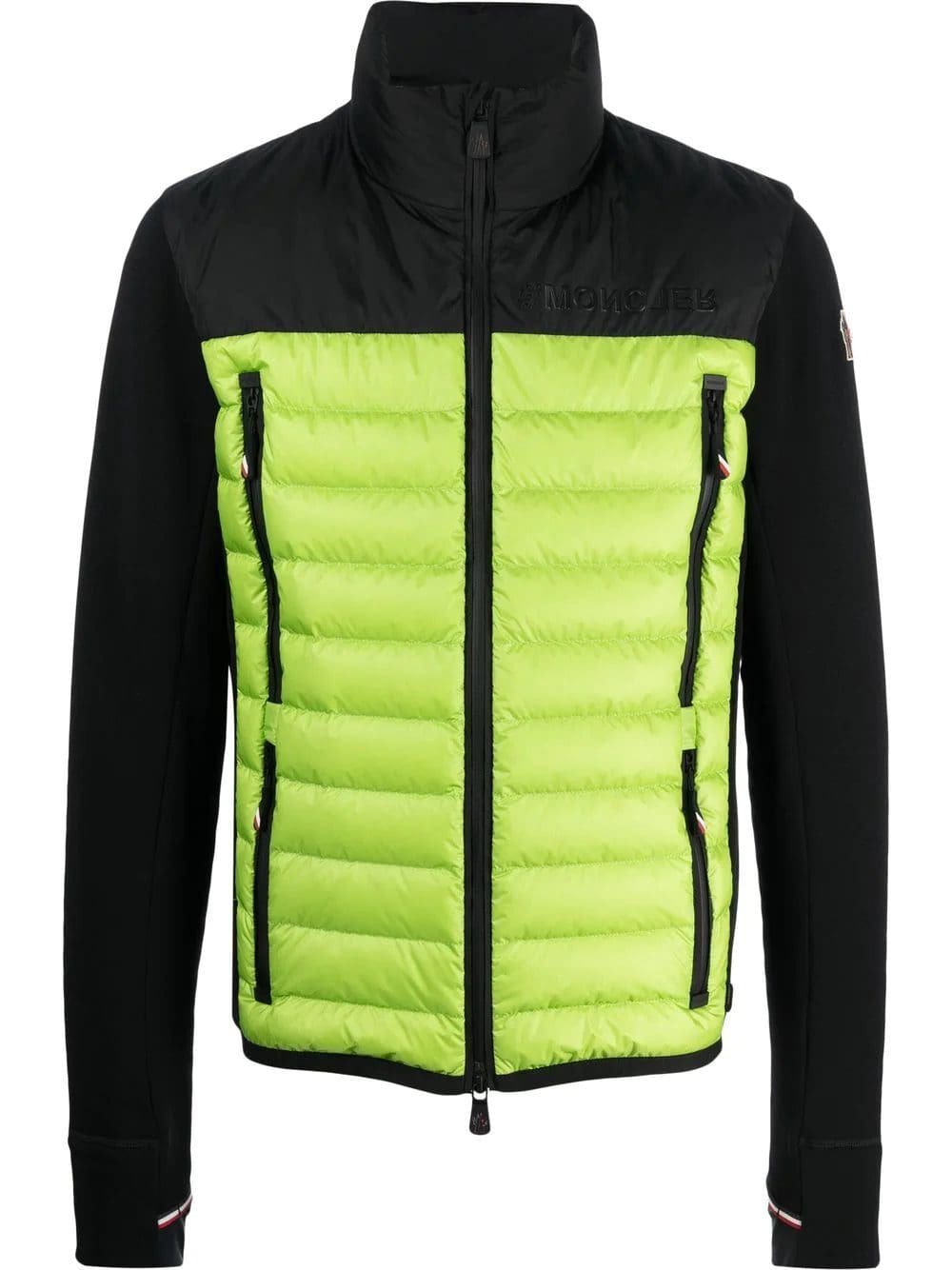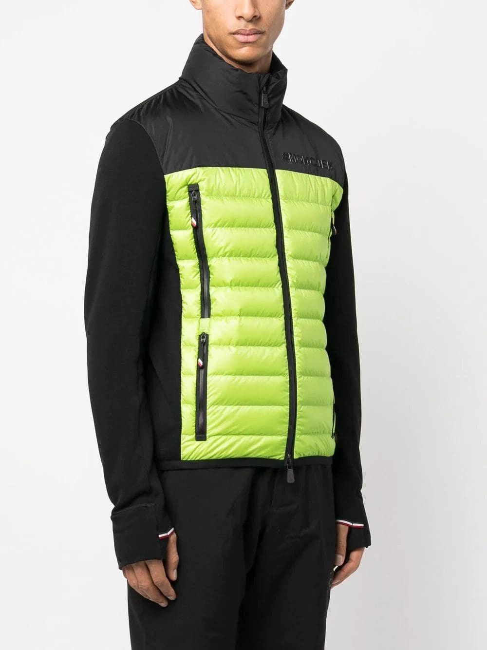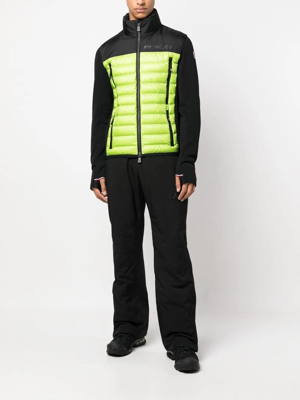 logo-patch funnel neck jacket from MONCLER GRENOBLE featuring padded design, down-feather filling, logo patch at the sleeve, funnel neck, front zip fastening, long sleeves and black/lime-green.