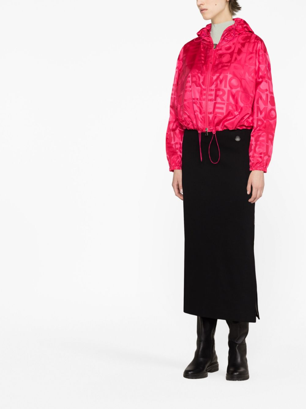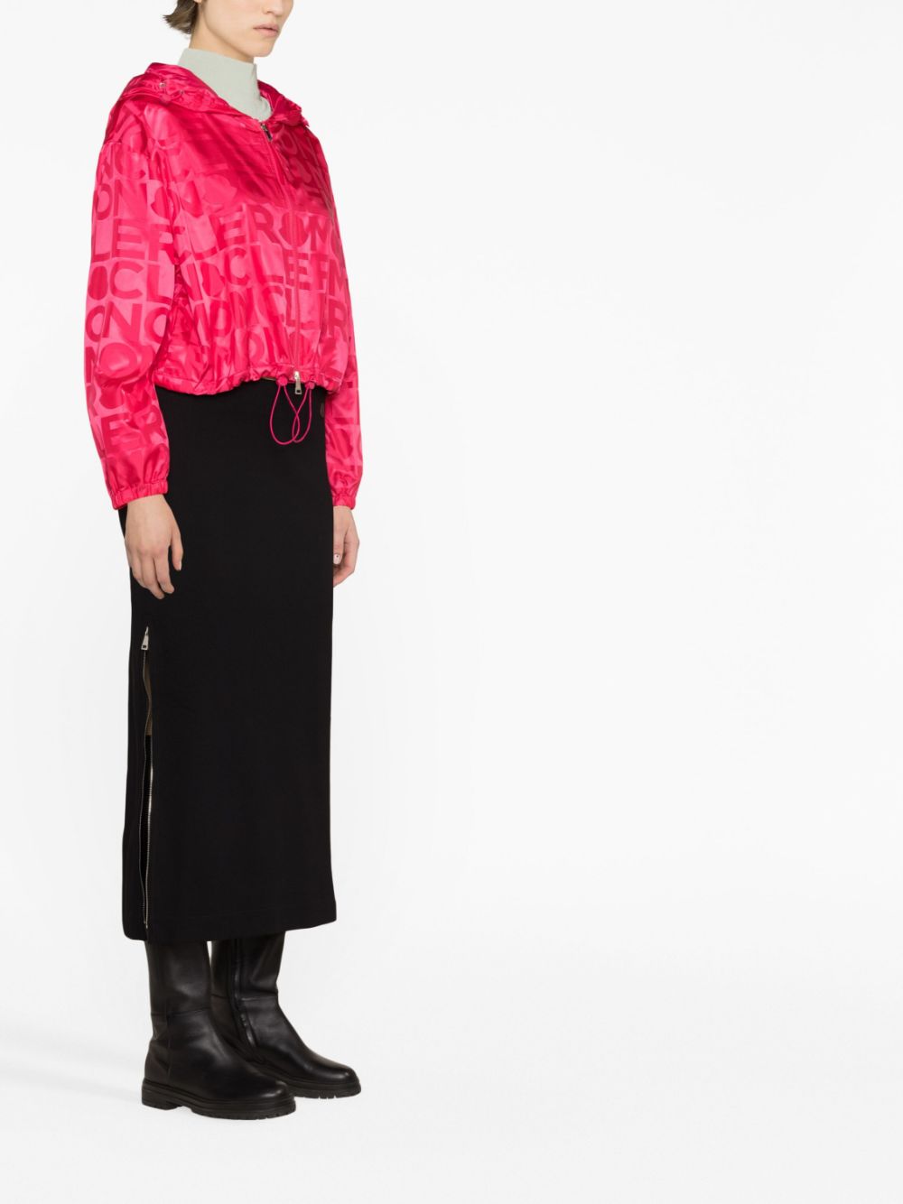 Adding a city-inspired twist to Moncler's signature functional approach to outerwear, this fuchsia pink jacket is constructed from satin-finish material and enhanced with an all-over logo print in a tonal hue.
