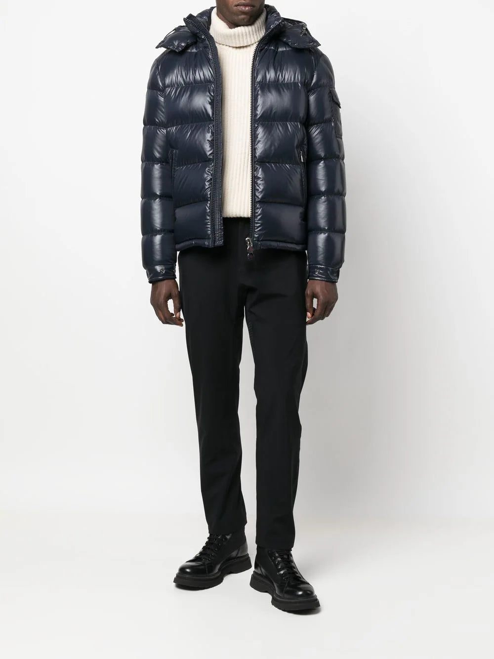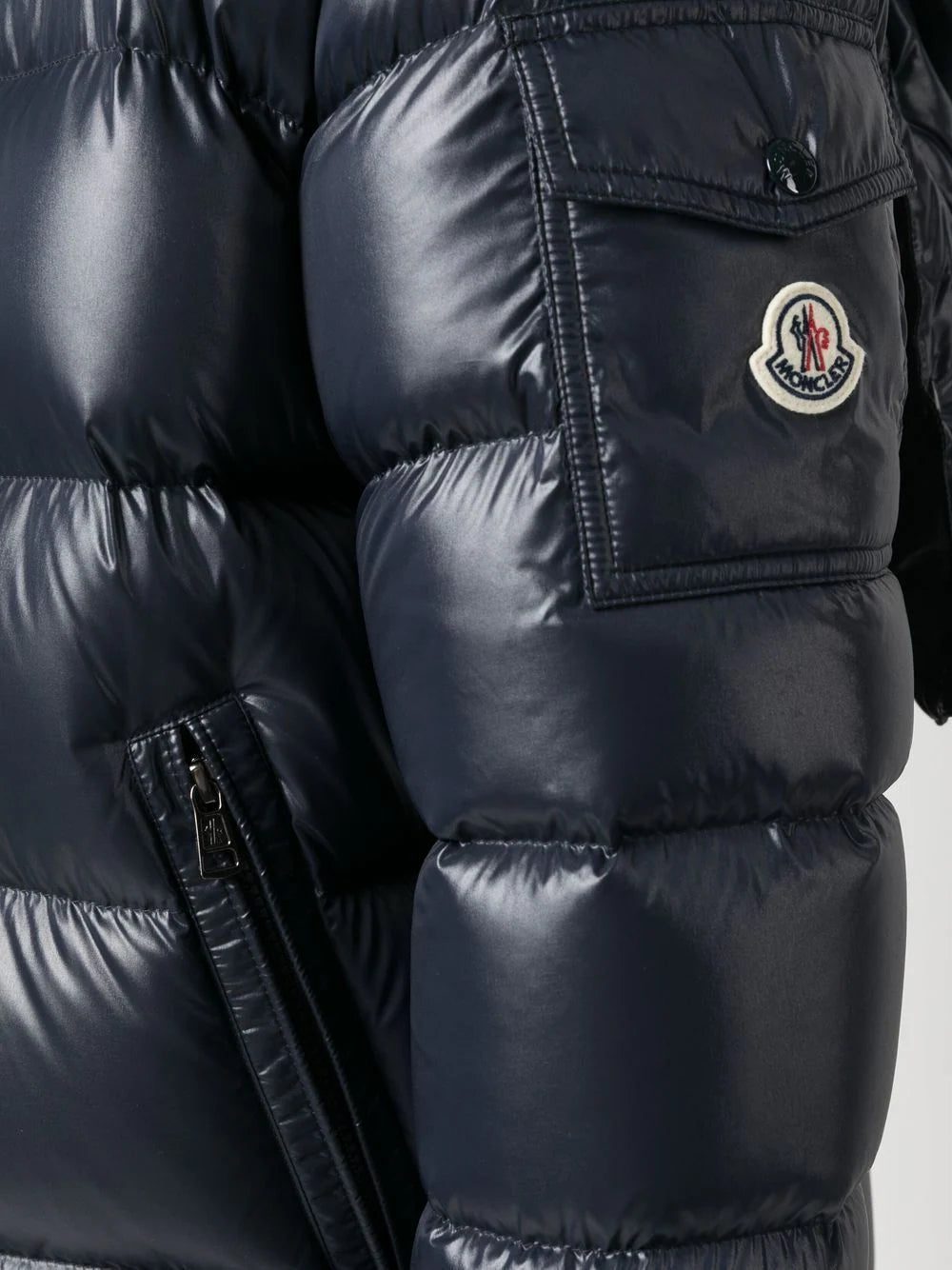 Known for their padded down jackets, Italian fashion house Moncler was founded in 1952 and started life creating quilted sleeping bags and tents. Presented in a navy hue, this Maya jacket is detailed with feather-down padding and the label's signature logo patch to the outer left sleeve.