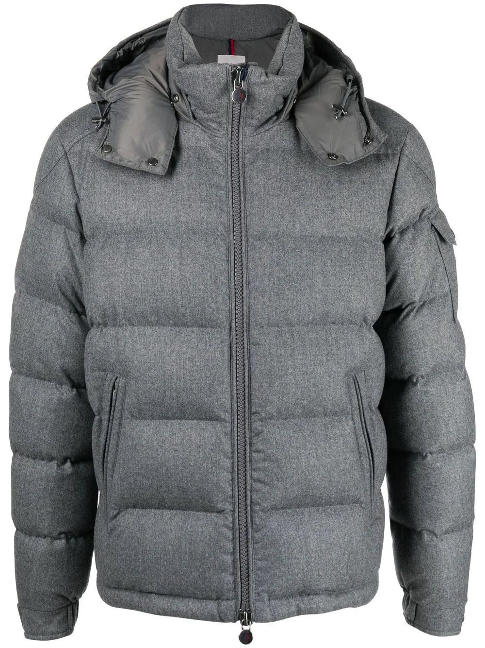 Montgenevre duck-down jacket from MONCLER featuring slate grey, virgin wool, duck feather, logo patch at the shoulder, classic hood, front zip fastening, funnel neck, two side zip-fastening pockets, sleeve patch pocket and straight hem.
