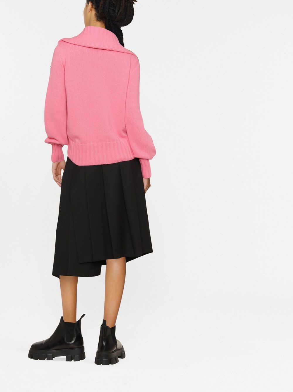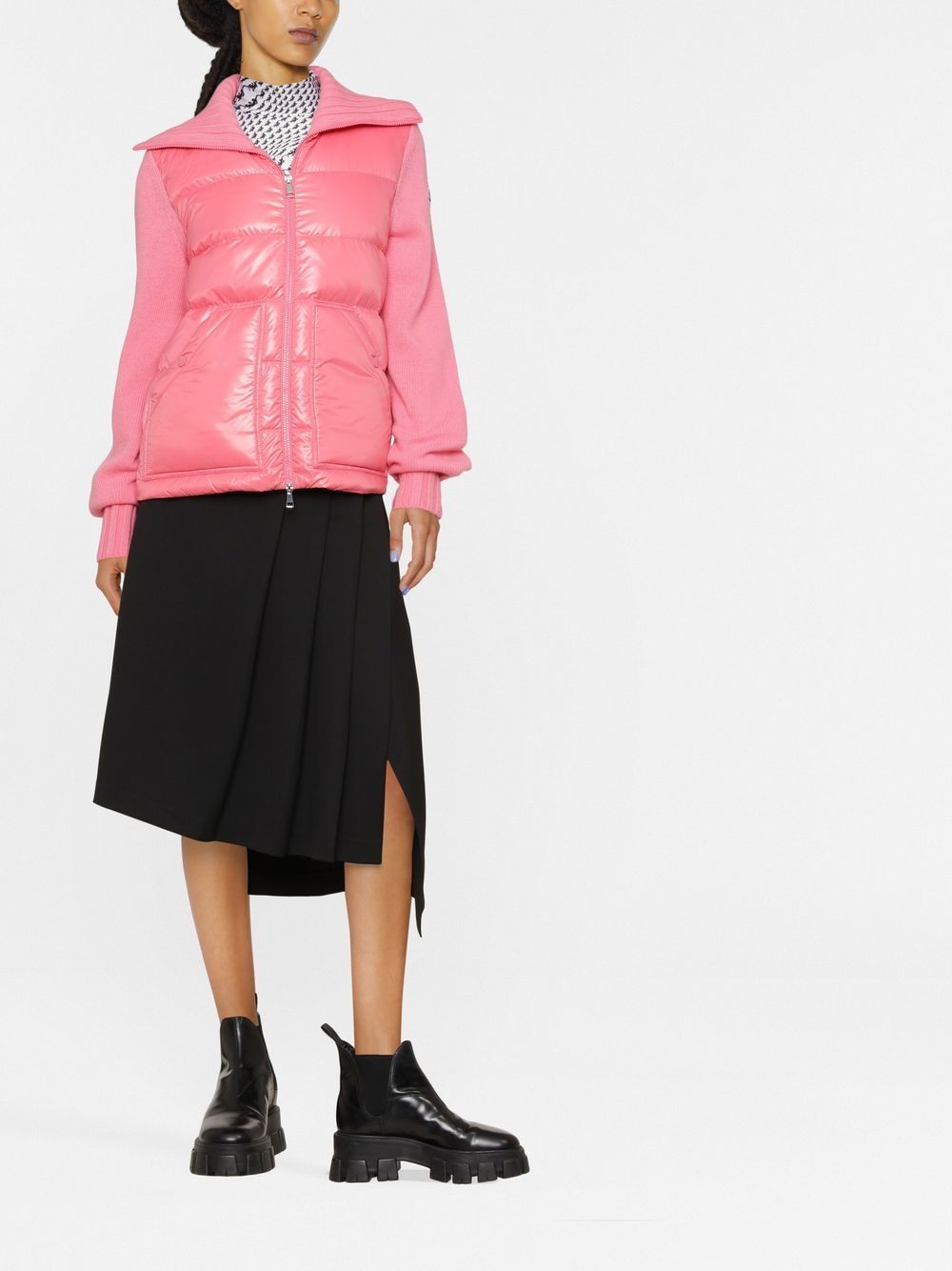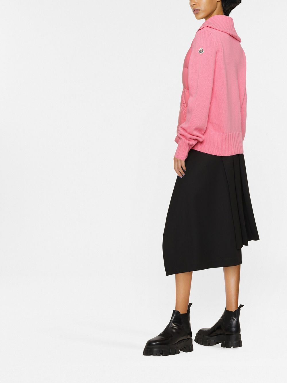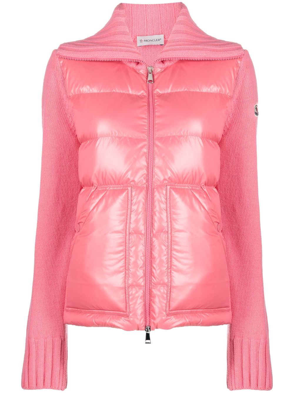 Known for their padded down jackets, Italian fashion house Moncler was founded in 1952 and started life creating quilted sleeping bags and tents. Presented in a rose-pink hue, this wool cardigan is detailed with feather-down padded front panel and the label's signature logo patch to the outer left sleeve.