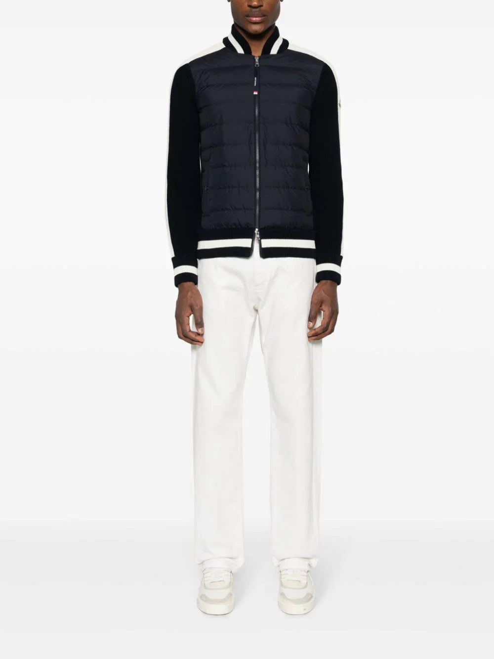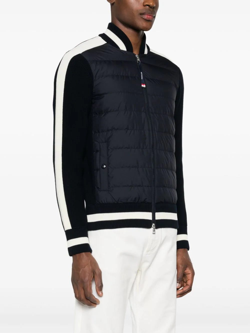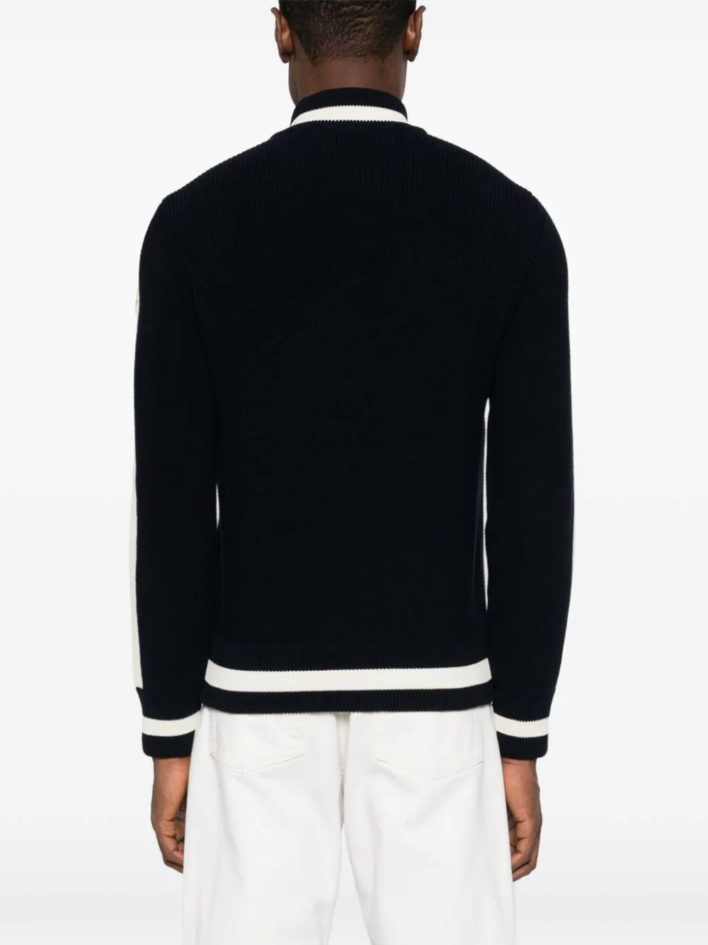 Contrasting stripes decorate the collar, sleeves and hem of this cardigan from Moncler, nodding to a tennis theme. Crafted from cotton in mid-weight knit, the style boasts a down-filled front for warmth.