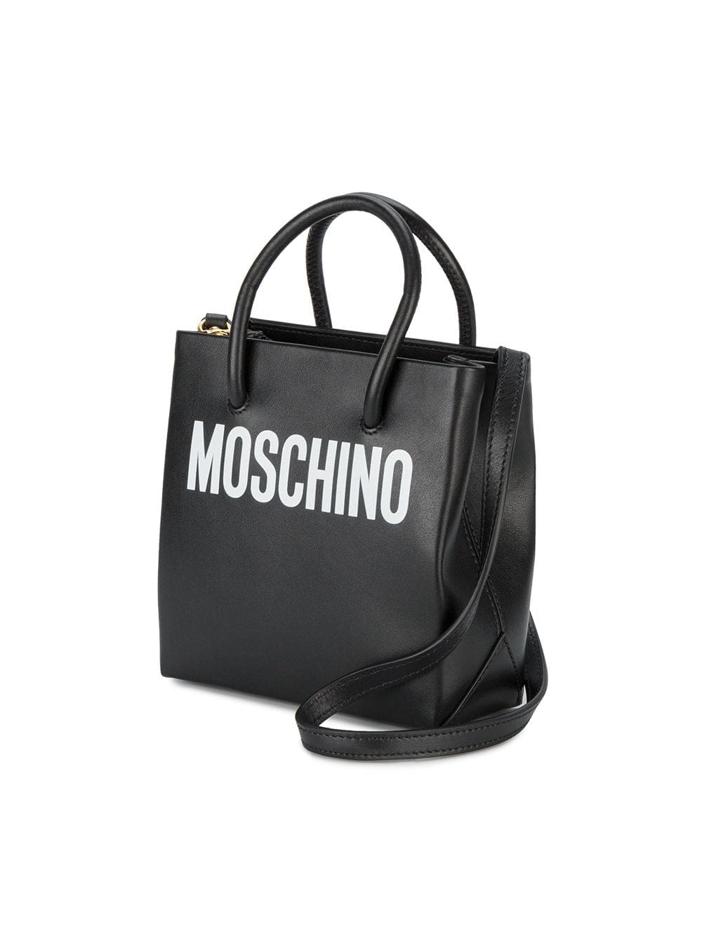 Black leather Black logo print leather tote bag from Moschino featuring top handles, a main internal compartment, a printed logo and a cross body strap.