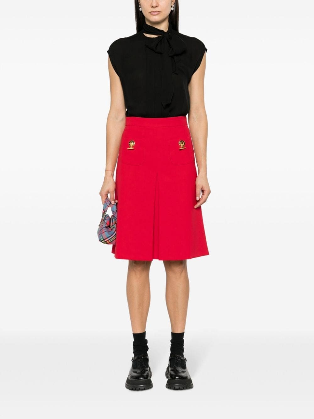 Moschino briefly steps away from its whimsical aesthetic and takes a rather elegant route with this silk blouse. It offers a contemporary look with an oversized bow fastening at the collar and a discreet black hue.