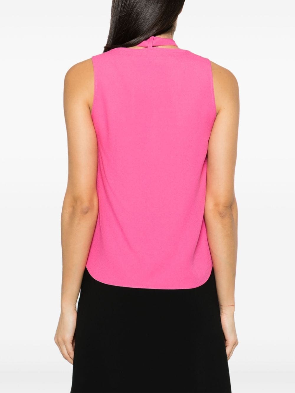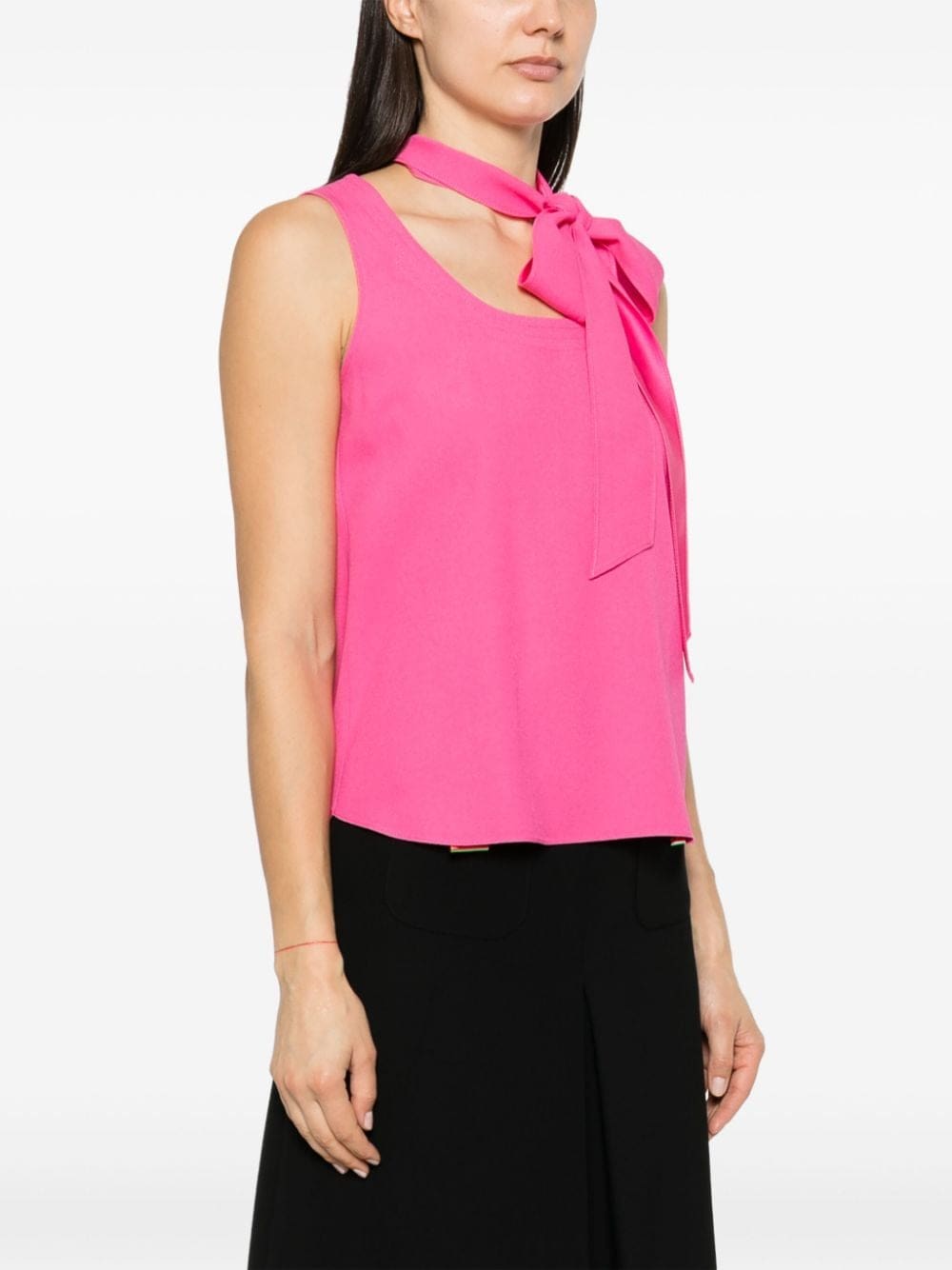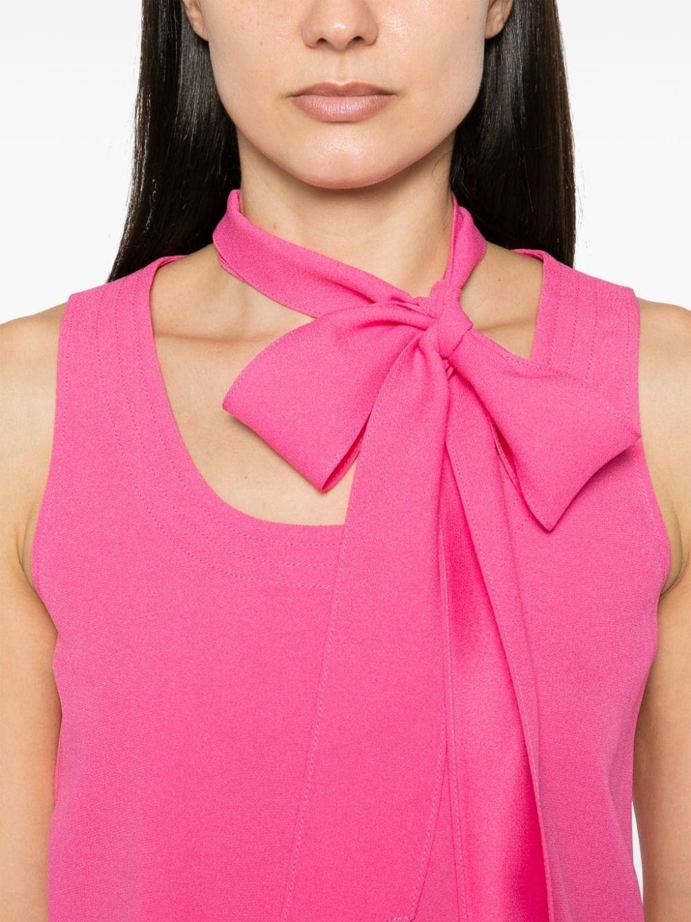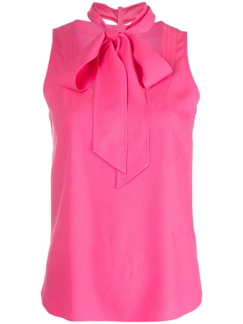 Moschino briefly steps away from its whimsical aesthetic and takes a rather elegant route with this sleeveless blouse. It offers a contemporary look with an oversized bow fastening at the collar and a vibrant fuchsia pink hue.