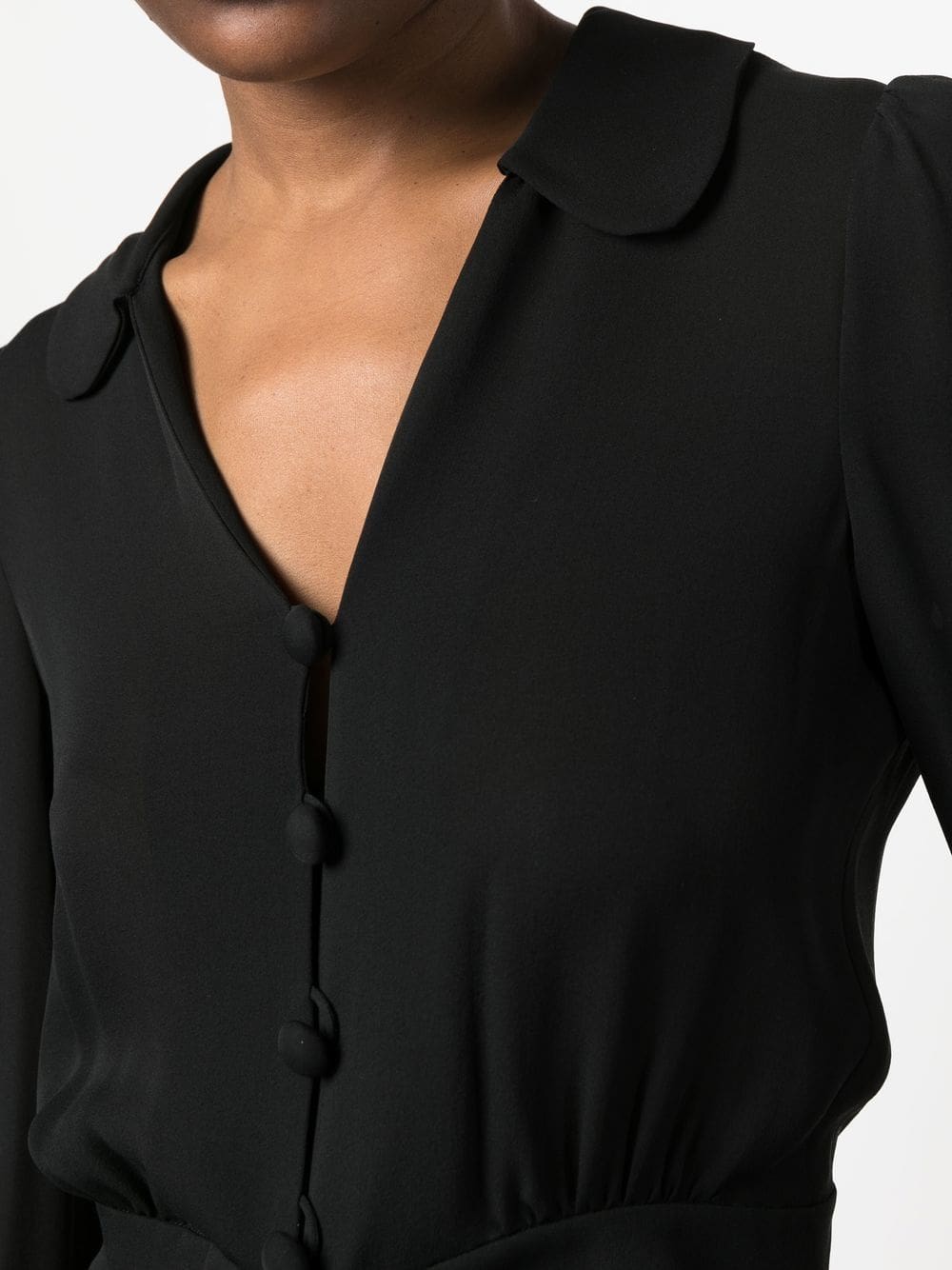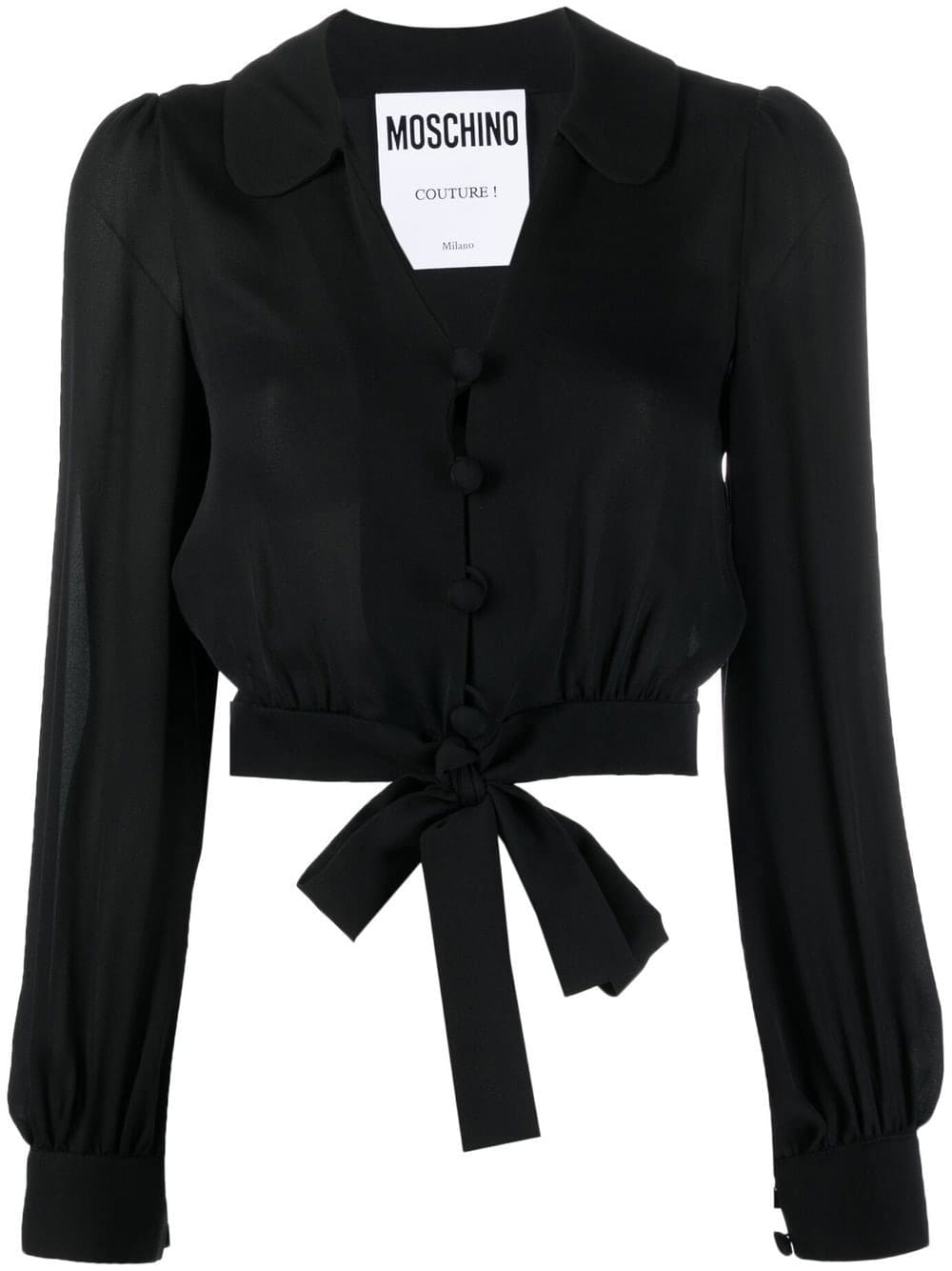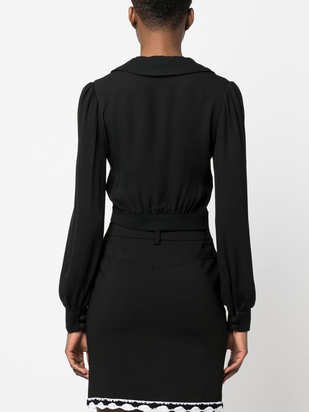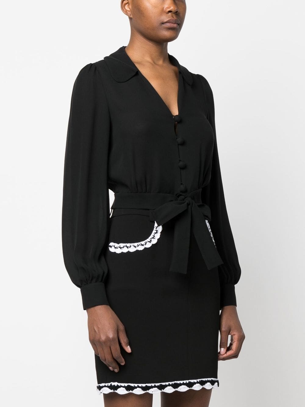 black silk bib collar front button fastening tied waist V-neck long sleeves cropped