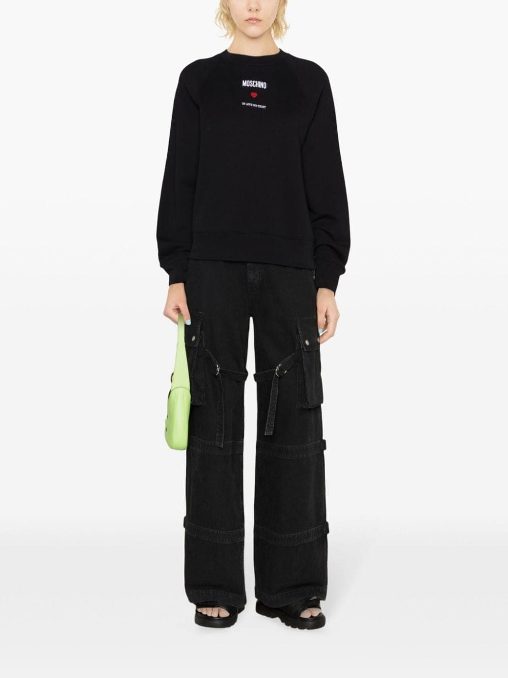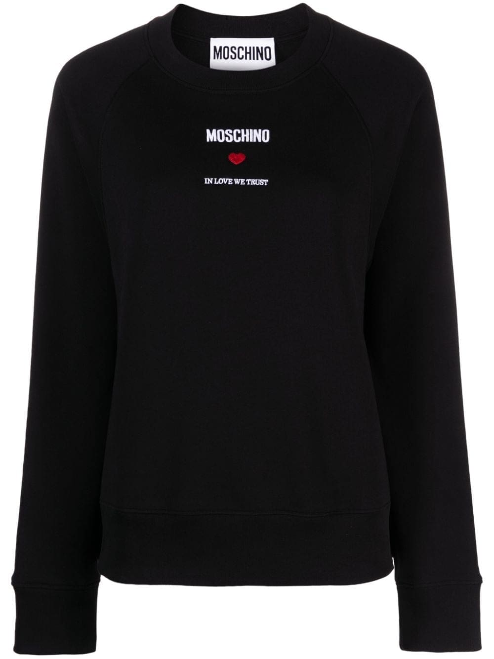 Moschino's penchant for playful motifs is evidenced by this cotton sweatshirt. It arrives in a jet-black hue and plays host to an embroidered heart motif alongside logo lettering and a slogan that reads, "IN LOVE WE TRUST".