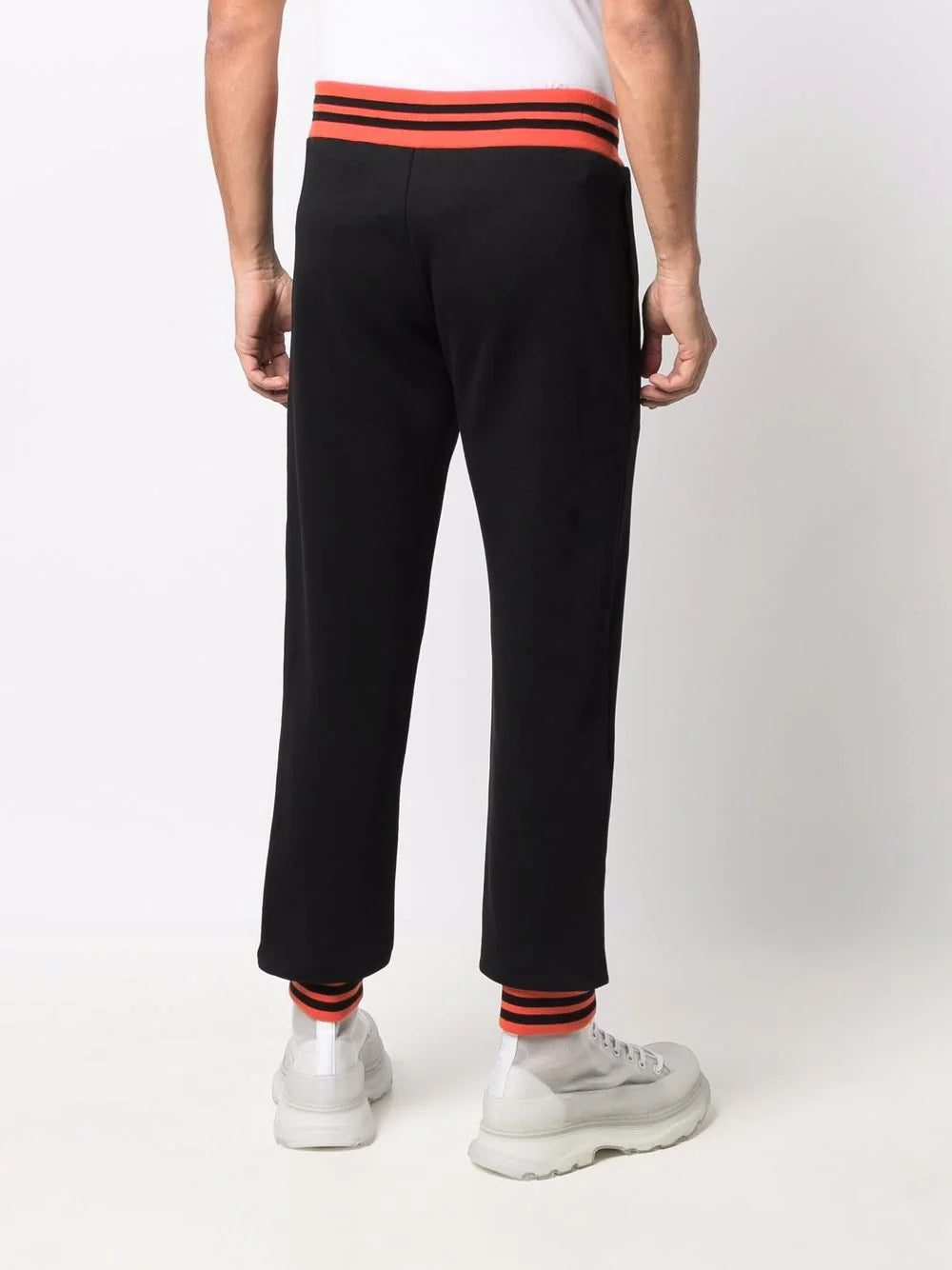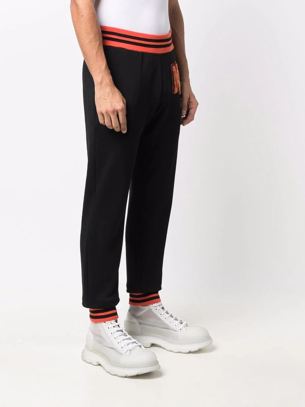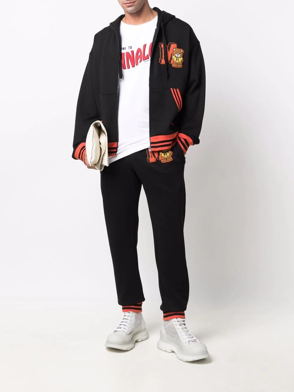 Black/orange organic cotton flocked bear logo trackpants from MOSCHINO featuring flocked logo, bear motif, ribbed detailing, stripe trim, elasticated waistband, two side slash pockets and elasticated cuffs. POSITIVELY CONSCIOUS: This Planet Conscious product is made from at least 50% organic materials, which helps you support organic farming practices such as the restricted use of synthetic chemicals and genetically modified seeds, improved soil fertility and better livestock management..