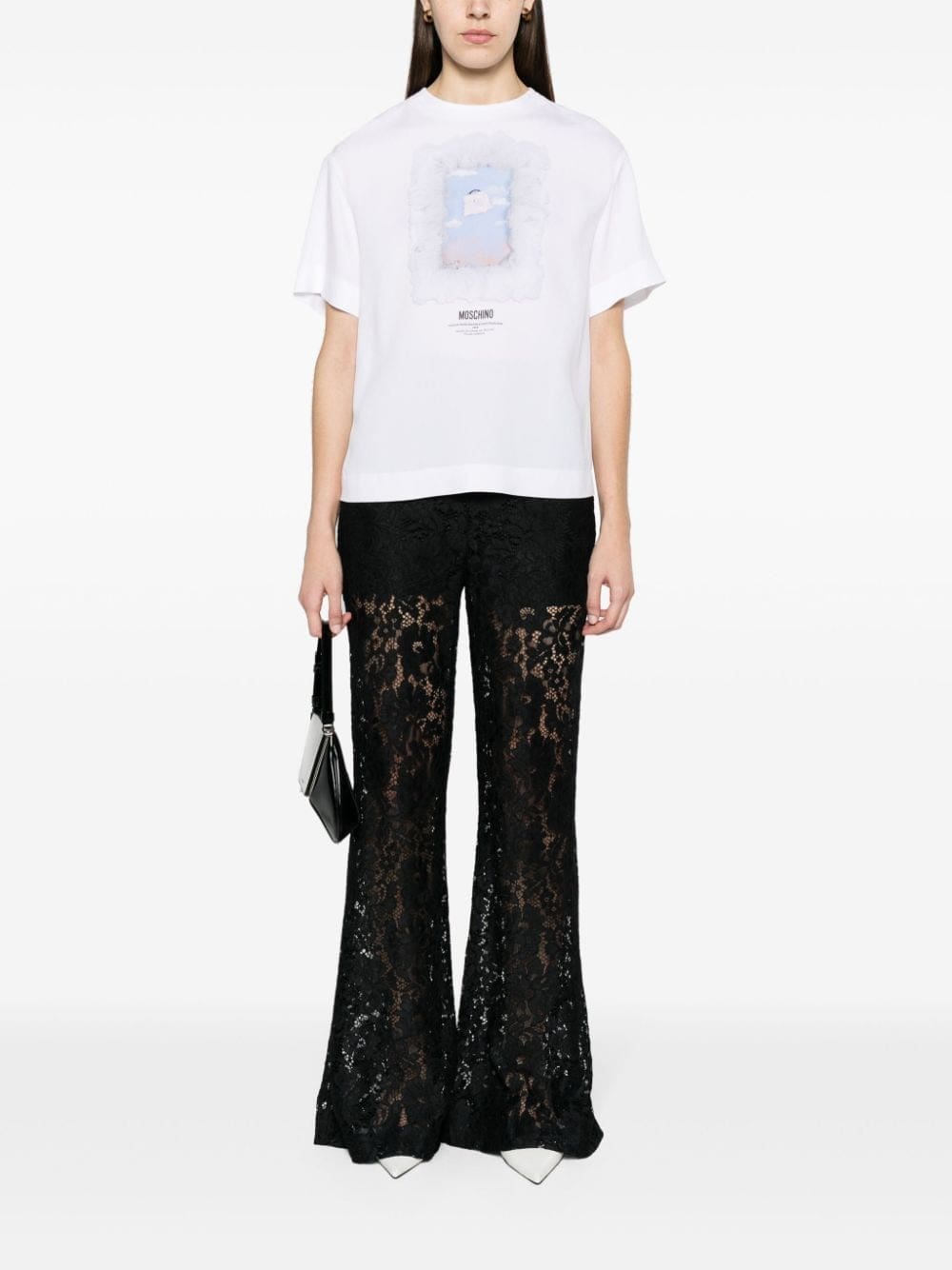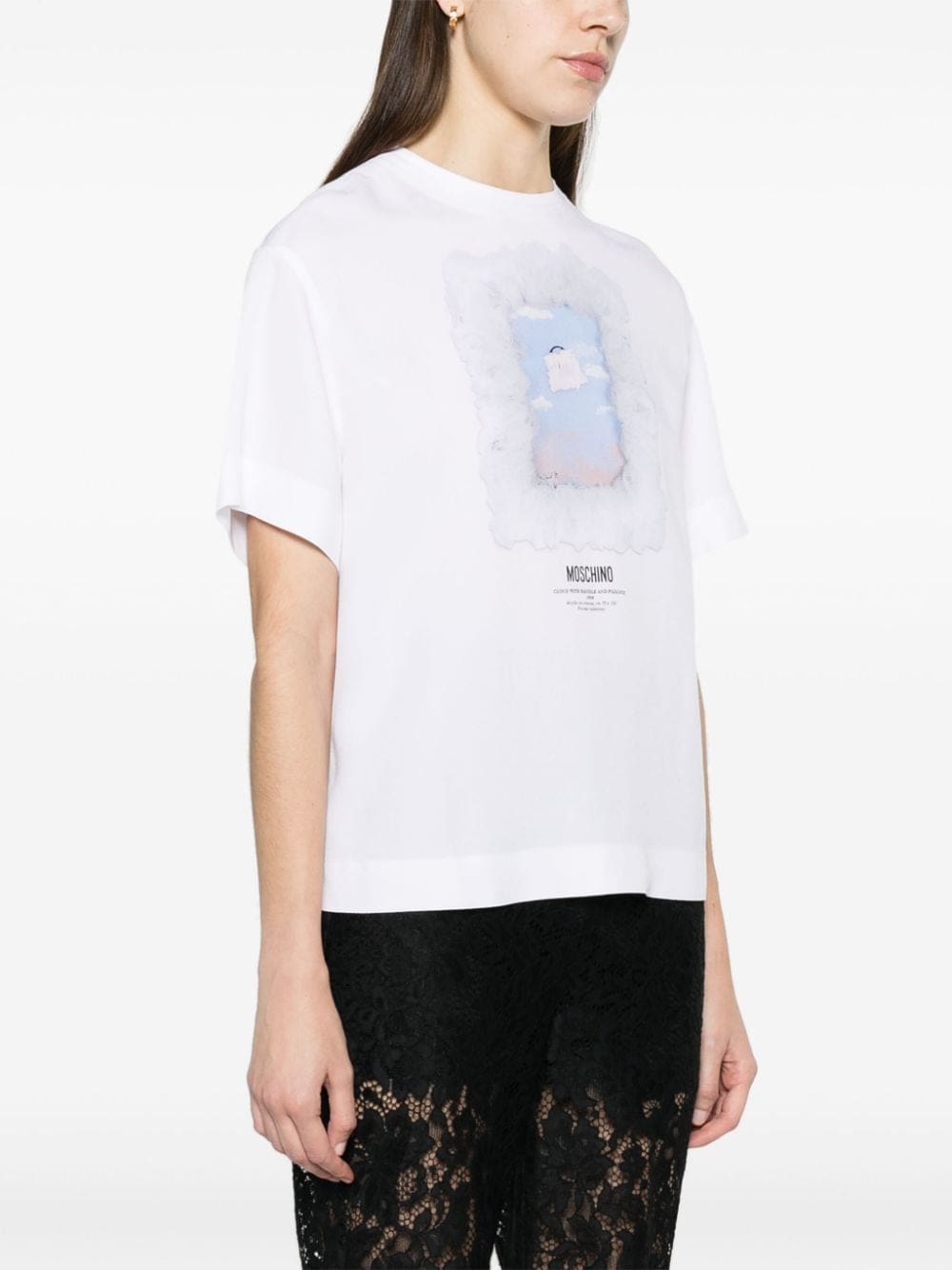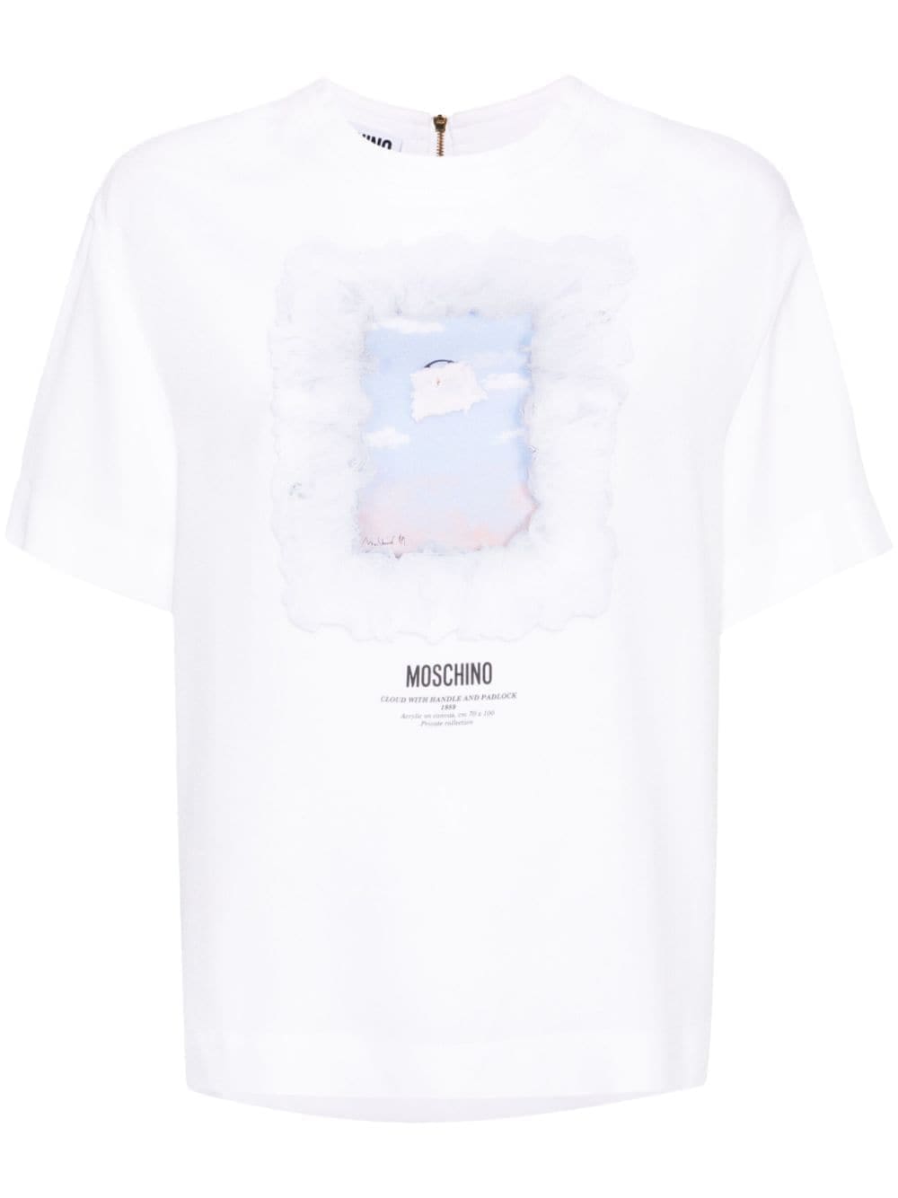 Decorated with an acrylic painting print, this white T-shirt by Moschino is designed for a relaxed fit. A gold-tone zip fastening adorns the rear.