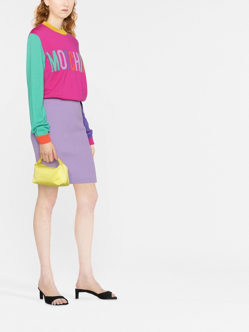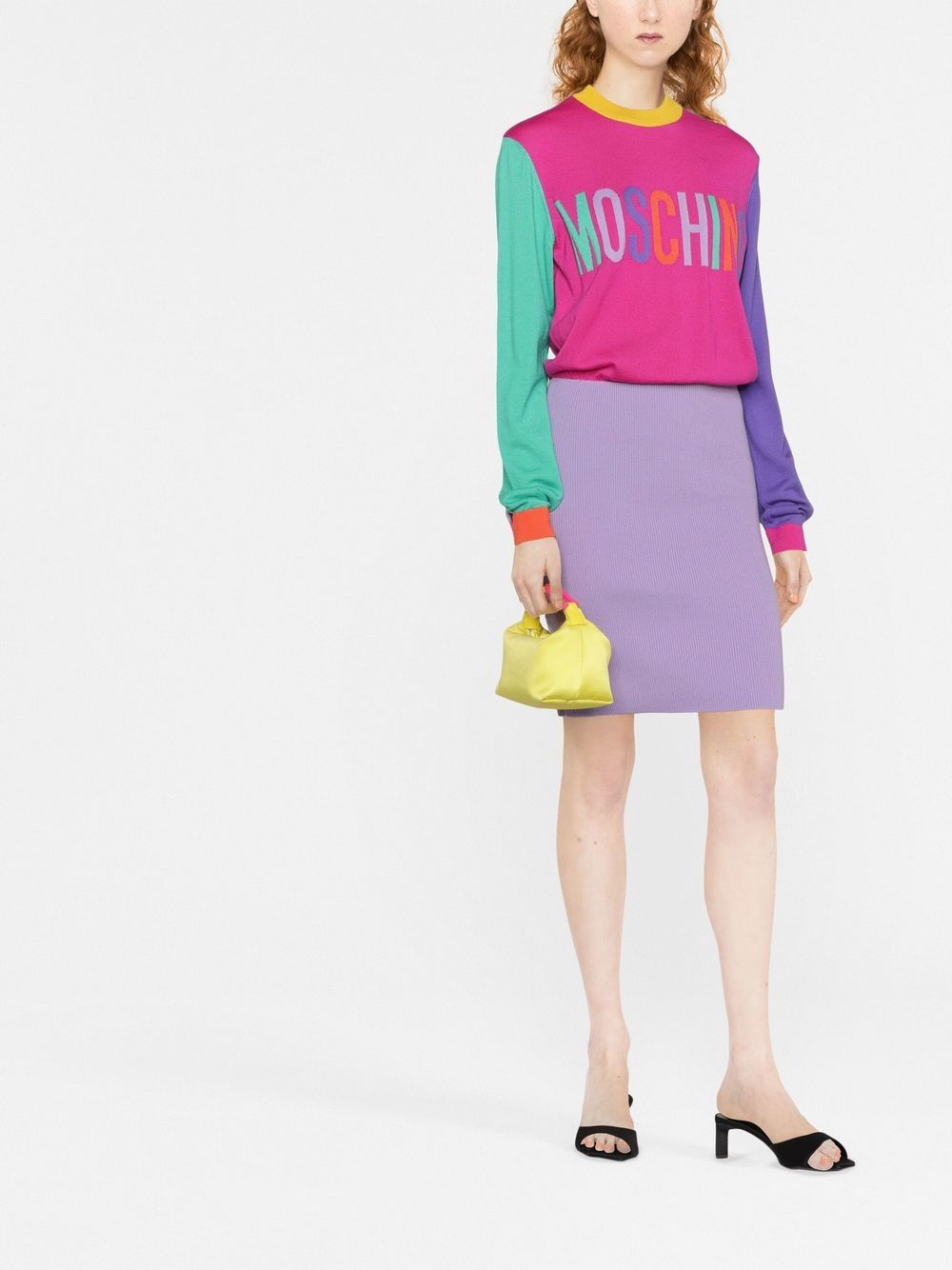 multicolour virgin wool intarsia knit colour-block panelled design logo patch at the chest crew neck long sleeves ribbed cuffs ribbed edge straight hem