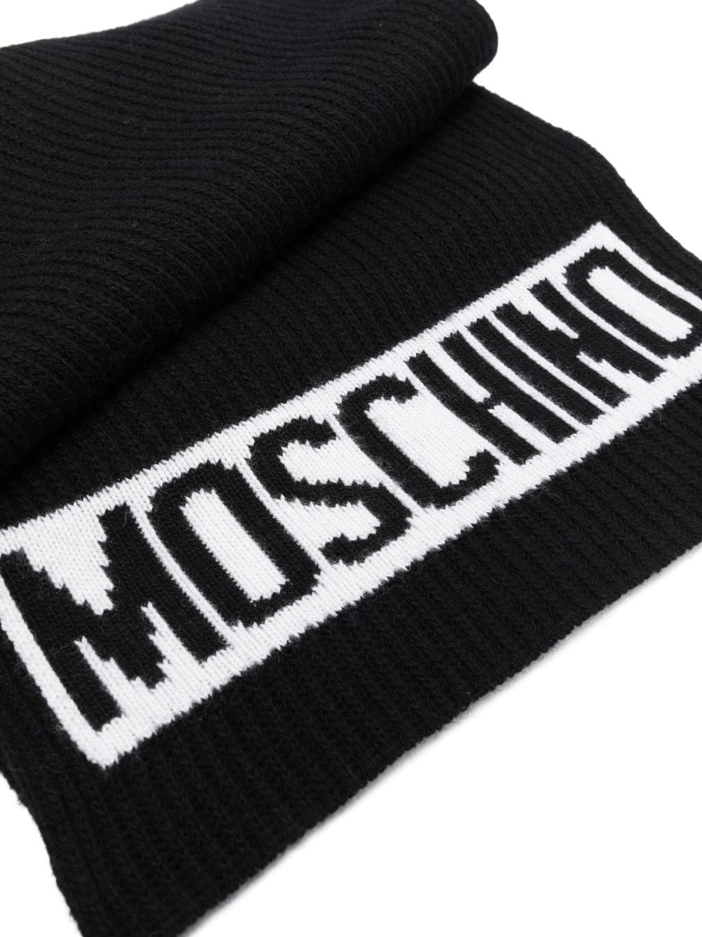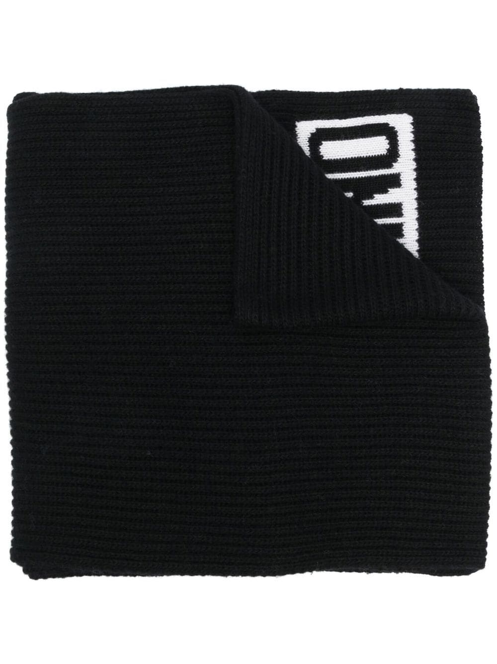 intarsia-logo knit scarf from MOSCHINO featuring black/white, knitted construction, ribbed knit, intarsia-knit logo and finished edge.