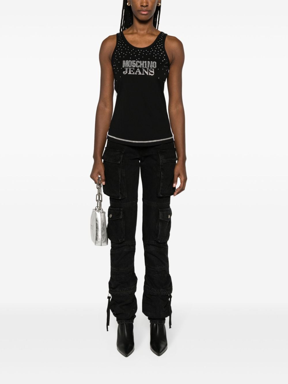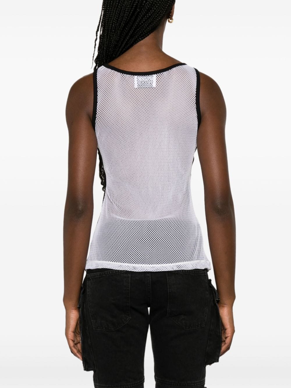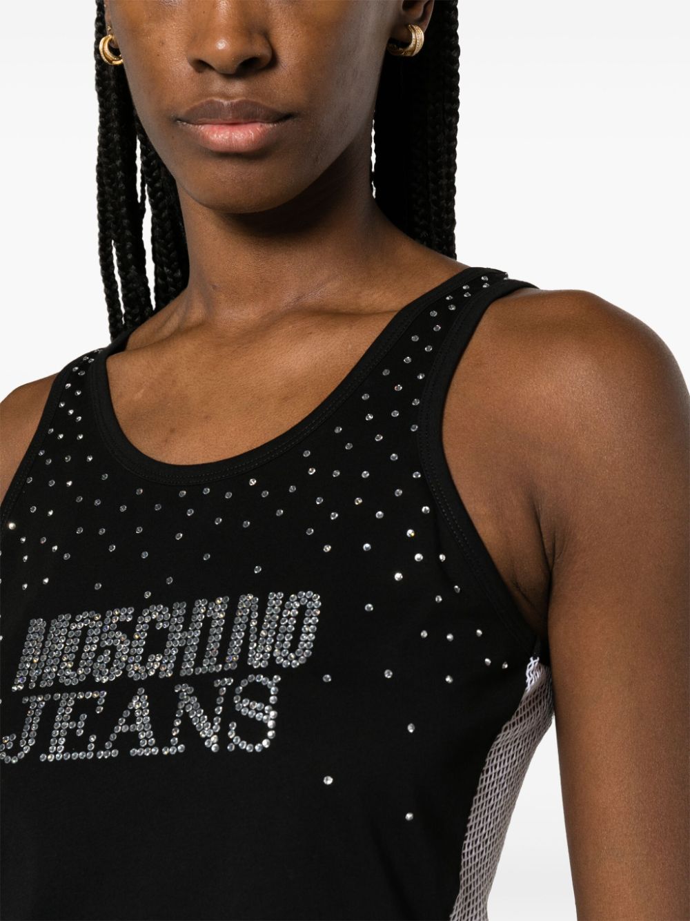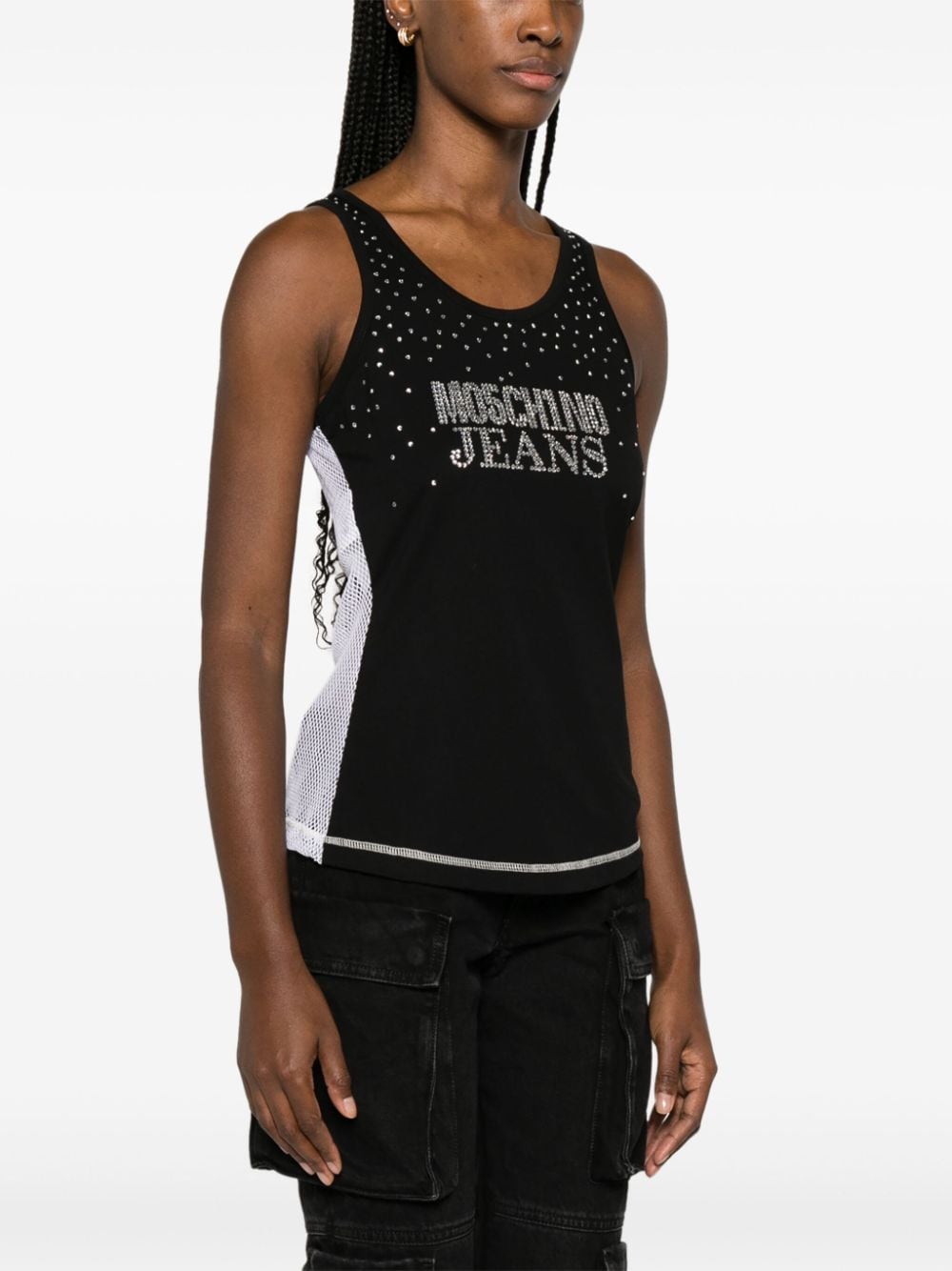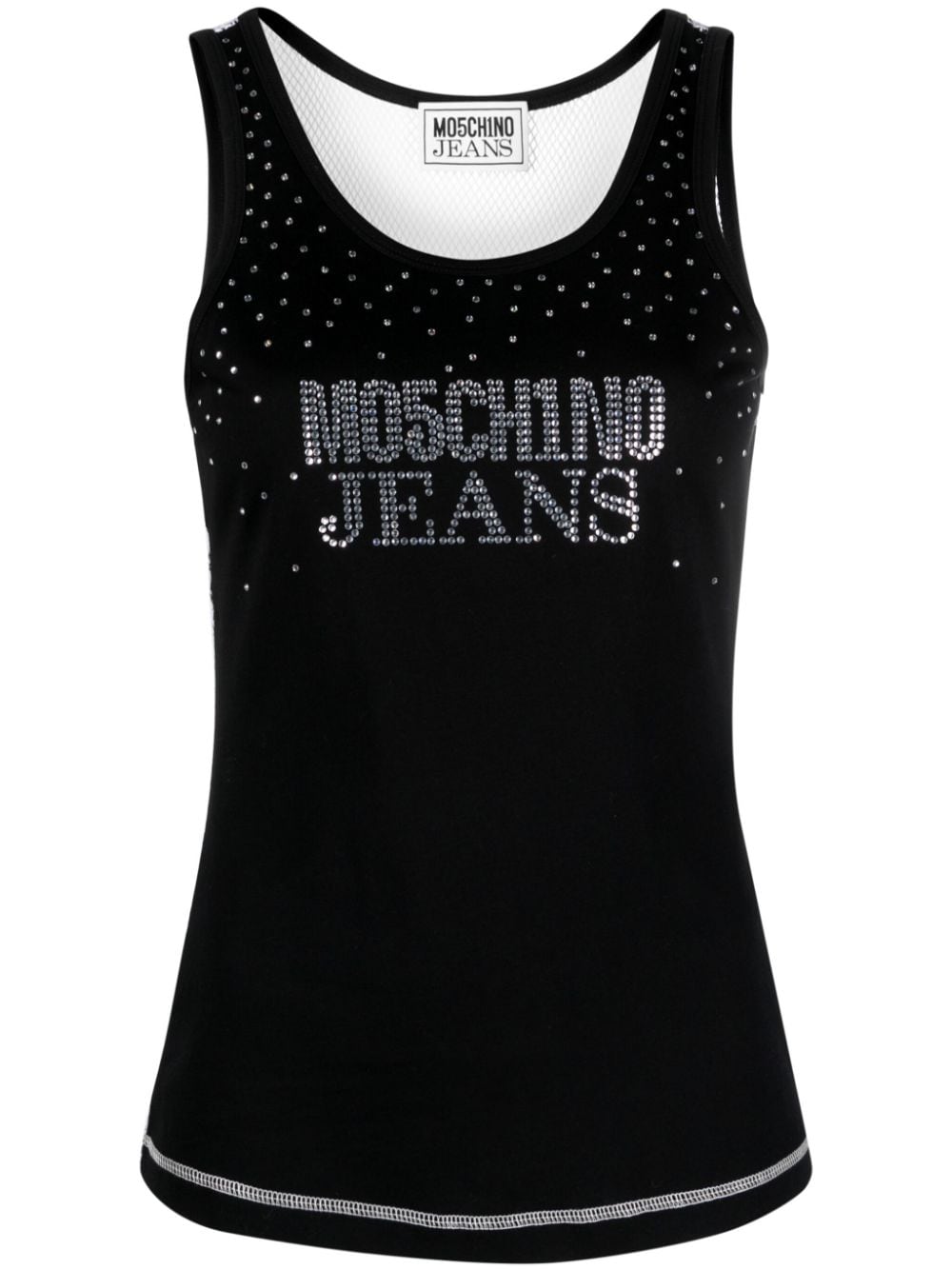 An ode to logomania, this tank top by MOSCHINO JEANS is defined by its rhinestone-adorned logo on the front. It's crafted in Portugal from black cotton with a contrasting white mesh back.