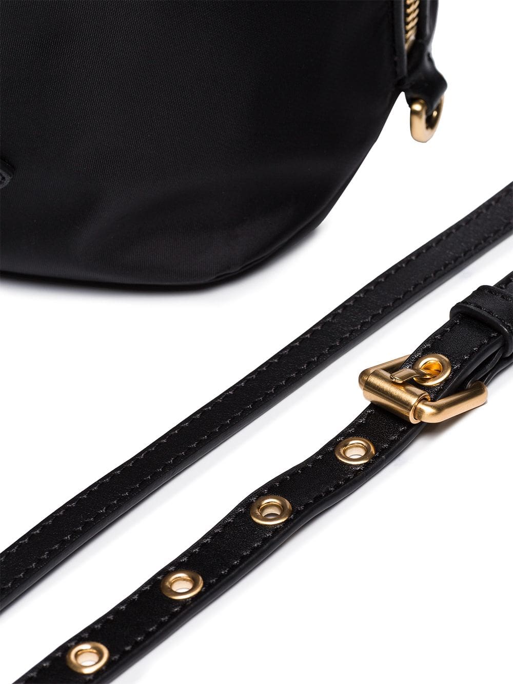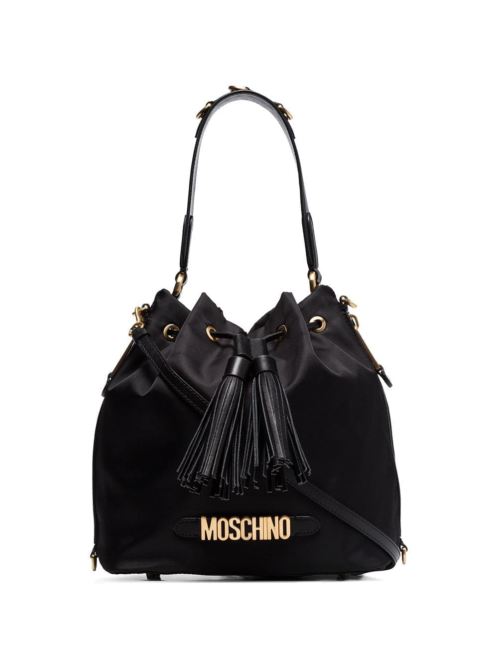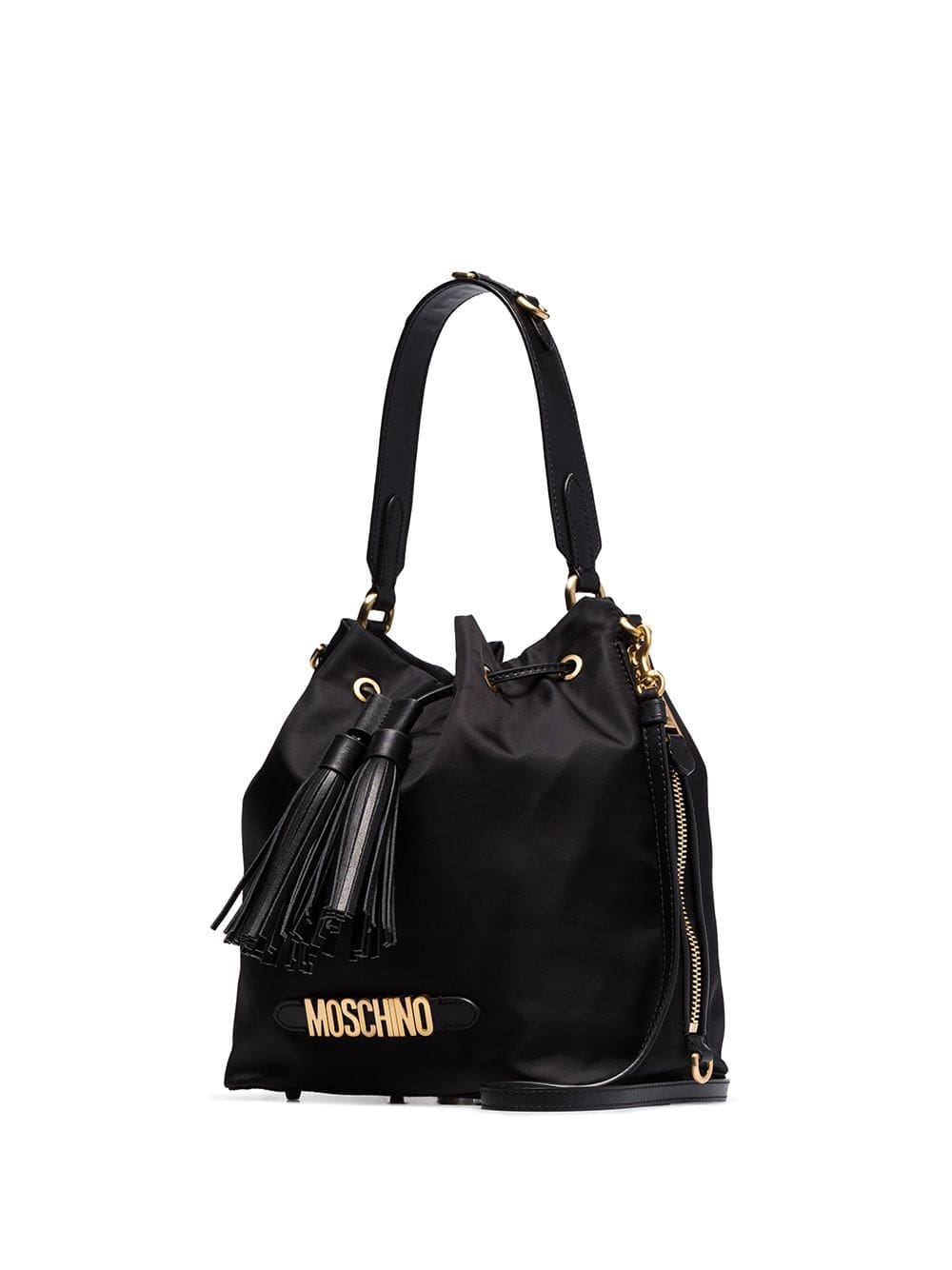 This Moschino logo plaque bucket bag boasts a technical construction with tonal leather trims. Fully lined, it’s characterised by its slouched shape and signature gold-tone logo lettering. Black Detachable and adjustable leather shoulder strap Single leather top handle Drawstring closure with tassel detail Two zip fastening side pockets Logo plaque to the front Brushed gold-tone hardware Metal feet at the base One main compartment with internal slip pocket