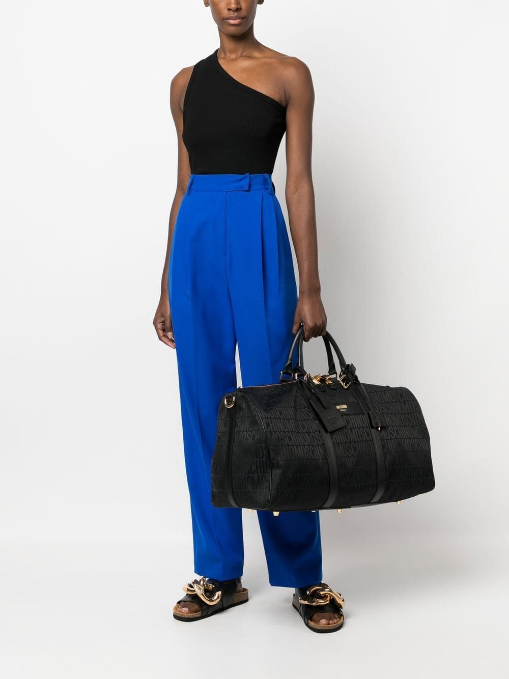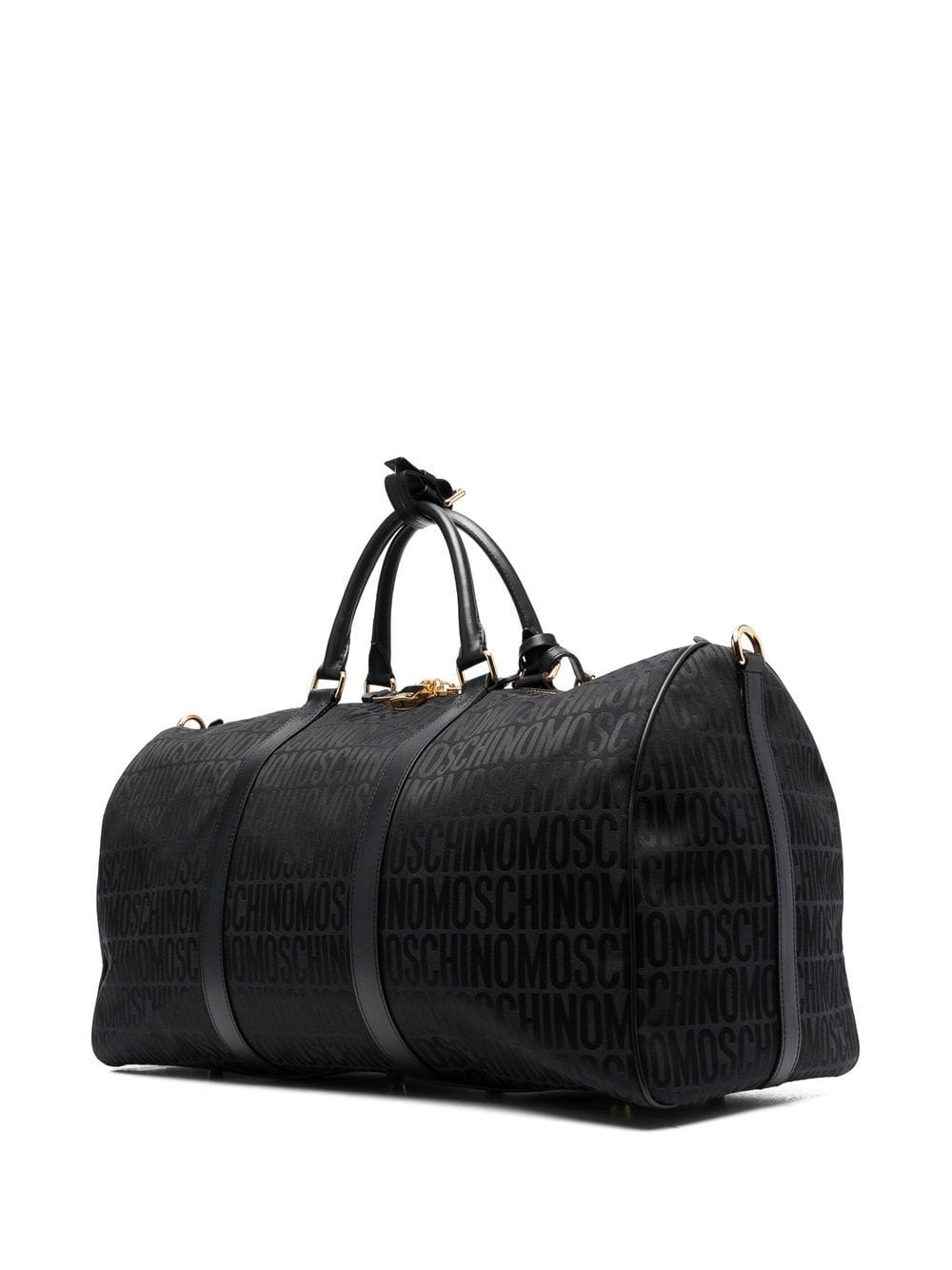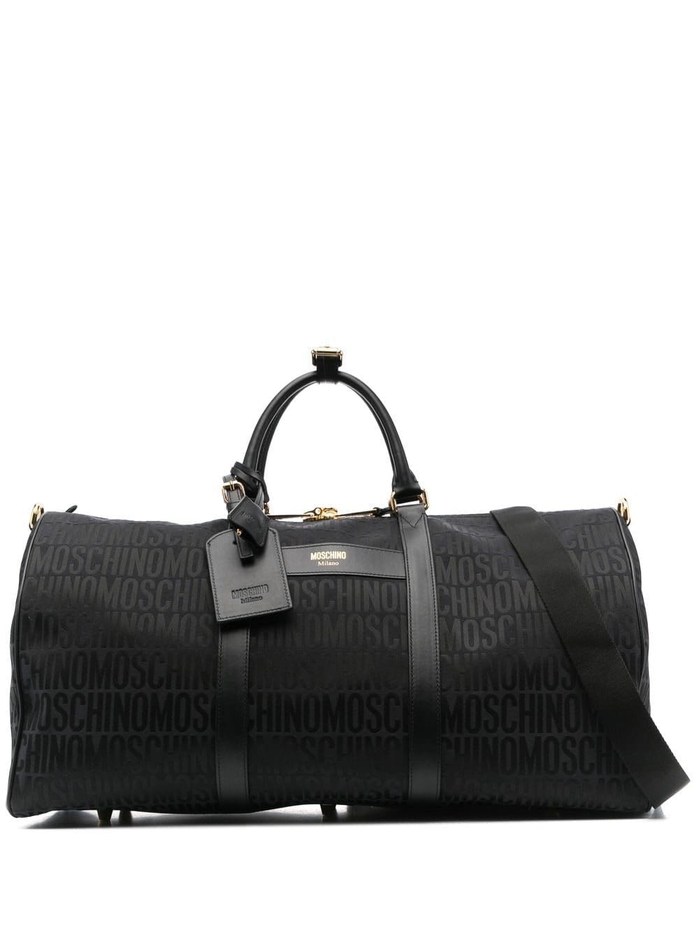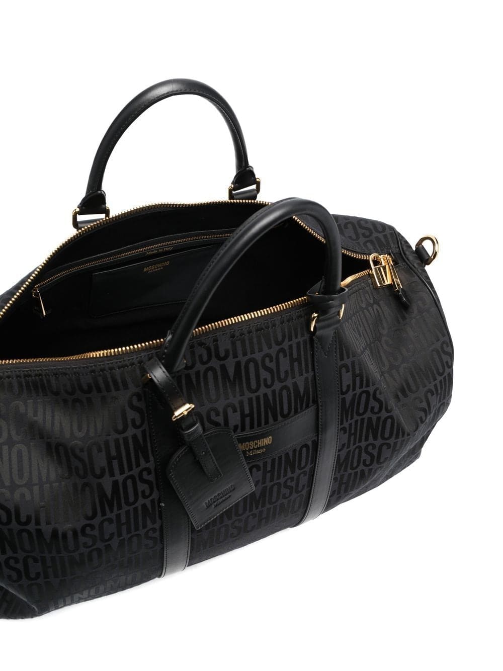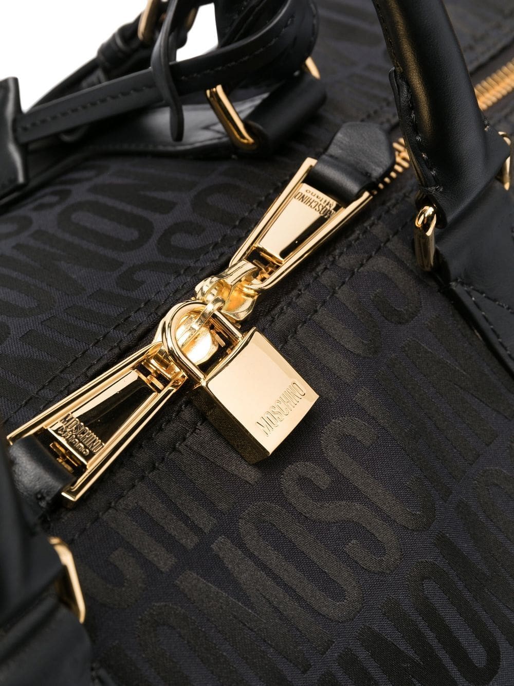 black leather trim logo tag all-over logo print two top handles top zip fastening main compartment