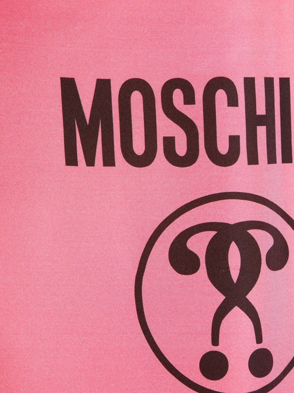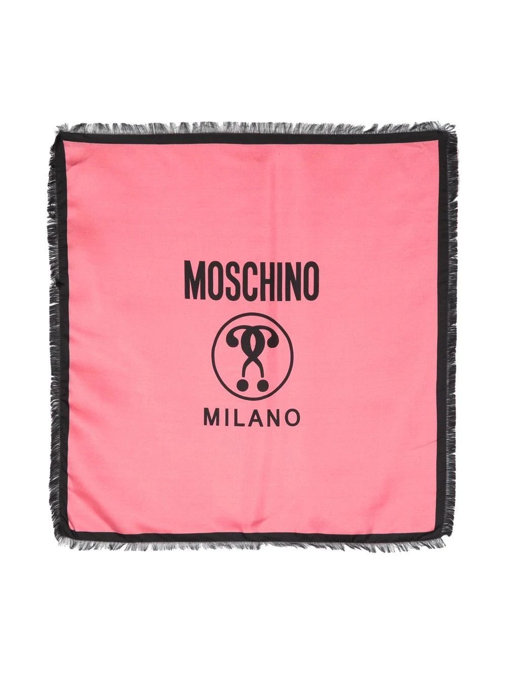 logo-print fringed silk foulard from MOSCHINO featuring pink, red, black, silk, signature Double Question Mark logo, fringed edge, solid border and square shape.