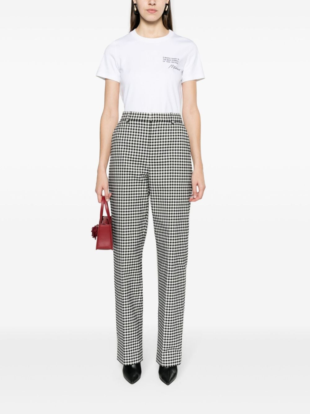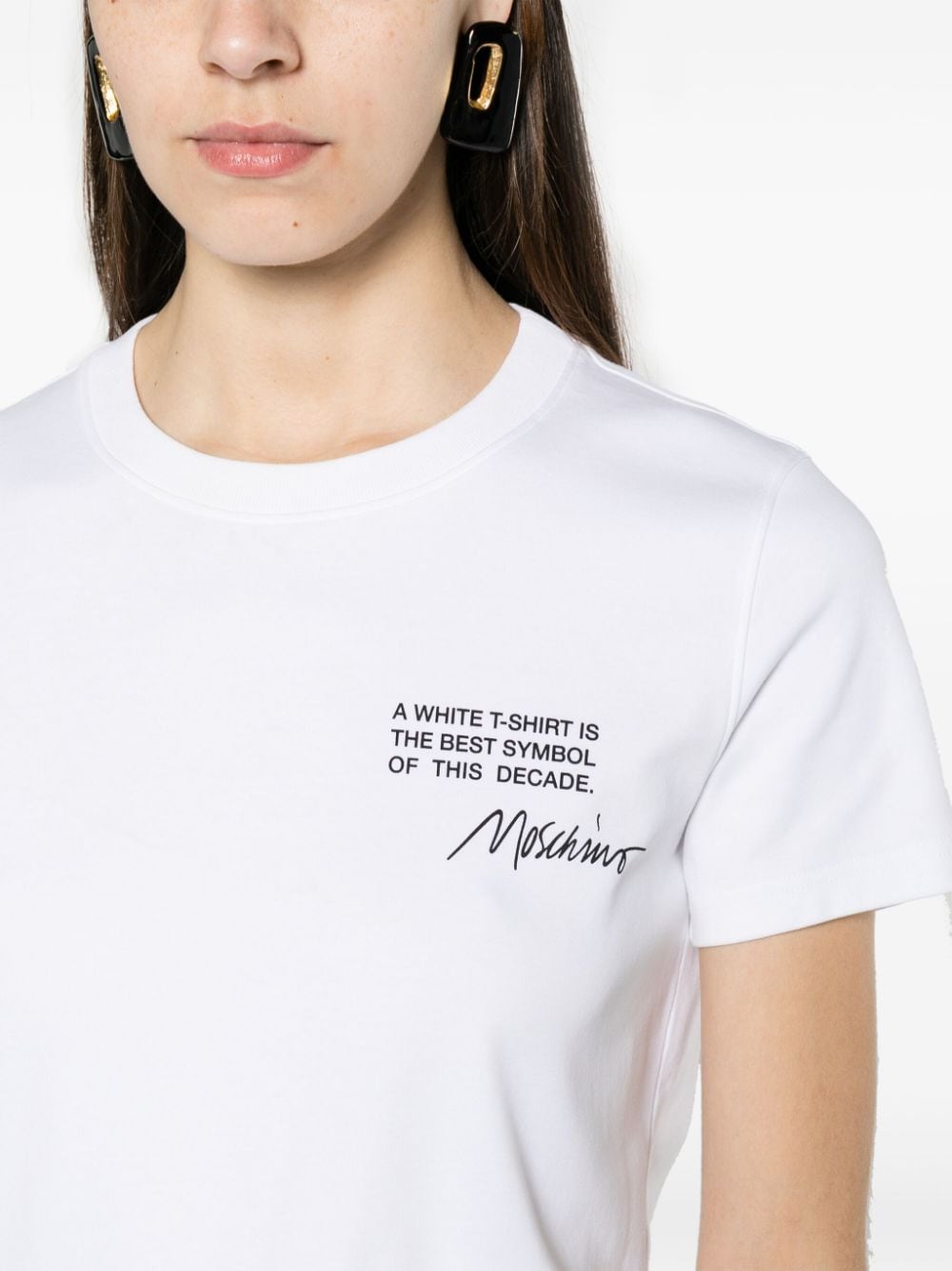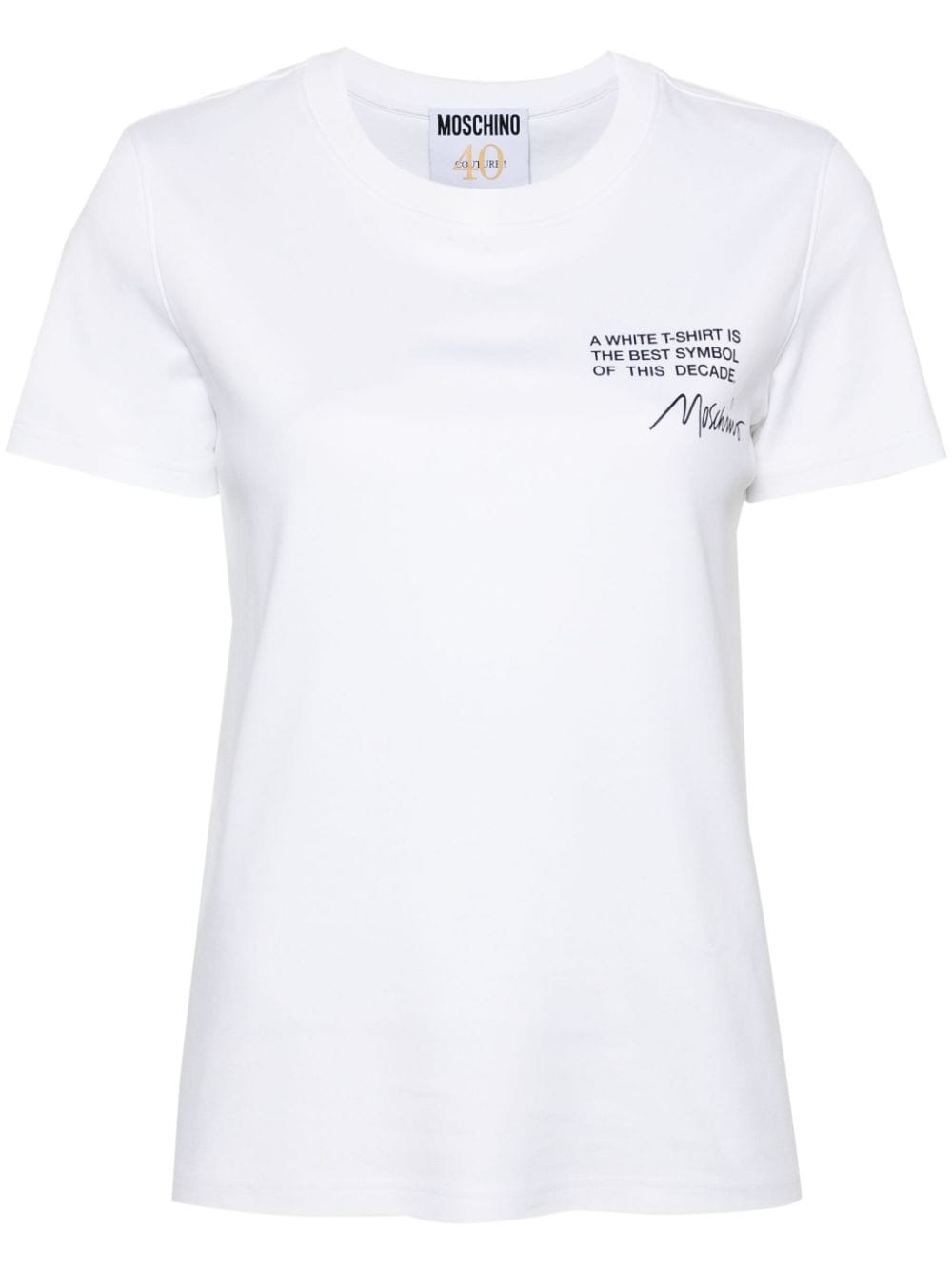 Cut from soft organic cotton, this classic white T-shirt by Moschino is designed for a slim fit. It's defined by a contrasting all-caps slogan and cursive logo script at the chest.