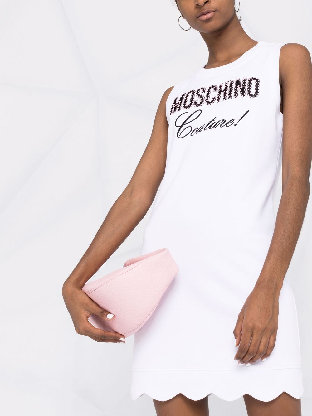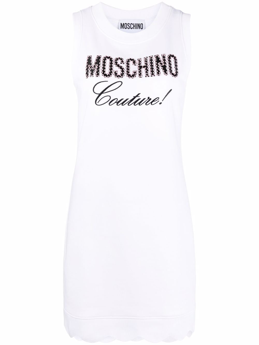 white cotton jersey knit logo print to the front crew neck sleeveless scallop hem