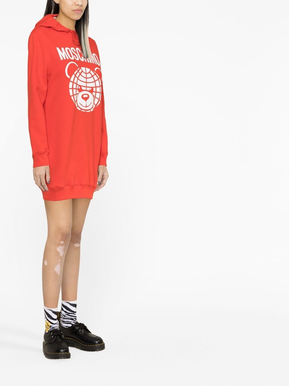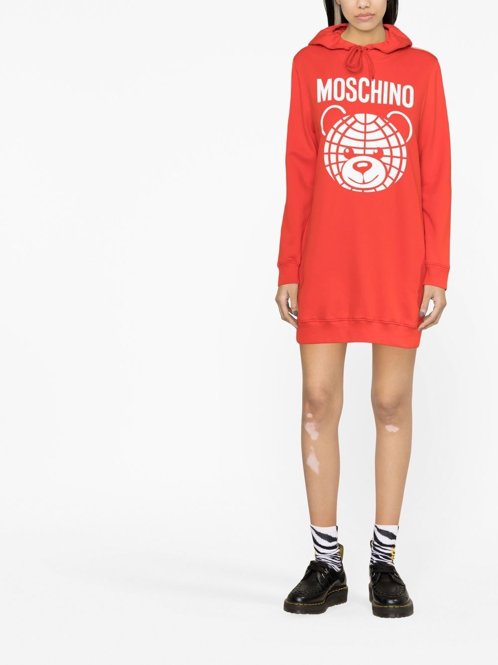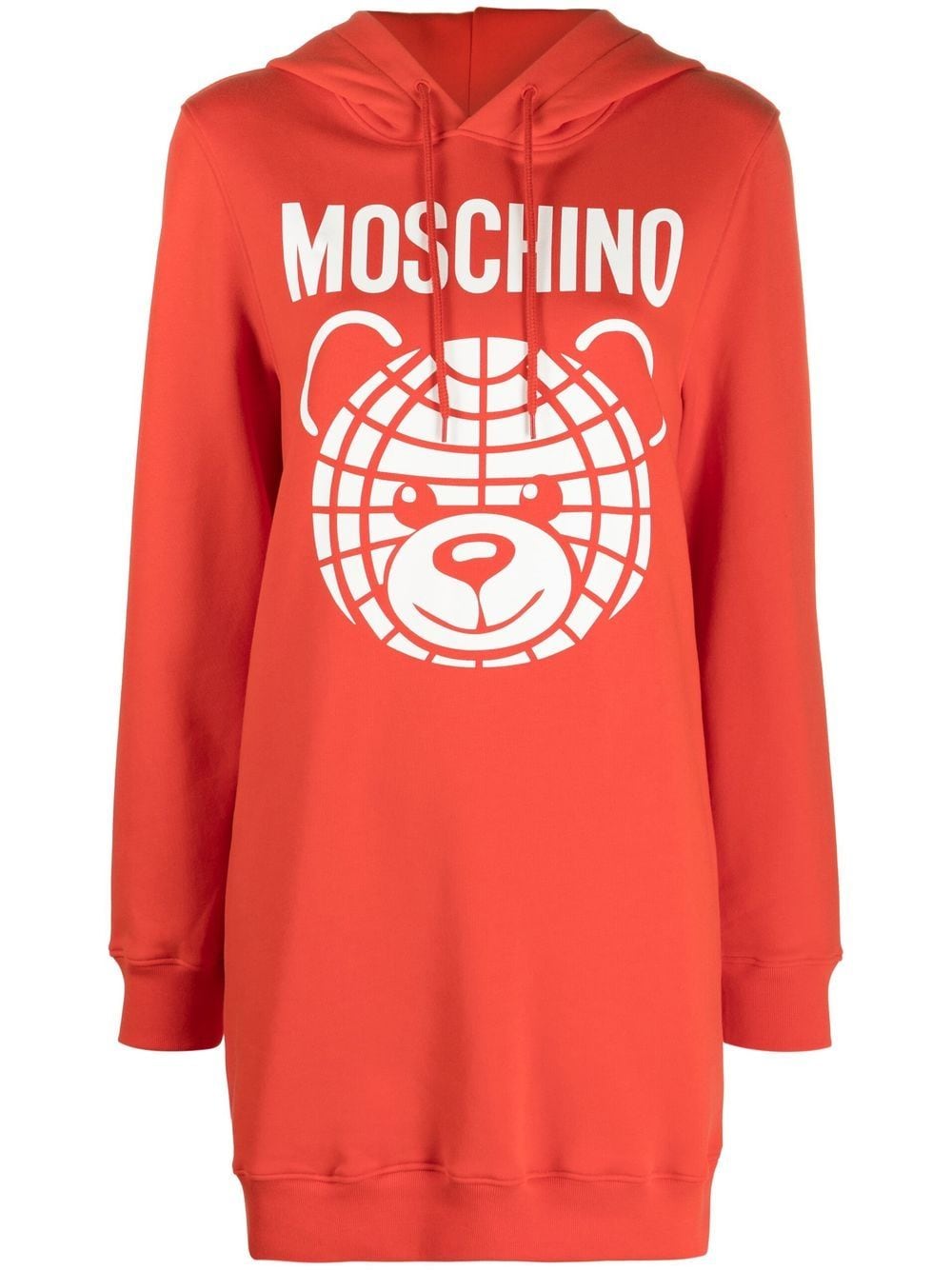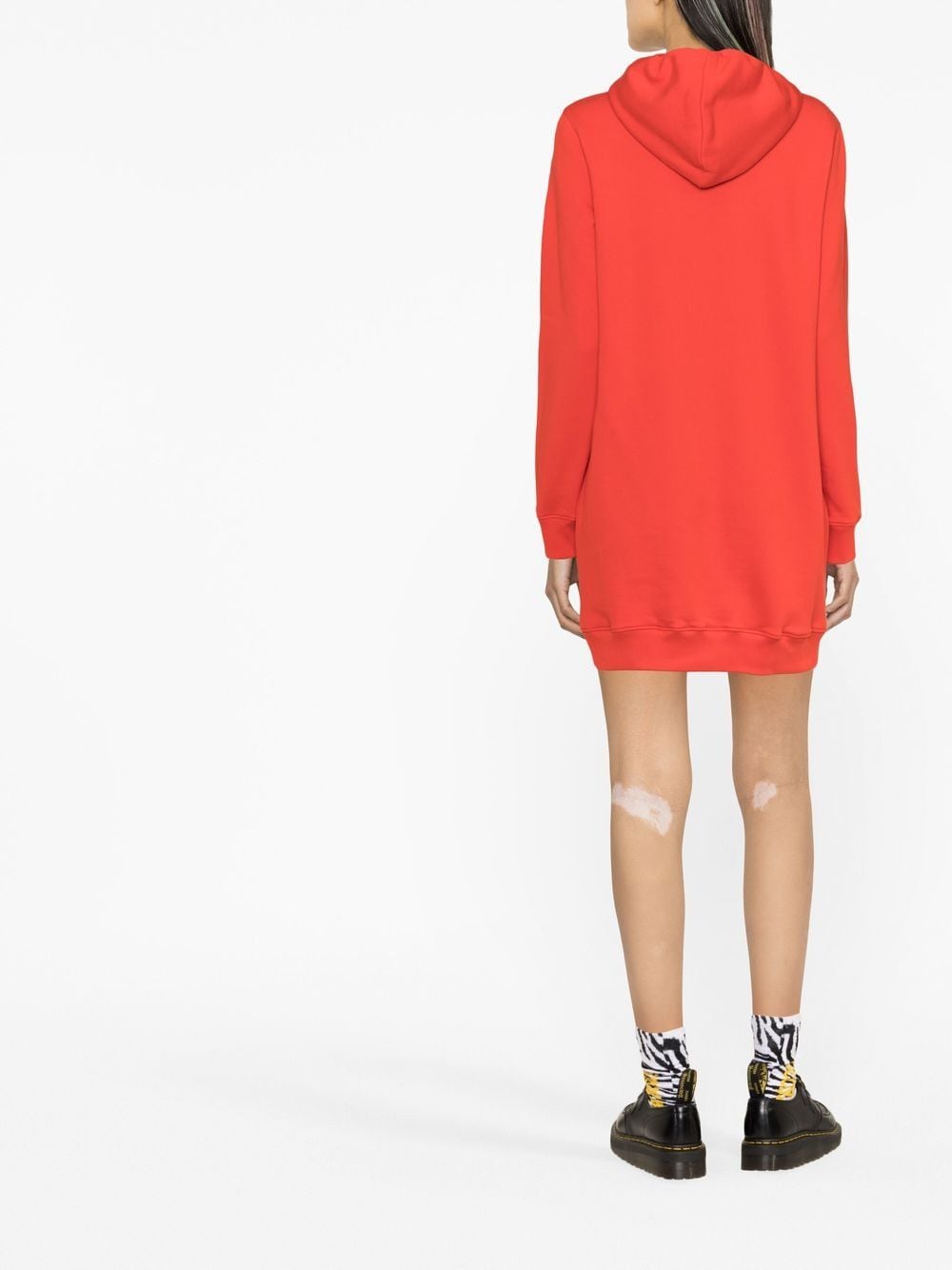 bright red cotton jersey knit ribbed trim logo print to the front drawstring hood long sleeves straight hem thigh-length