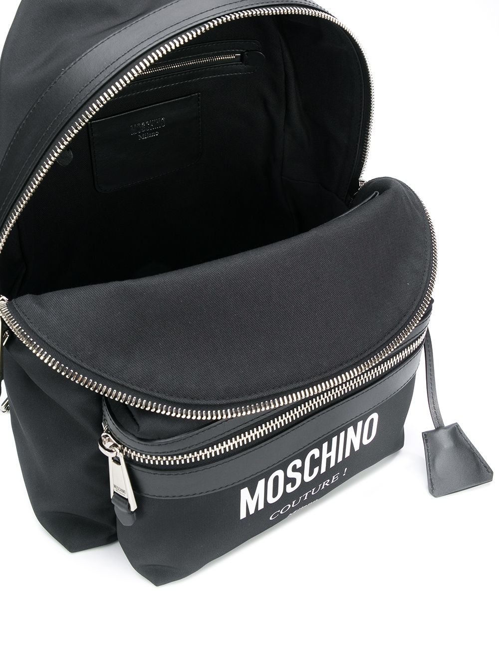 No more excuses to keep stuffing your jeans' pockets. Decorated with a white printed logo to the front, this black backpack from Moschino has enough space to let you carry your essentials around in the most comfortable (and stylish) way. Featuring a round top handle, adjustable shoulder straps with a tonal logo tape, a two-way zip fastening, a main internal compartment, an internal zipped pocket, an internal logo stamp, a front zip compartment, a hanging leather tag, leather trimming and silver-tone hardware.