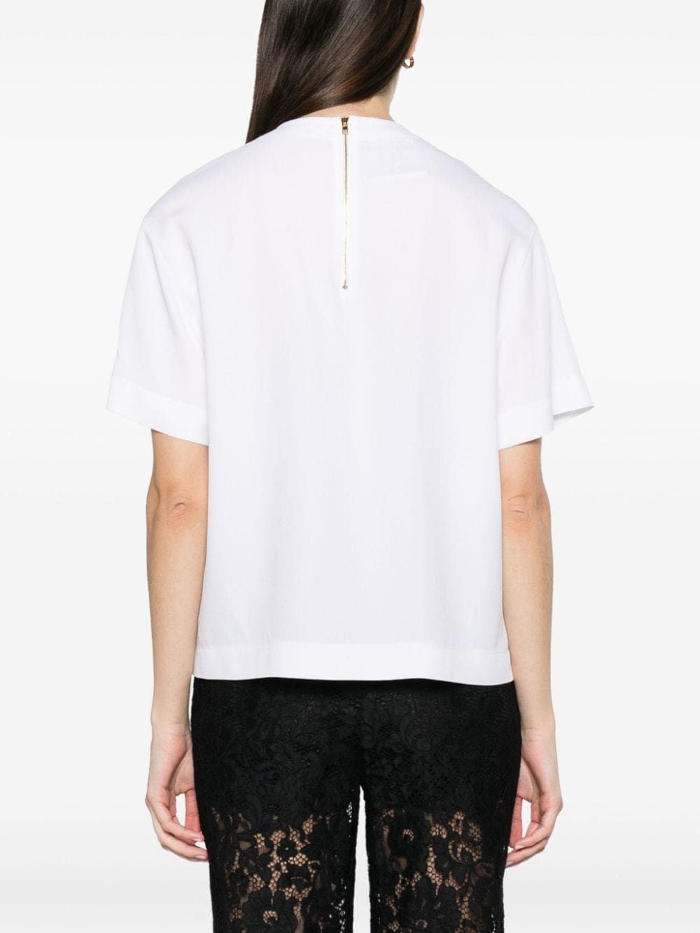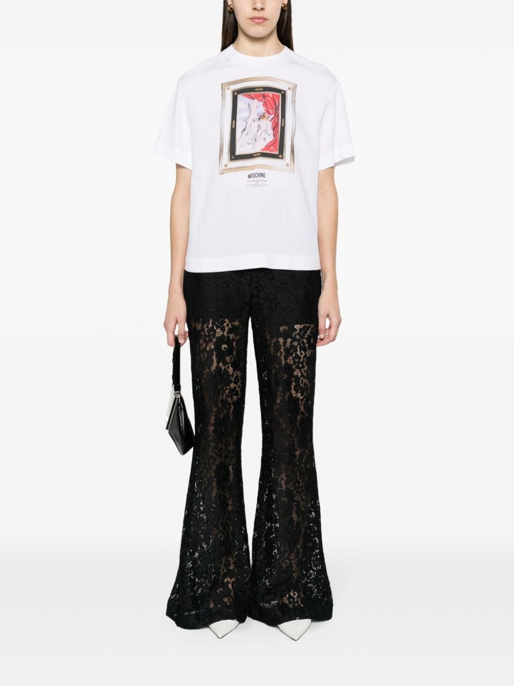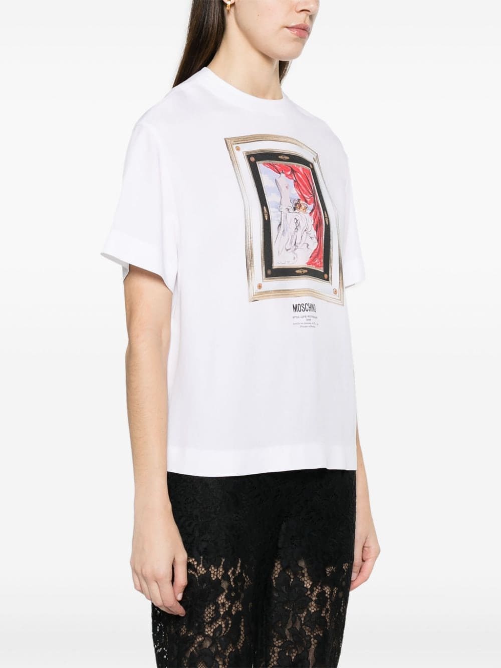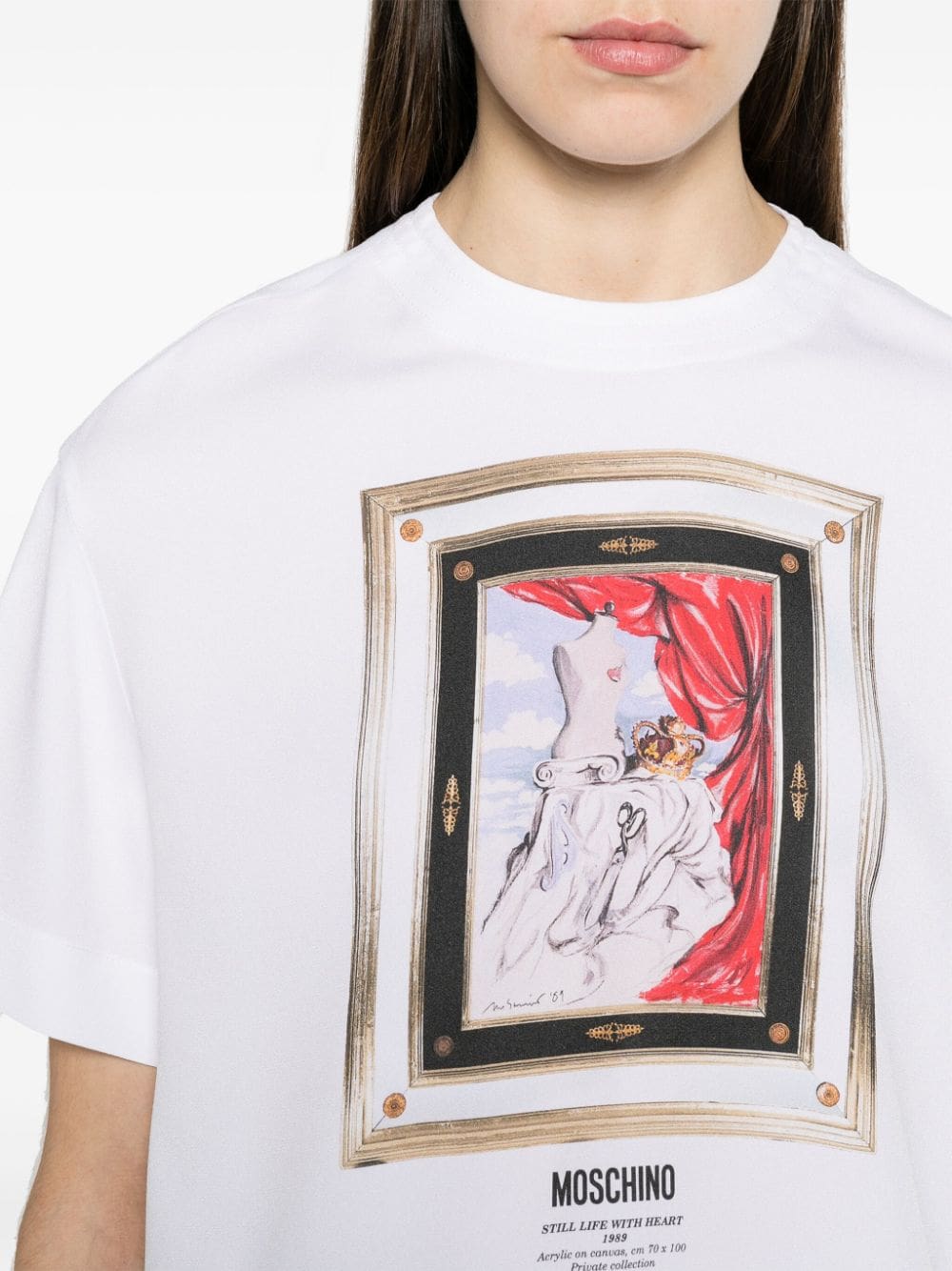 Decorated with an acrylic painting print named 'still life with heart', this white T-shirt by Moschino is designed for a relaxed fit. A gold-tone zip fastening adorns the rear.