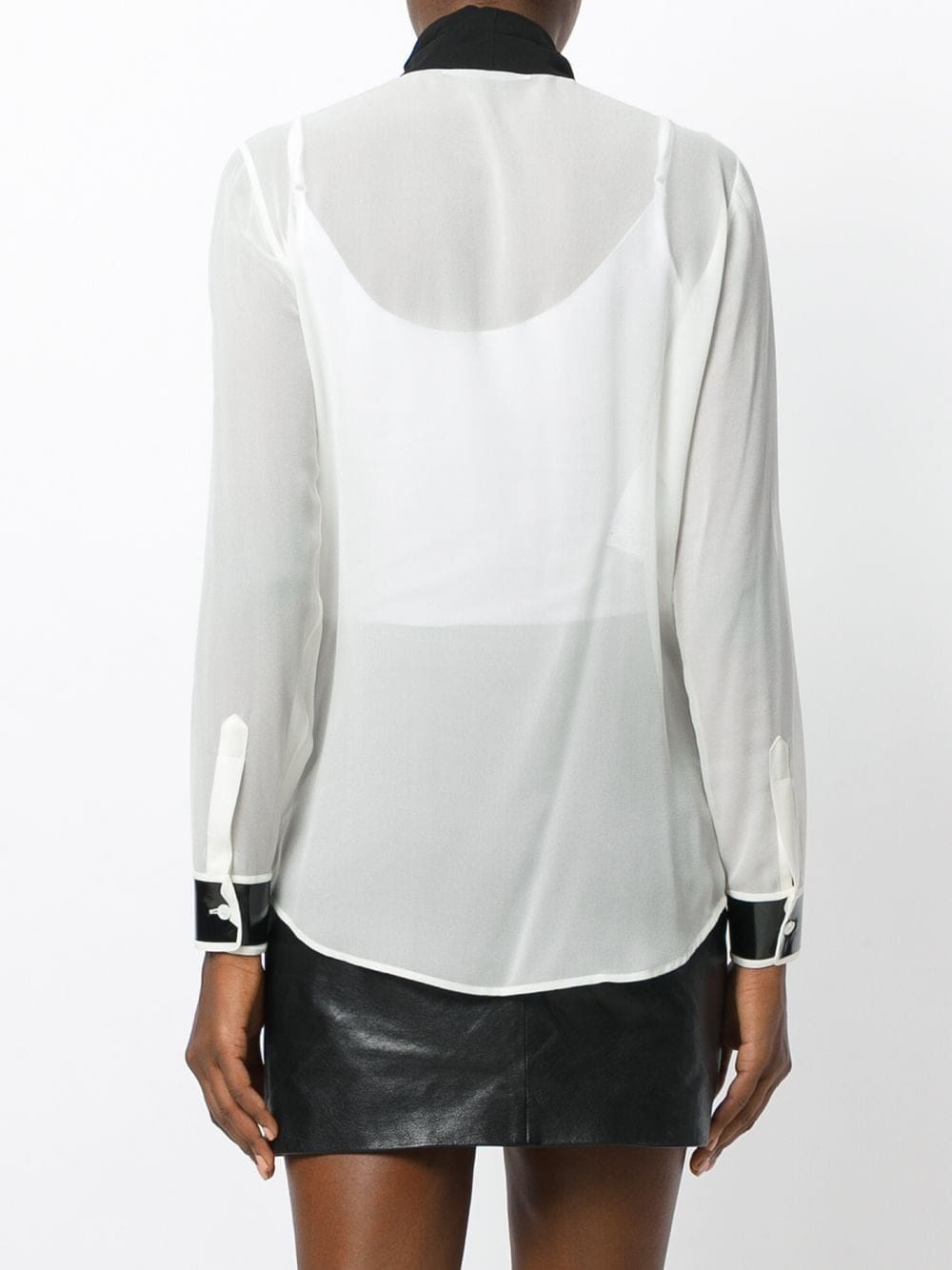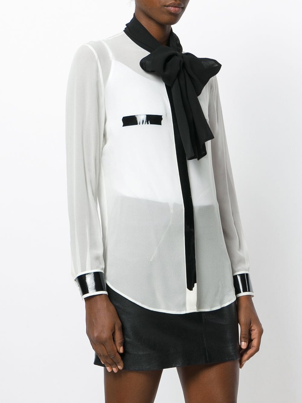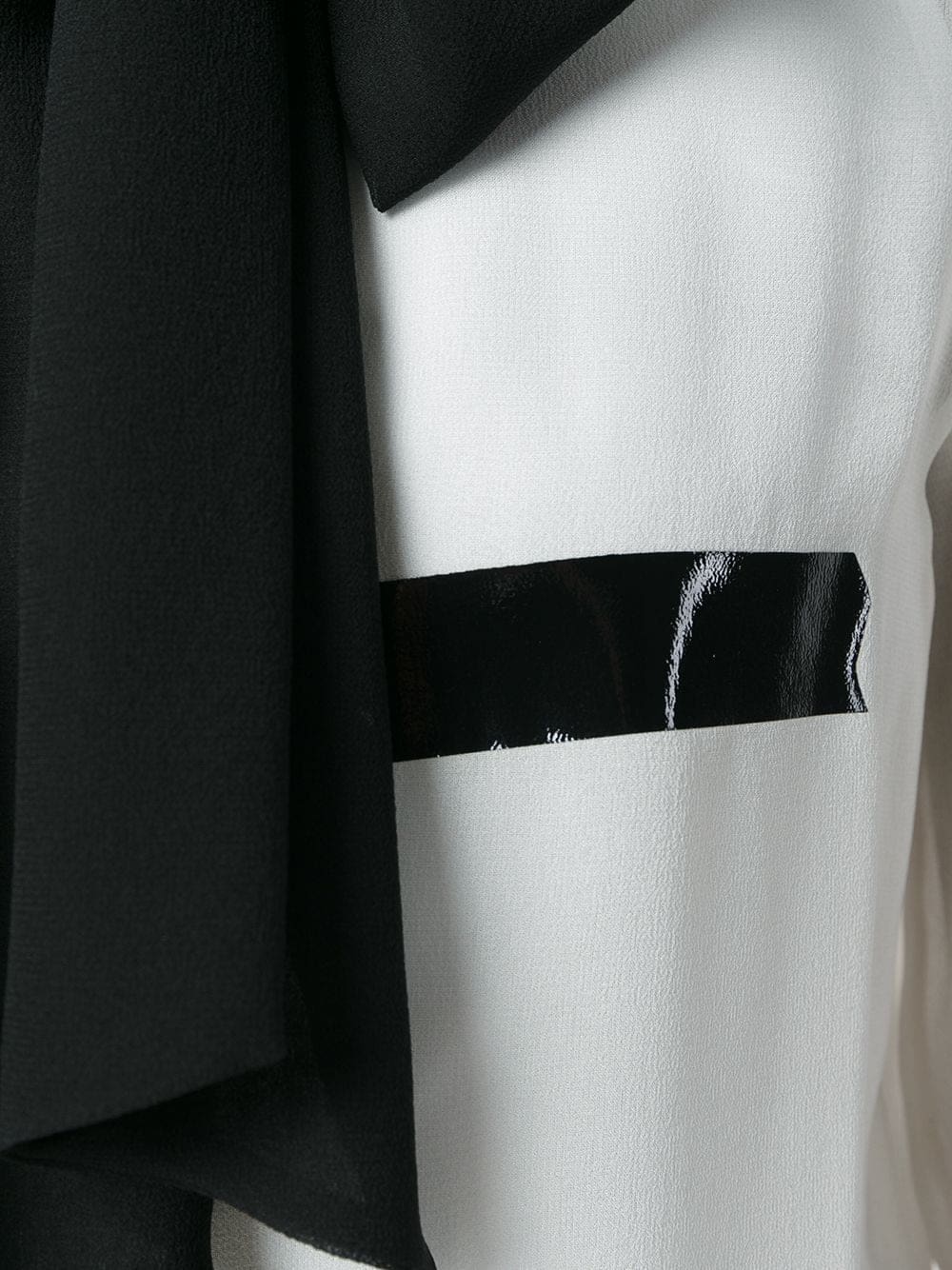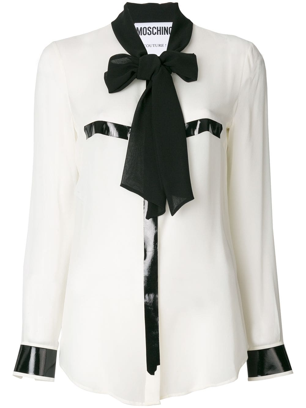 Jeremy Scott creates punchy designs under the house of Moschino. Expect to see colour blocked designs, pop culture motifs and bold brand logos. White silk pussy bow blouse featuring long sleeves, a front button placket and vinyl accents.
