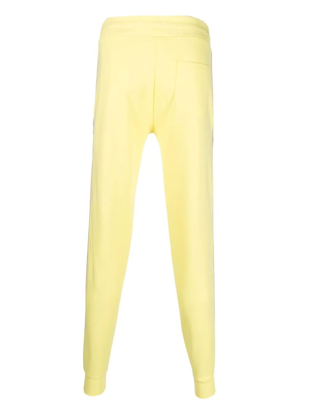 raised-logo logo-tape trackpants from MOSCHINO featuring yellow, cotton blend, raised logo detail, logo-tape detailing, elasticated drawstring waistband, rear patch pocket, ribbed cuffs and slim cut.