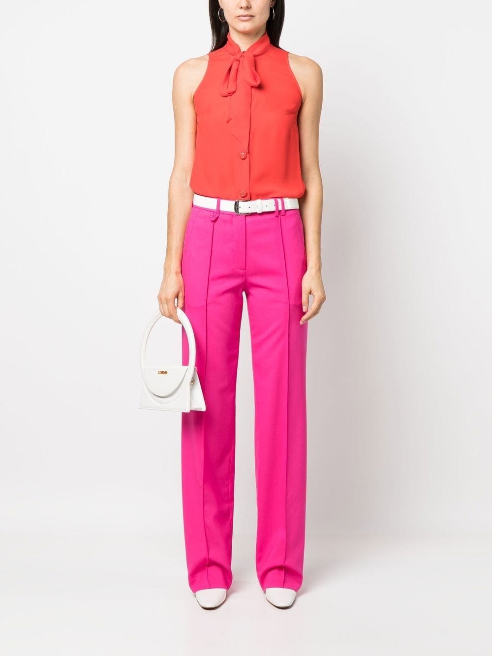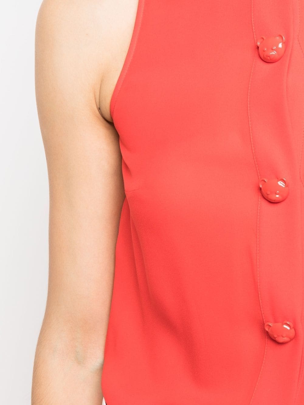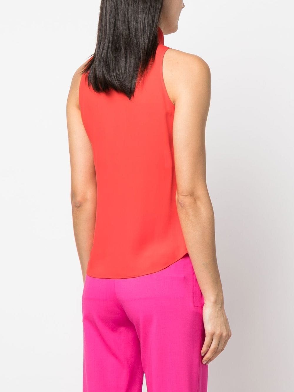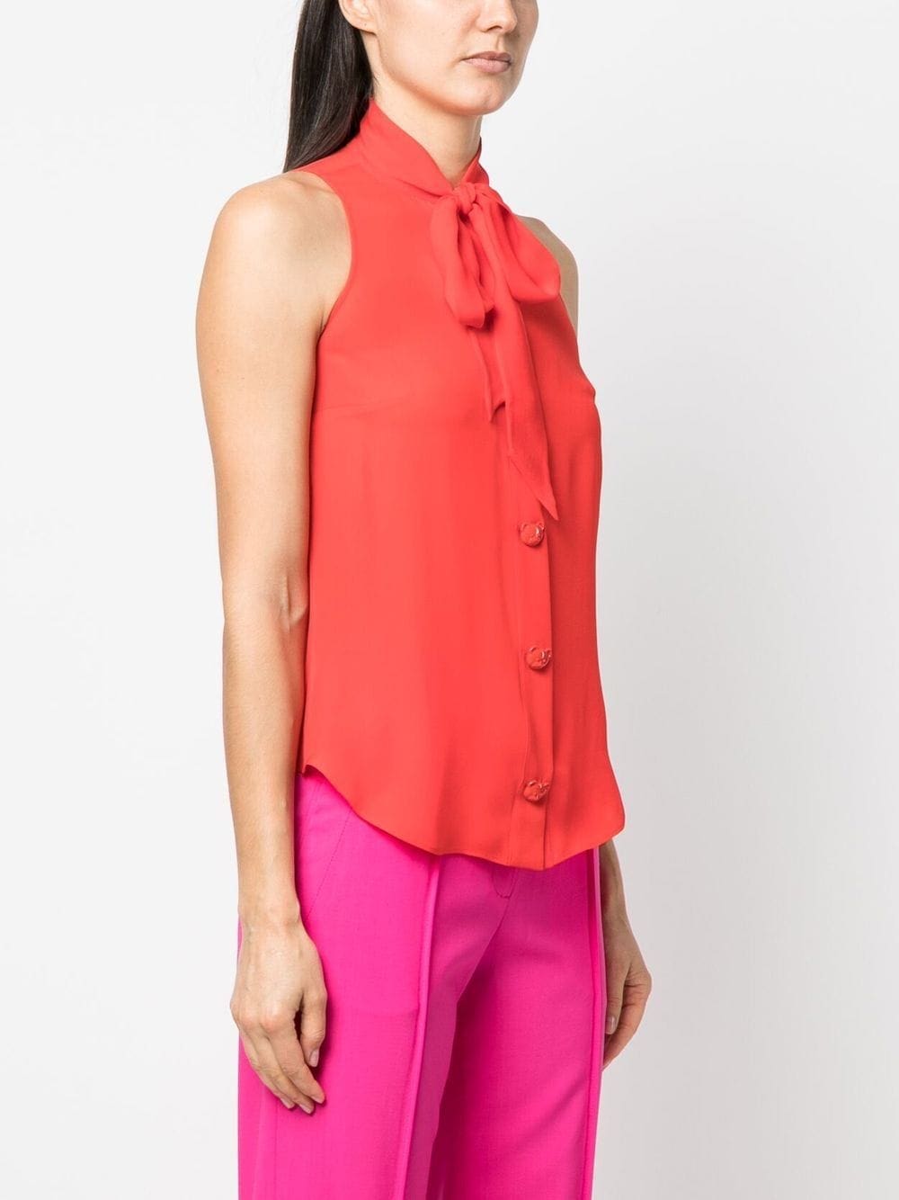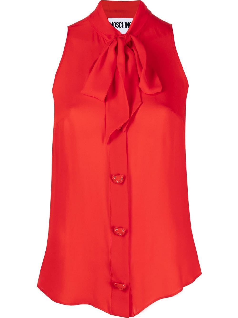 bright red silk pussy-bow collar sleeveless front button fastening curved hem