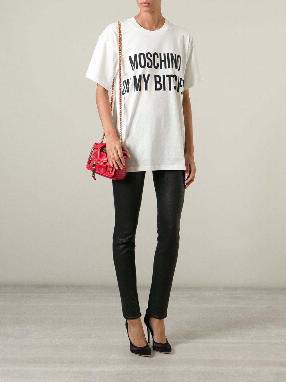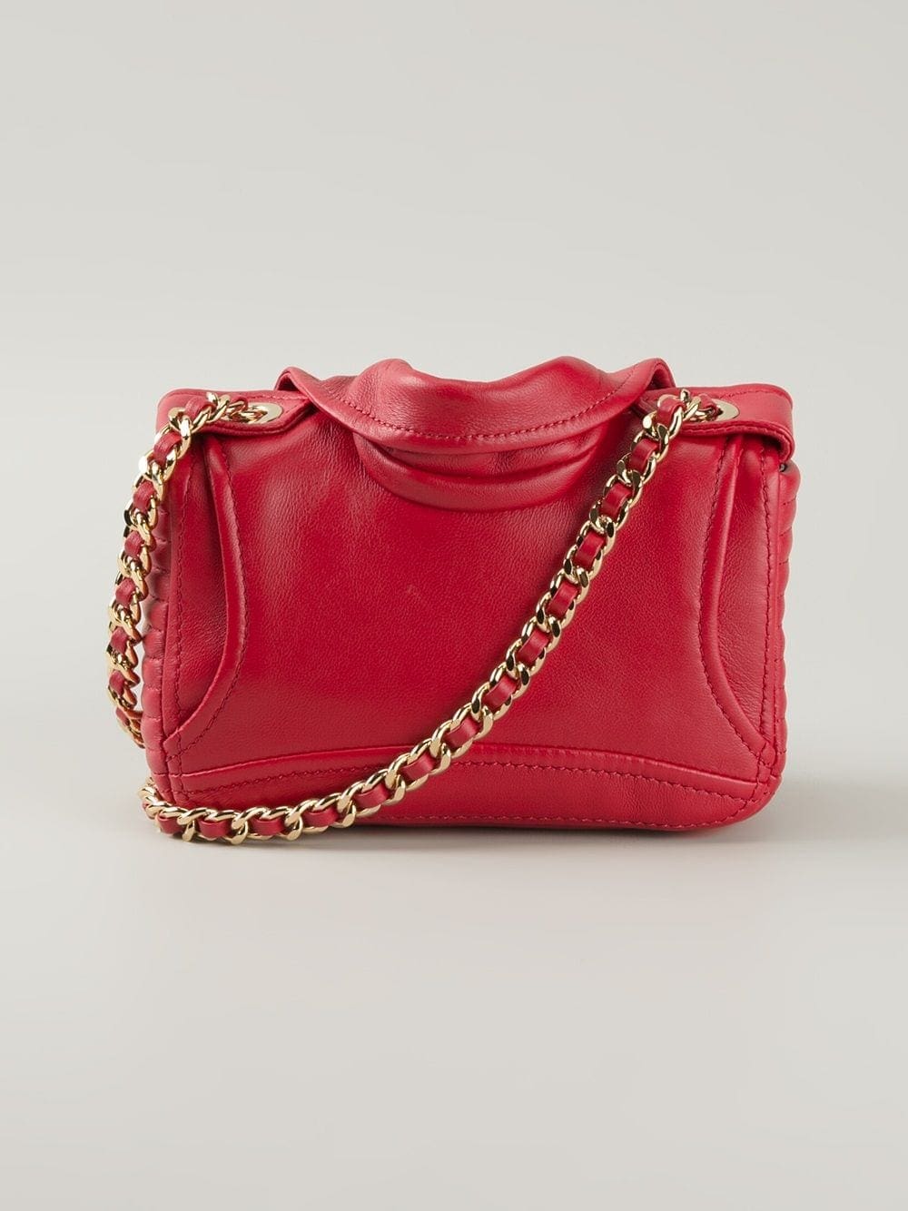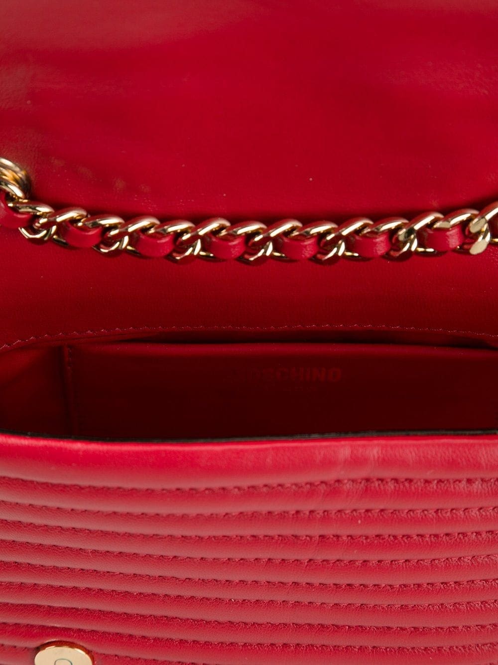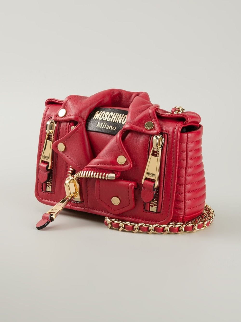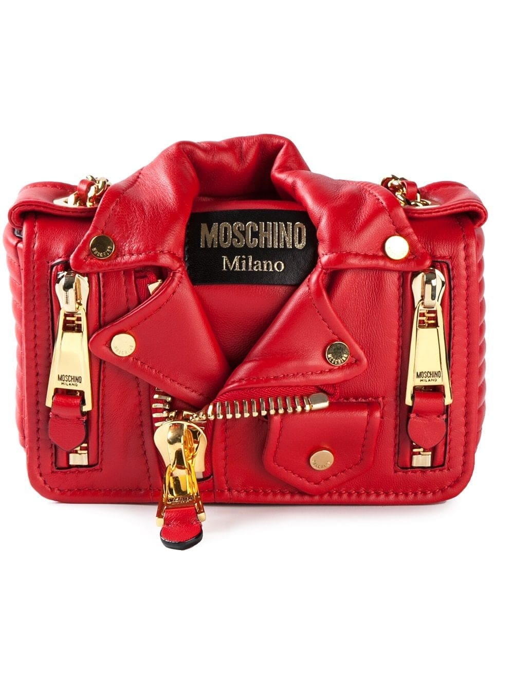 Red leather small biker shoulder bag from Moschino featuring a foldover top, front zipped pockets, gold-tone hardware and a gold-tone chain and leather shoulder strap.