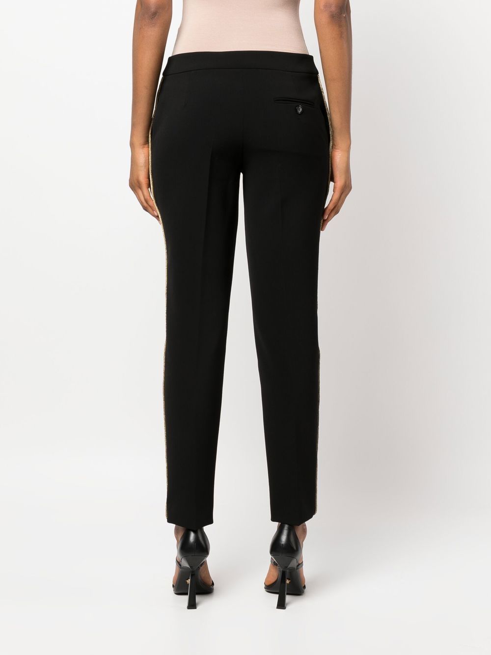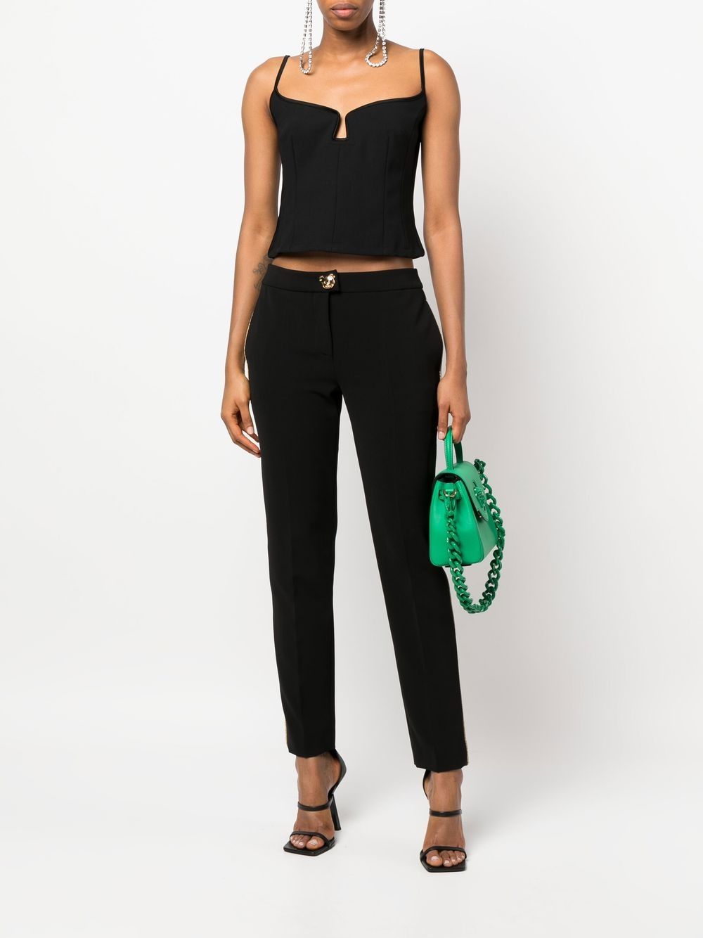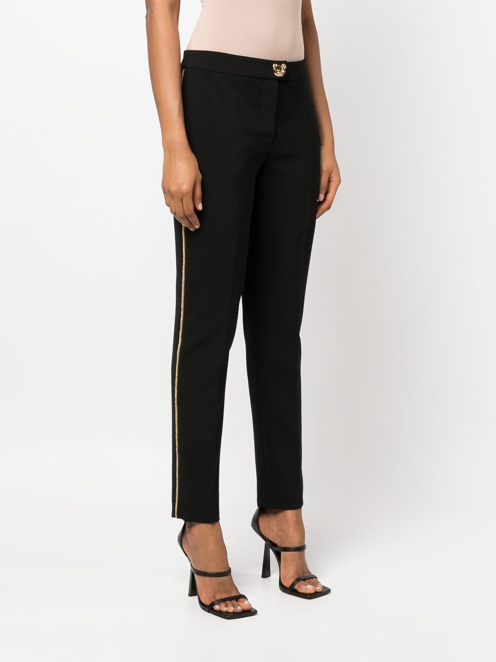 tapered side-stripe trousers from MOSCHINO featuring black, gold-tone hardware, front button and zip fastening, side stripe detailing and tapered leg.