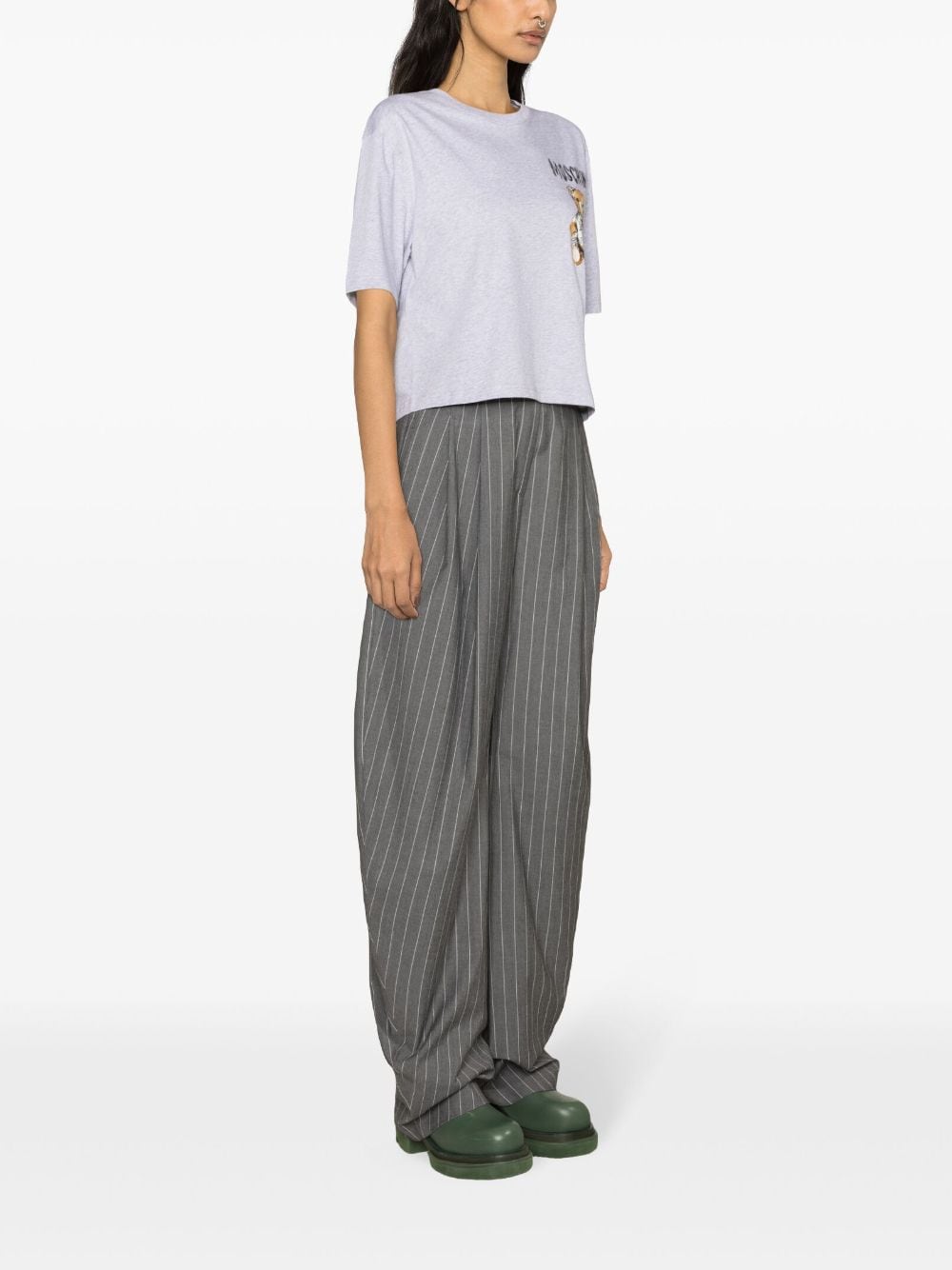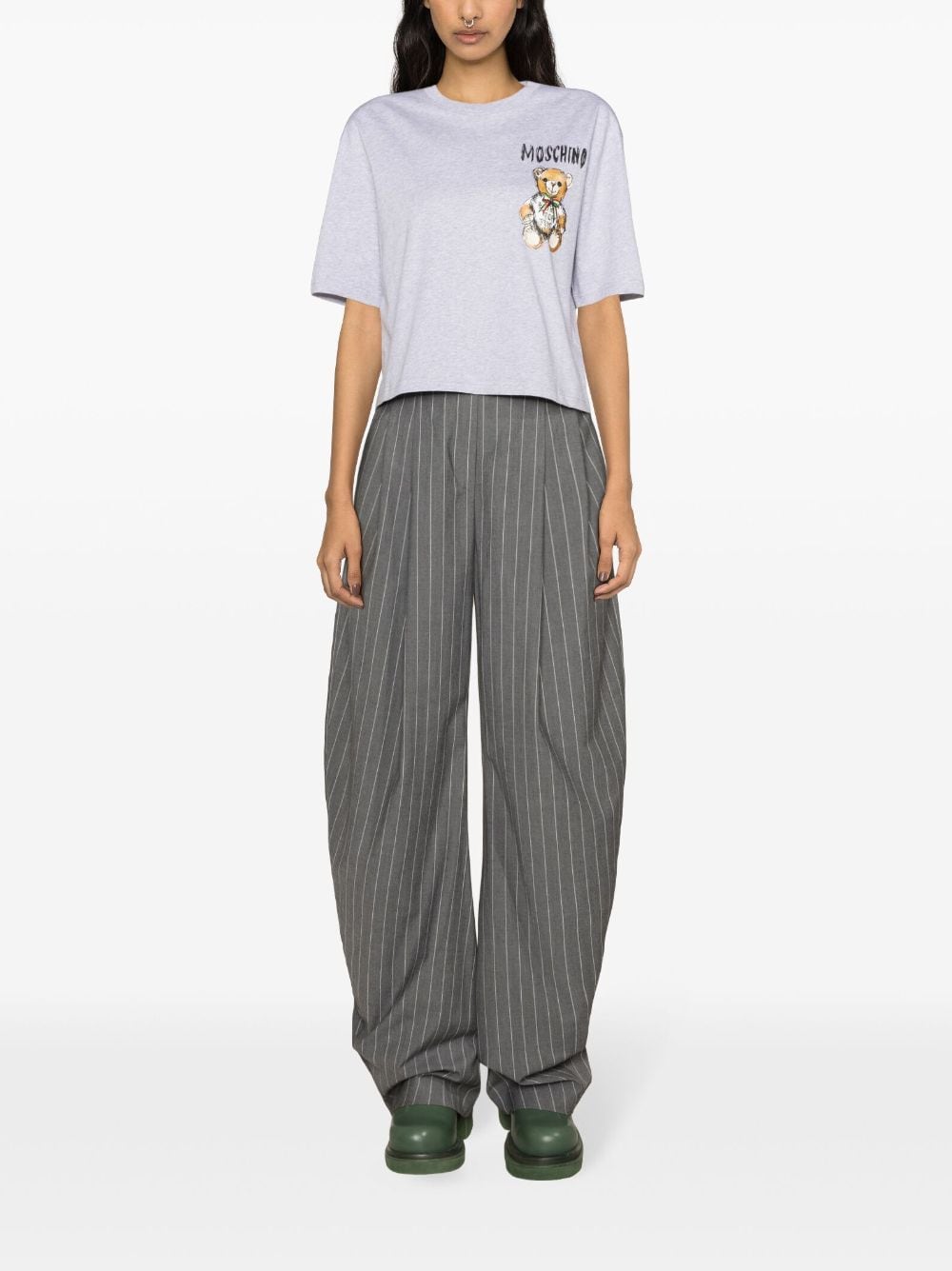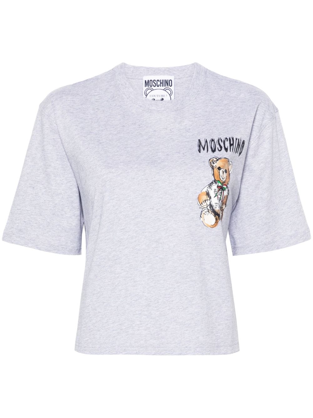 Mochino's iconic Teddy Bear motif pays homage to the famous Franco Moschino bear dress from the Autumn/Winter 1988 collection. It is seen adorning the front of this grey cotton T-shirt for a branded look.
