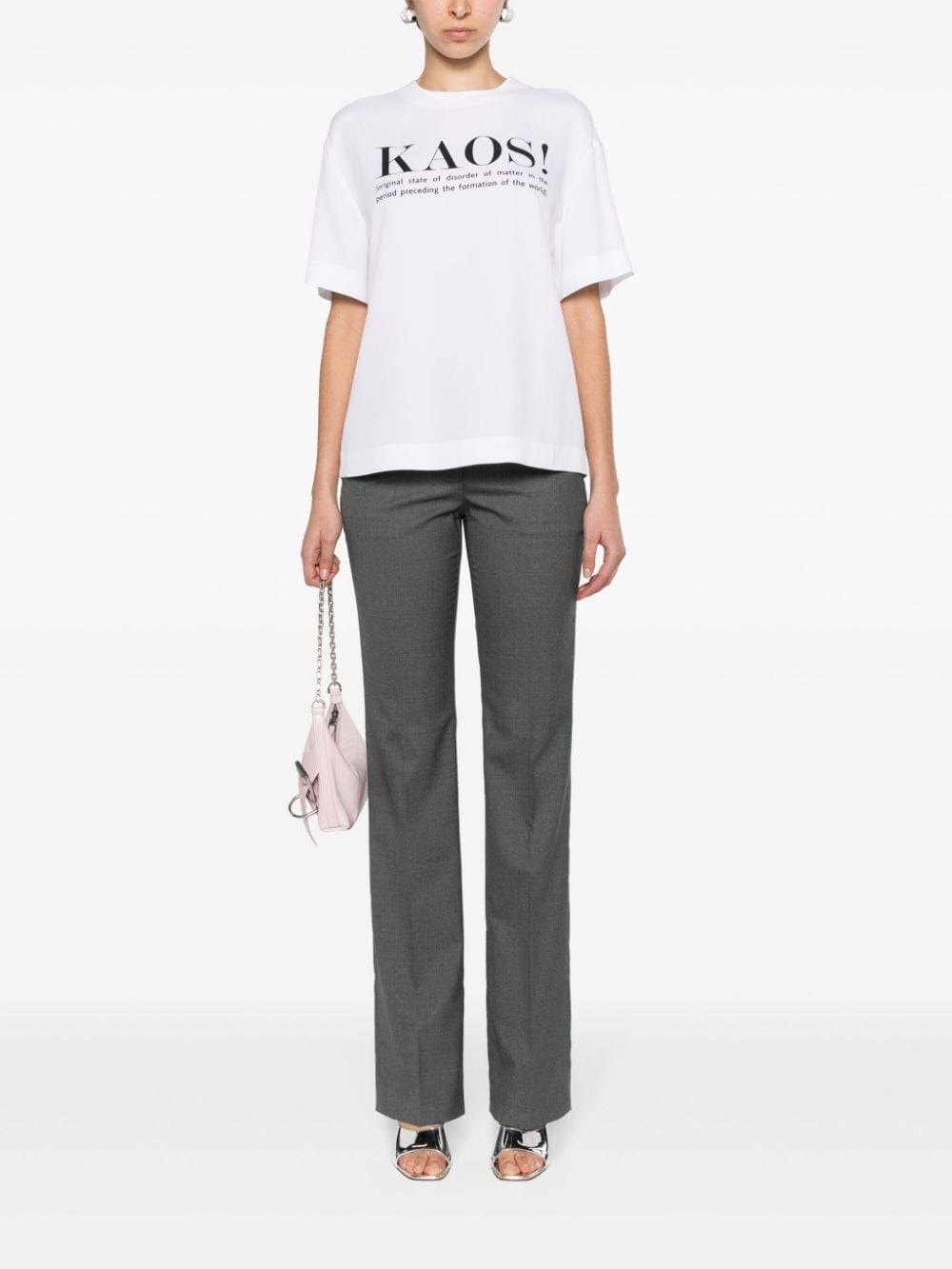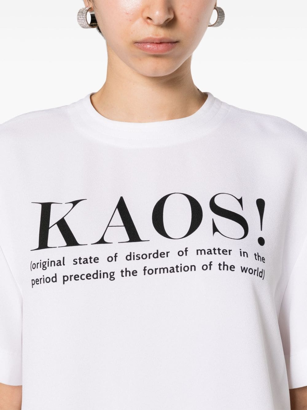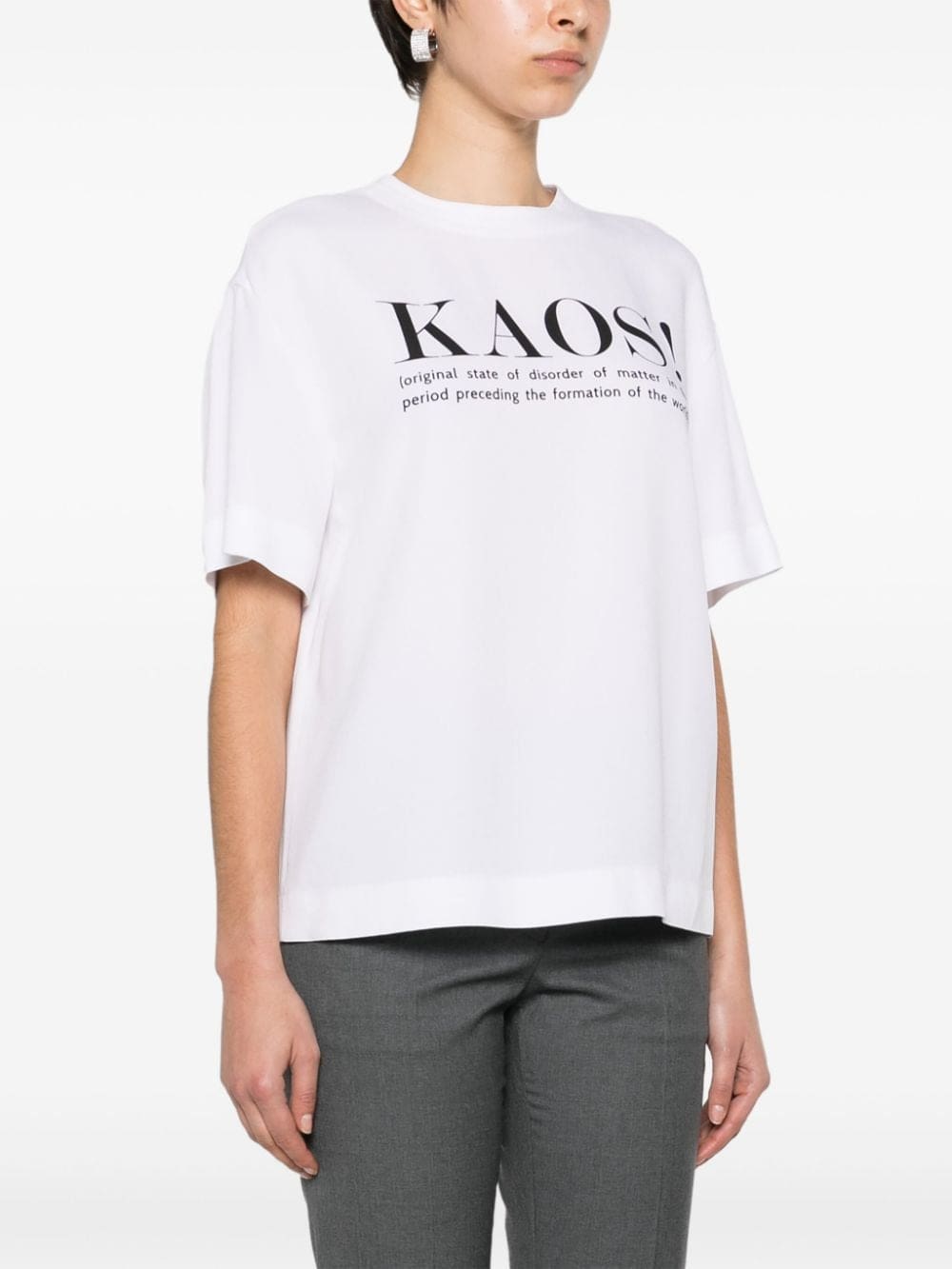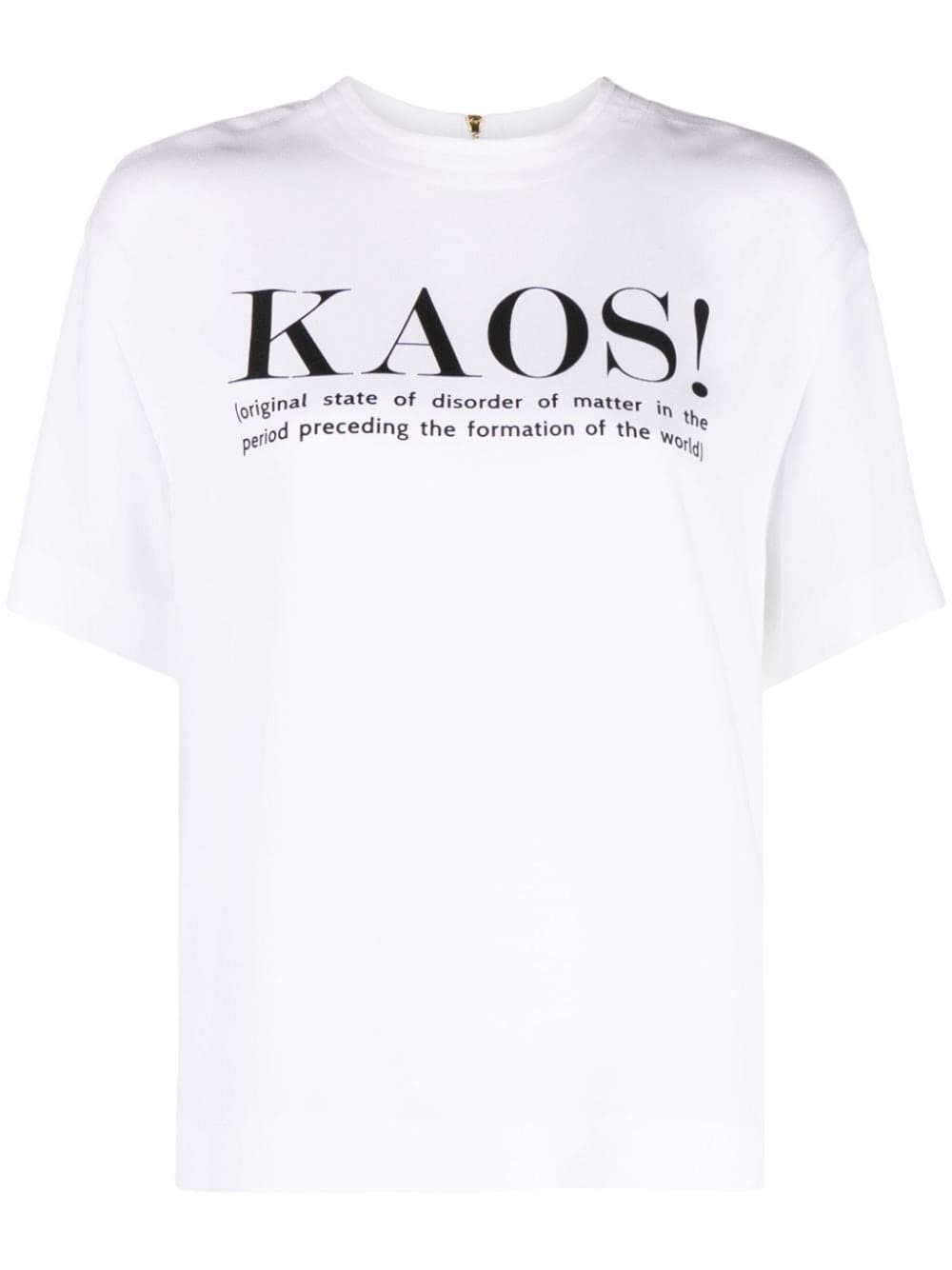 Moschino is known for its rebellious attitude and tongue-in-cheek slogans, and this T-shirt delivers on both. It's cut from white crepe to a relaxed silhouette and emblazoned with a Kaos! print on the front in black capital letters, followed by the word's definition.