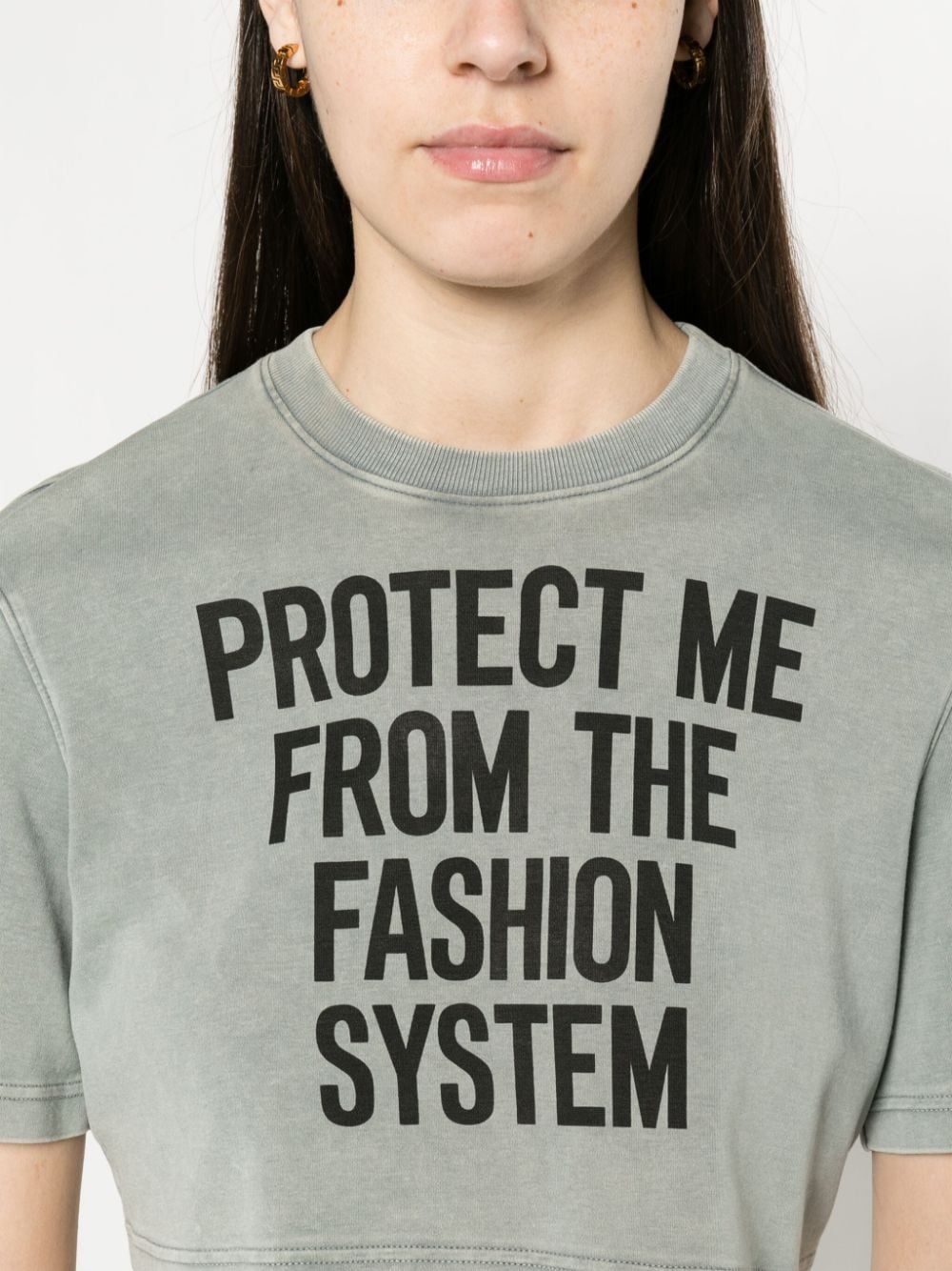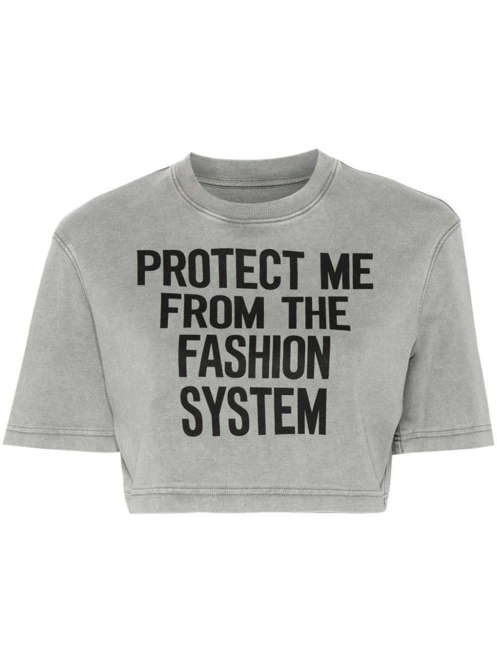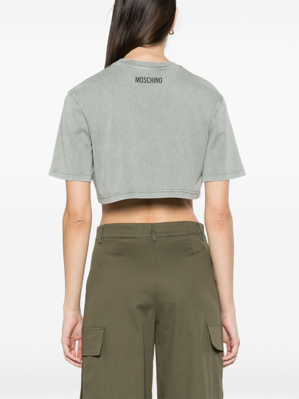 Cut from soft organic cotton, this grey T-shirt by Moschino is designed with a contemporary cropped hem. Its relaxed silhouette is emblazoned with a bold slogan print across the front.