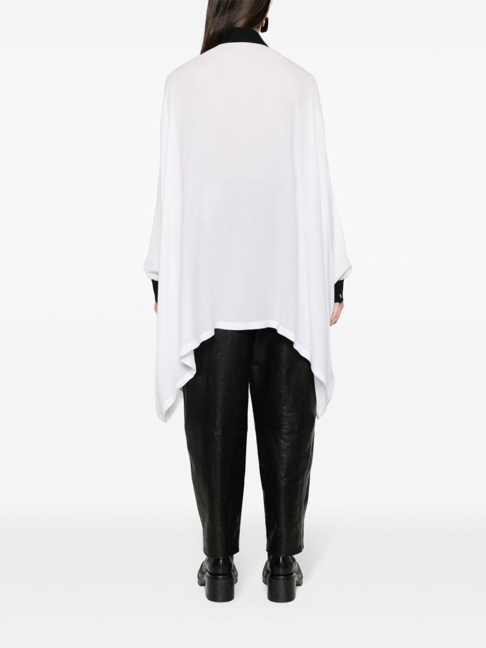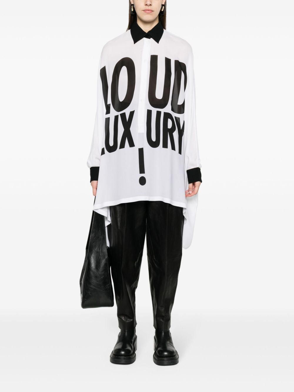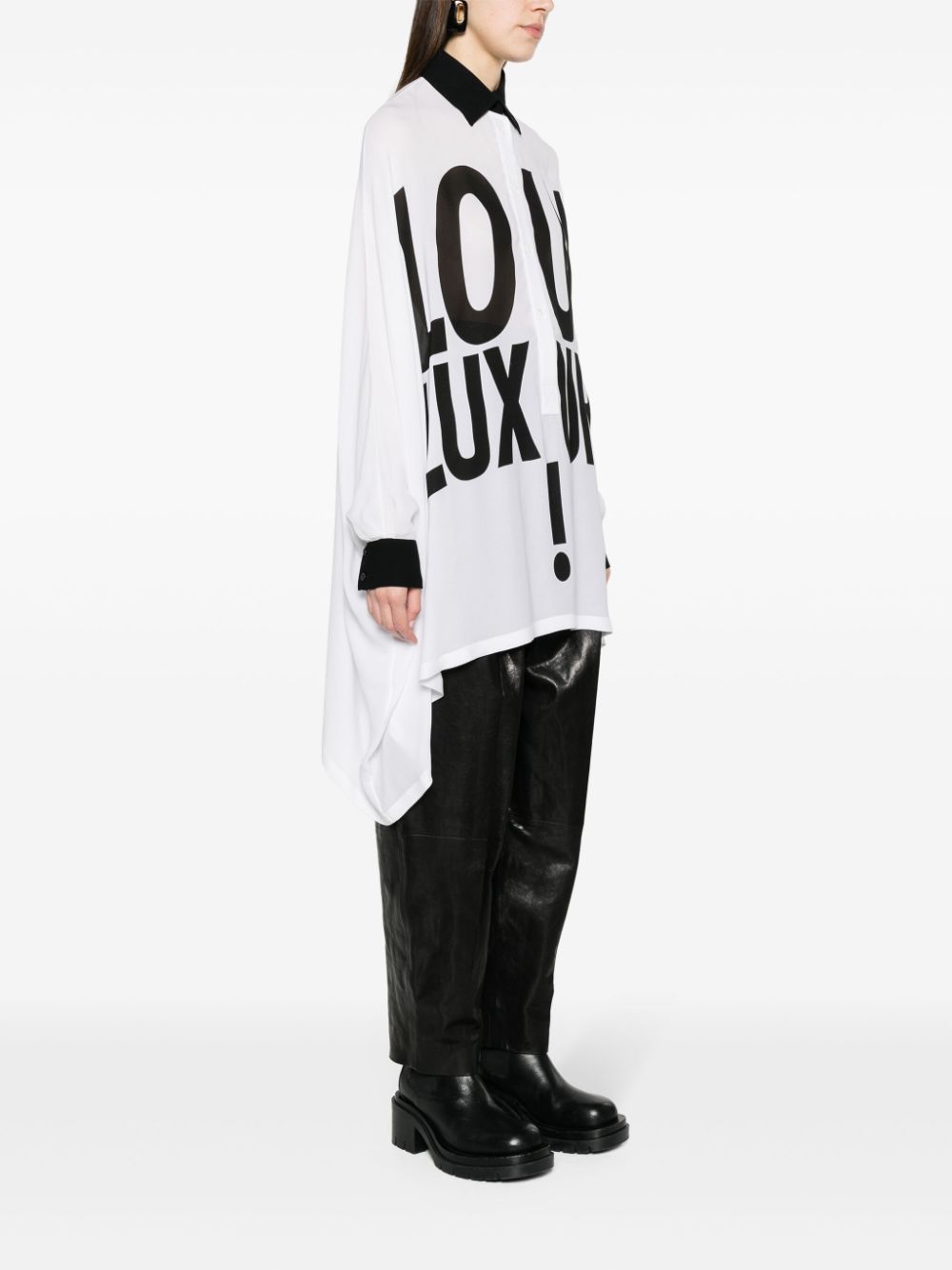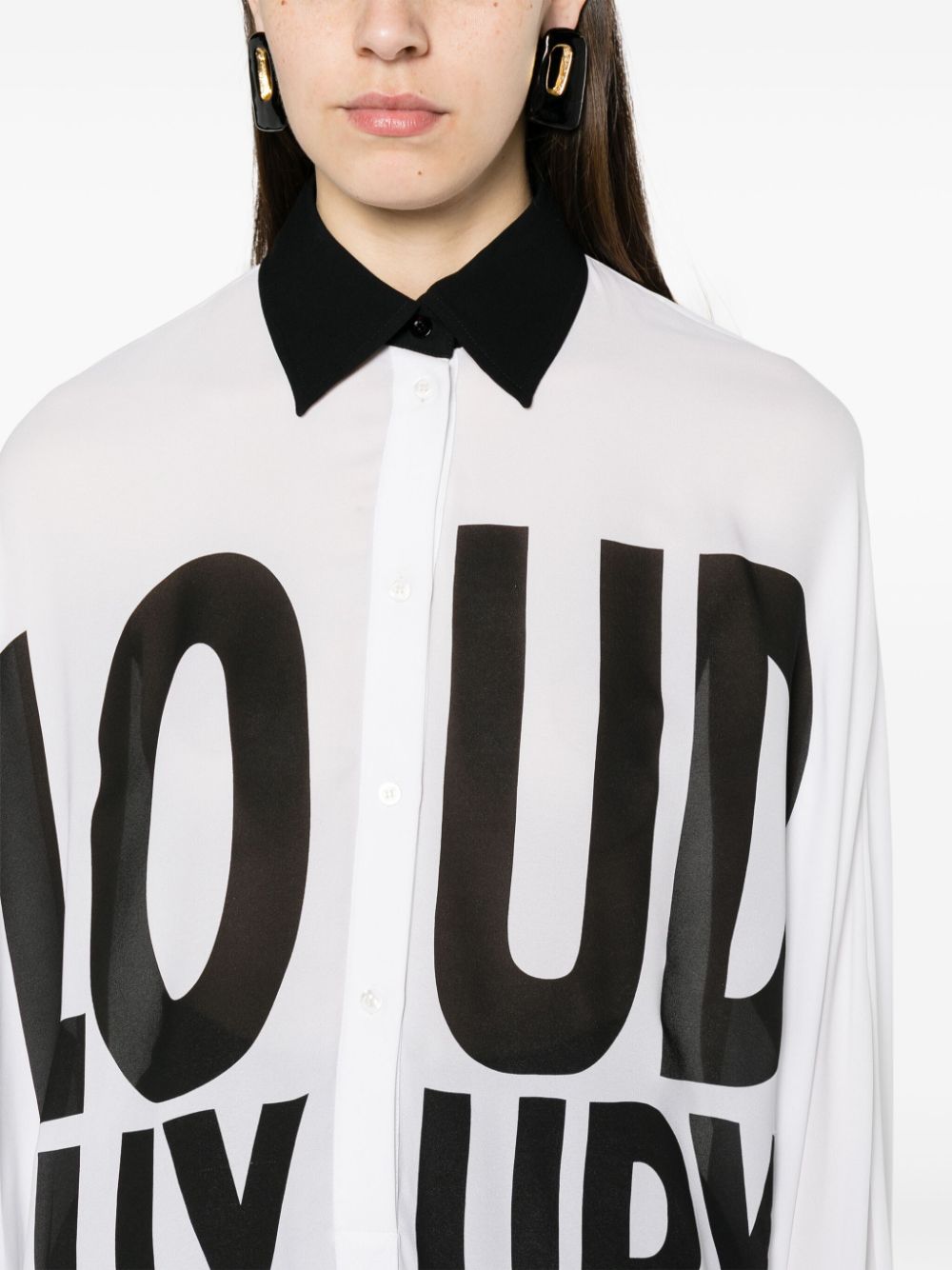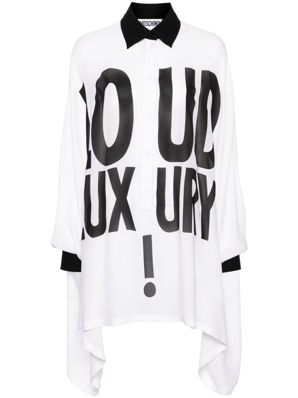 Crafted from pure silk, this oversized shirt dress by Moschino is emblazoned with an all-caps slogan across its front. A contrasting collar and asymmetric hem complete the avant-garde look.