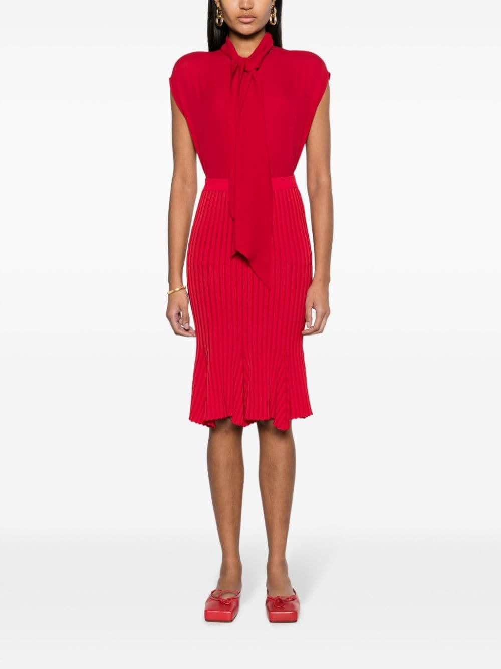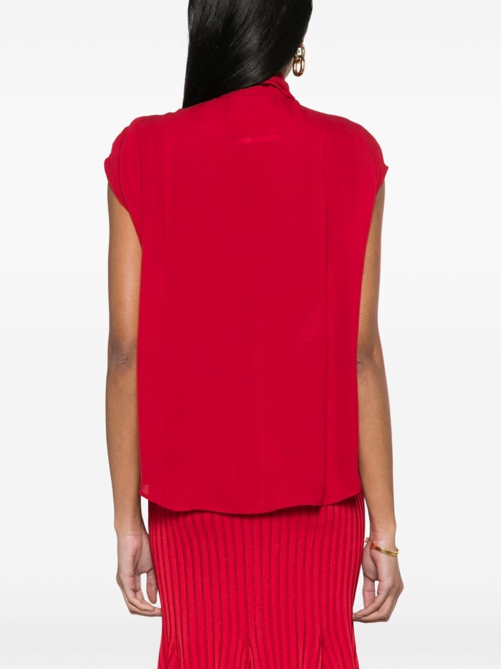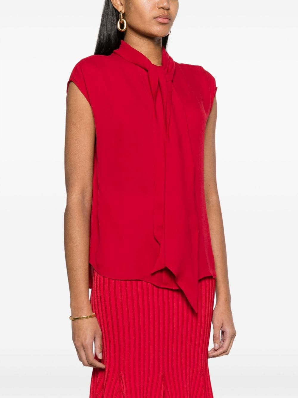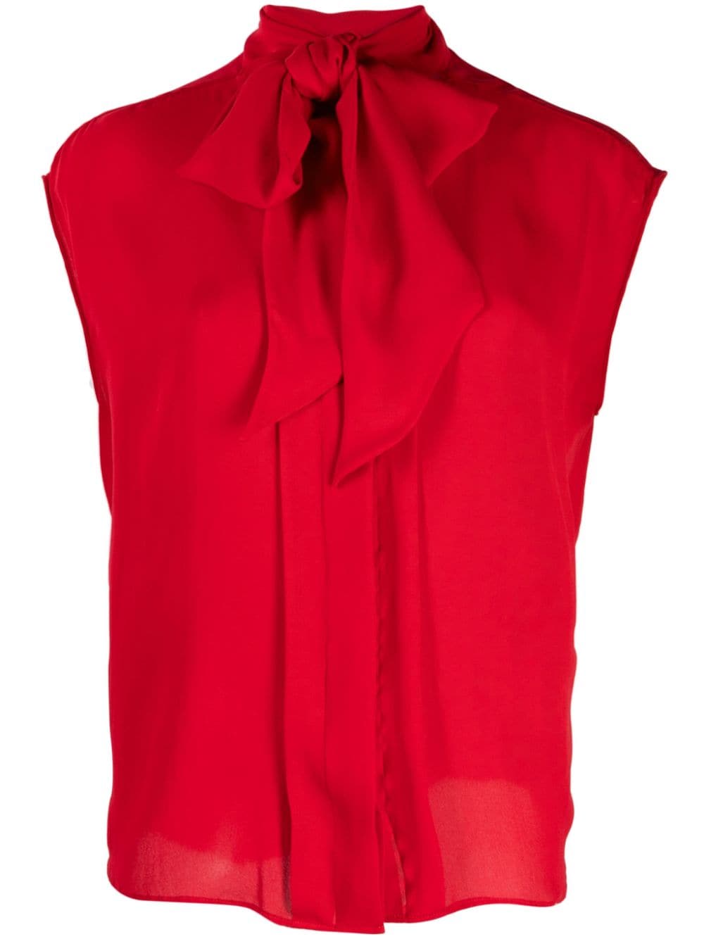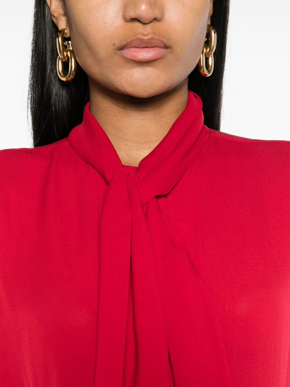 Moschino briefly steps away from its whimsical aesthetic and takes a rather elegant route with this silk blouse. It offers a contemporary and sophisticated look with an oversized bow fastening at the collar and bright red hue.