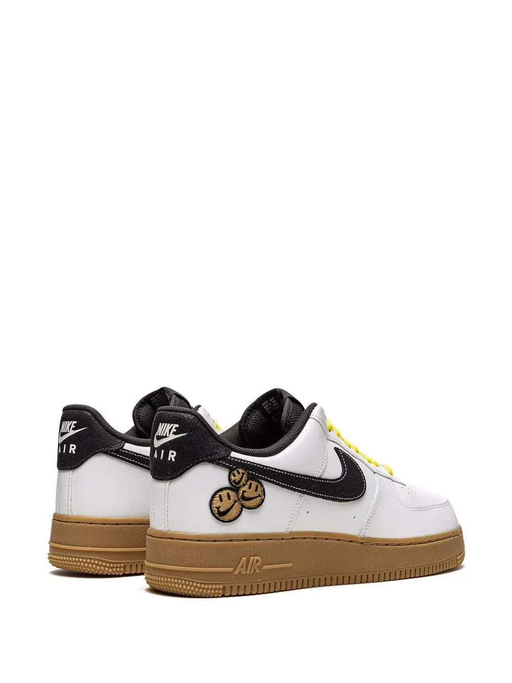 The Nike Air Force 1 Low “Go the Extra Smile” is a fun colourway of the classic sneaker from the 'Have a Nice Day' collection released in November 2021. This version stands out thanks to the embroidered smiley faces with Swoosh logos for mouths on the heel. A white tumbled leather base is paired with a black leather Swoosh on the sides. Classic 'Nike Air' and Swoosh branding is embroidered on the heel while contrasting yellow laces complete the look.