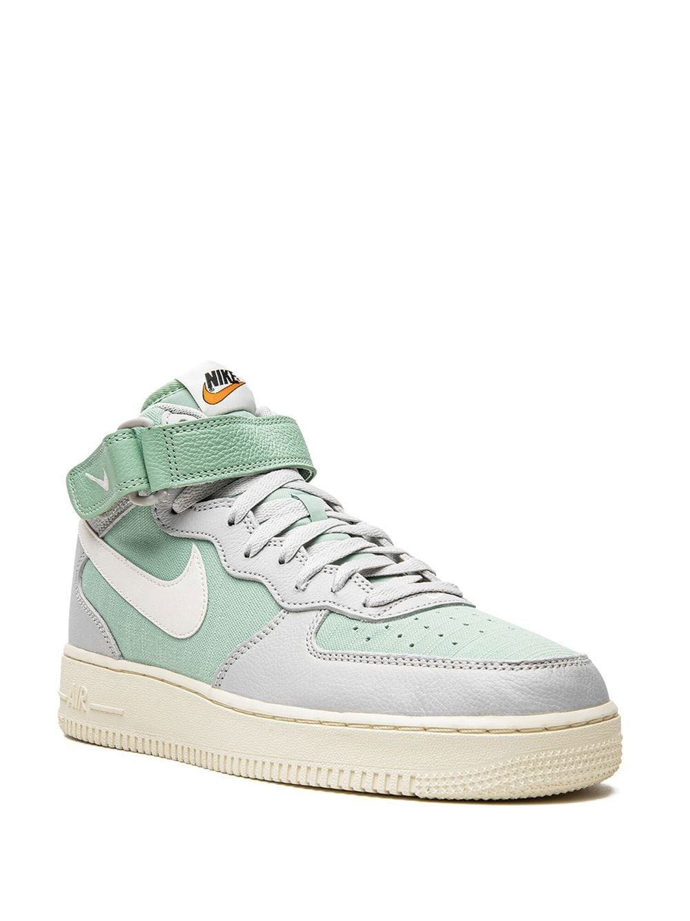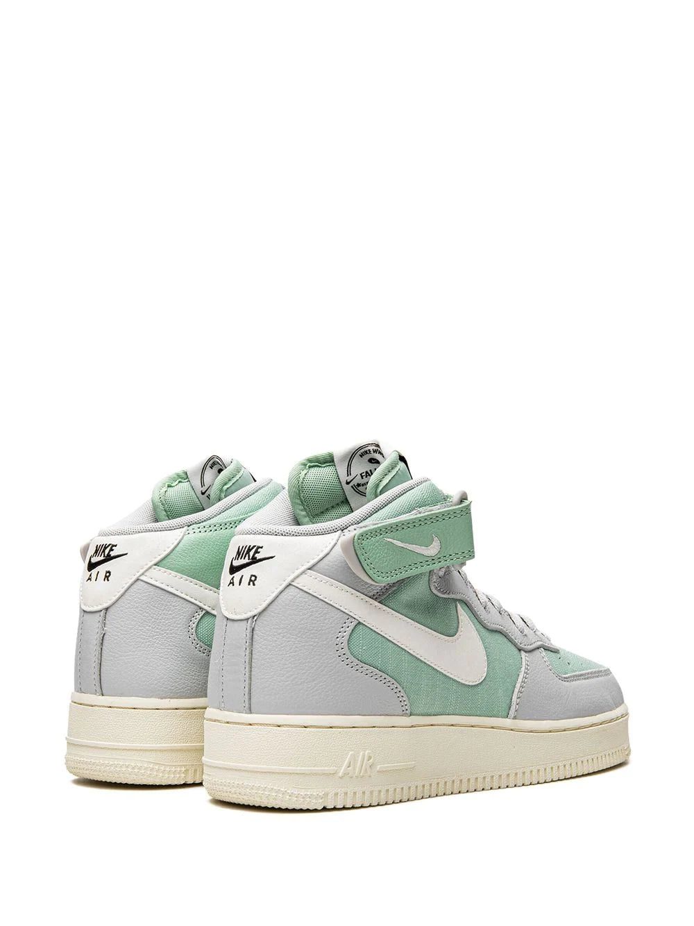 Nike's Air Force 1 Mid LX “Enamel Green” stands out thanks to its neutral design in light green and light grey hues. This high-top sneaker is crafted from a mix of leather and canvas, highlited by a white Swoosh on the sides and sits atop a cream rubber sole.