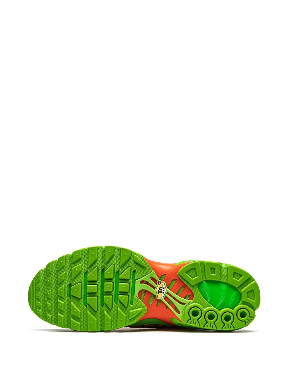 The Nike Air Max Plus has introduced hundreds of colorways and variations in the past two decades. This pair presents a bold look with a mean green base. The upper is hosted with a mesh material, while the Air Max Plus signature cage overlay stands out in orange. The Nike Swoosh on the lateral side is a rich black color, and black details the laces, collar, and mudguard. Equipped with Max Air technology in the midsole, the shoe offers the perfect amount of cushioning.