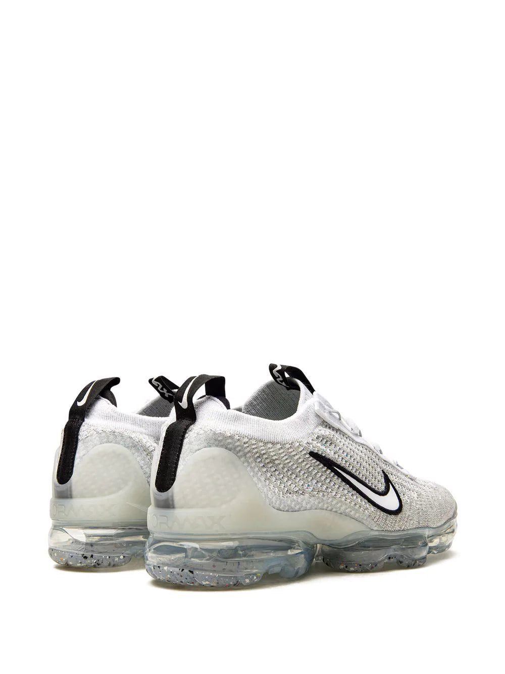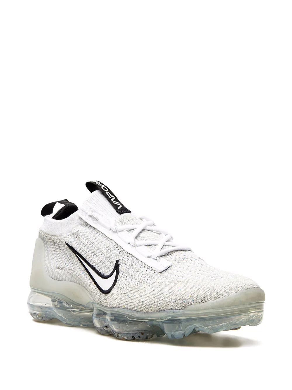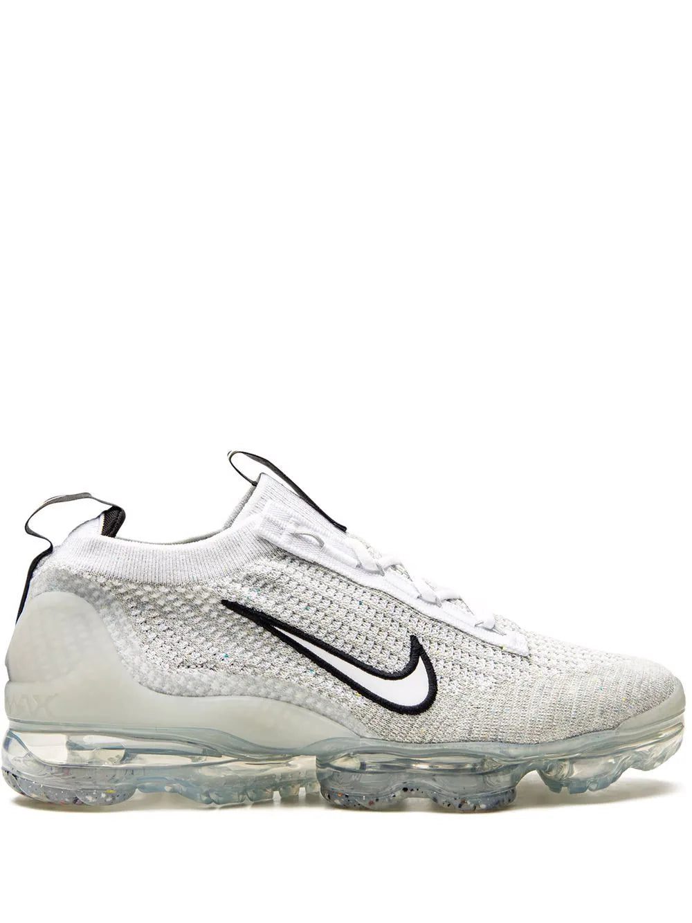 Nike's Air VaporMax 2021 now appears in a white and black colour scheme. Here, the Flyease tightening system has been removed for a traditional lacing system and the heel clips and toe cap now have a thicker Swoosh on the panels. The usual Flyknit on the upper and the VaporMax Air unit stays the same.