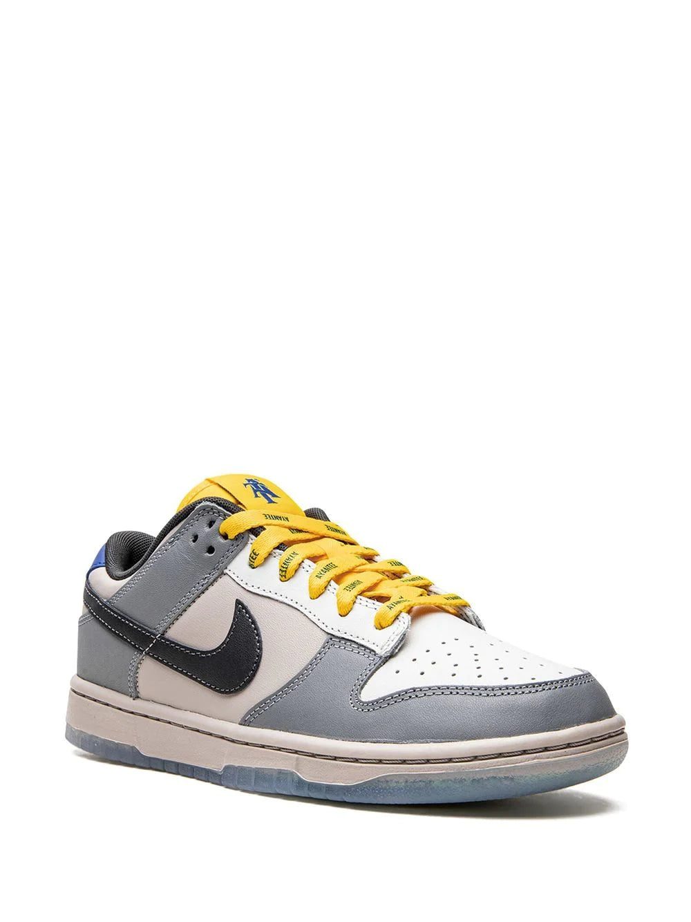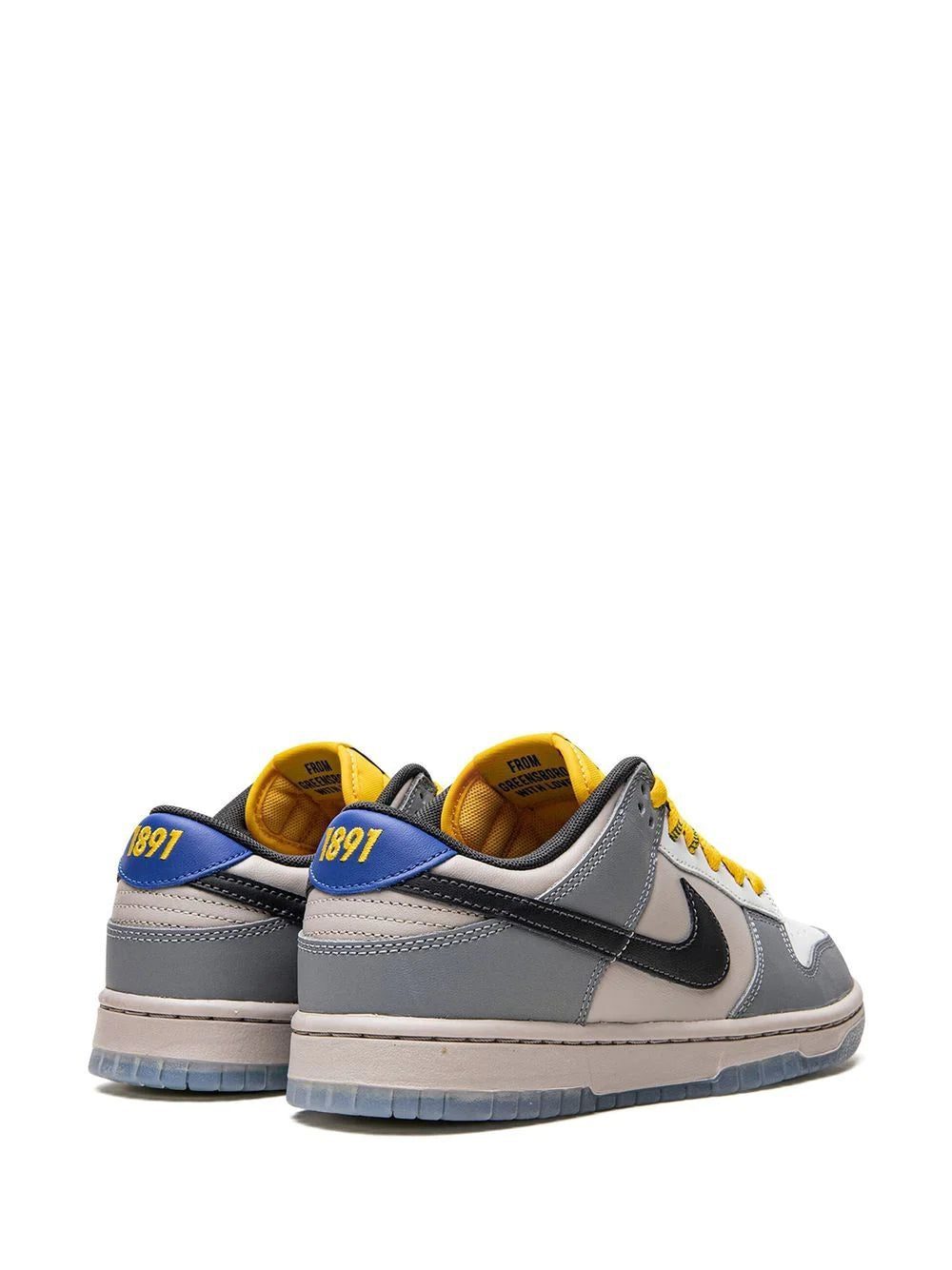 The Nike Dunk Low “North Carolina A&T” is a colourway of the retro basketball shoe that honours the Historically Black College and University. This model features a mismatched colour block with grey and leather panels on its design. A black leather Swoosh appears on either side of the shoe. Branding specific to the university, including '1891' on the heel, 'FROM GREENSBORO, WITH LOVE' on the yellow laces, and a North Carolina A&T logo on the tongue, all contribute to the shoe’s unique design.