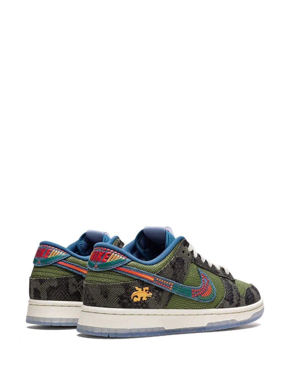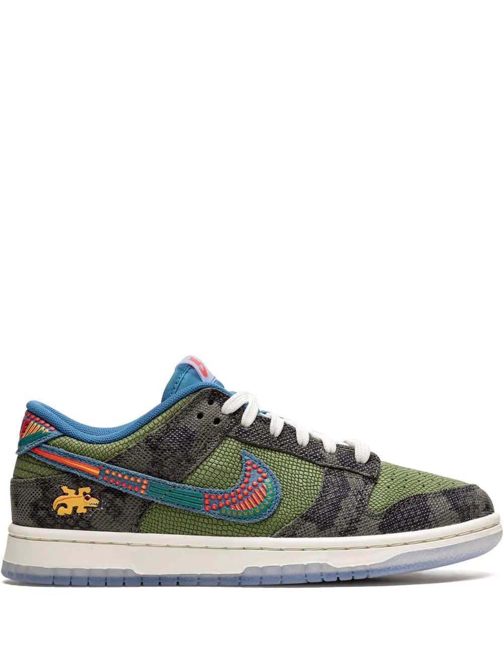 Inspired by Mexico's Día de Los Muertos, the Nike Dunk Low "Siempre Familia" appears in a mix of muted green and vibrant citrus tones. The sneaker has some reptile-inspired leather panels on the base and superimposed layers throughout the upper, with the side Swooshes introducing a contrasting blue. Underfoot, the pair has a much more reserved colour palette, although outsoles indulge in a semi-translucent, icy blue finish.