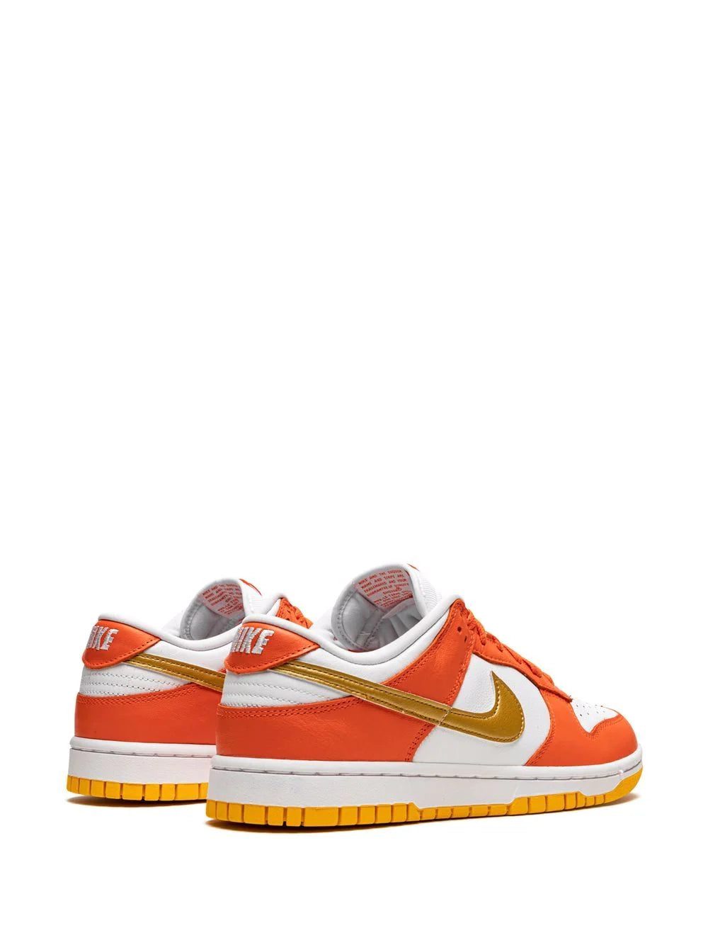 Nike's Dunk Low “University Gold” sneakers feature a white leather base with orange overlays, laces, and tongue branding. The woven Nike tag appears on the tongue, while an embroidered logo graces the orange leather heel tab. Underfoot, a white and deep yellow rubber sole finishes the look.