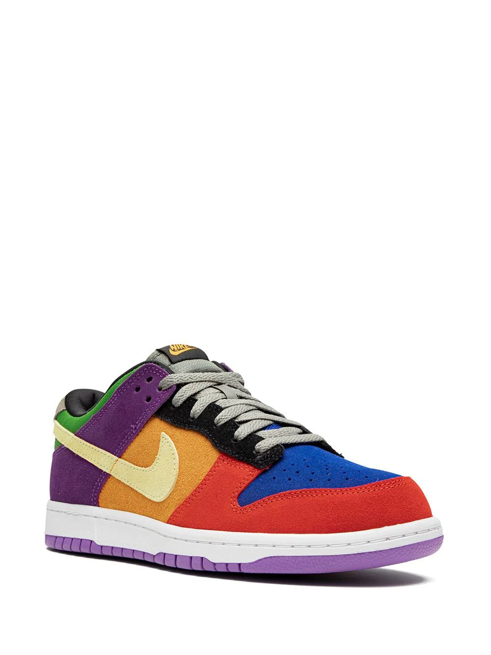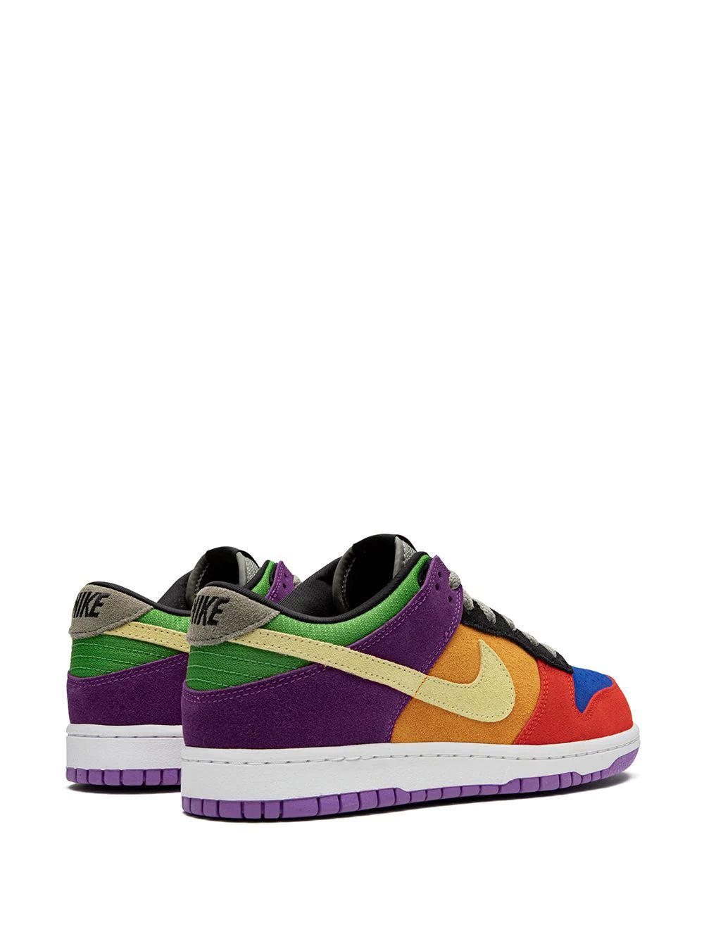Supplied by a premier sneaker marketplace dealing with unworn, already sold out, in demand rarities. Each product is rigorously inspected by experienced experts guaranteeing authenticity. The Nike Dunk Low “Viotech 2019” is the 2019 bringback of the now-classic multicolor look first released in 2002. The vibrant aesthetic includes colorful mismatched suede panels across the upper including a blue perforated toe, red forefoot, orange mid-panel, purple heel, and green nylon collar. A pale yellow Swoosh contrasts the bold base, while grey for the laces and nylon tongue add subdued styling to look. Nike finishes off the “Viotech” Dunk with a white rubber midsole and a purple outsole that fits within the carefree vibe of the shoe. Release date: December 10, 2019.