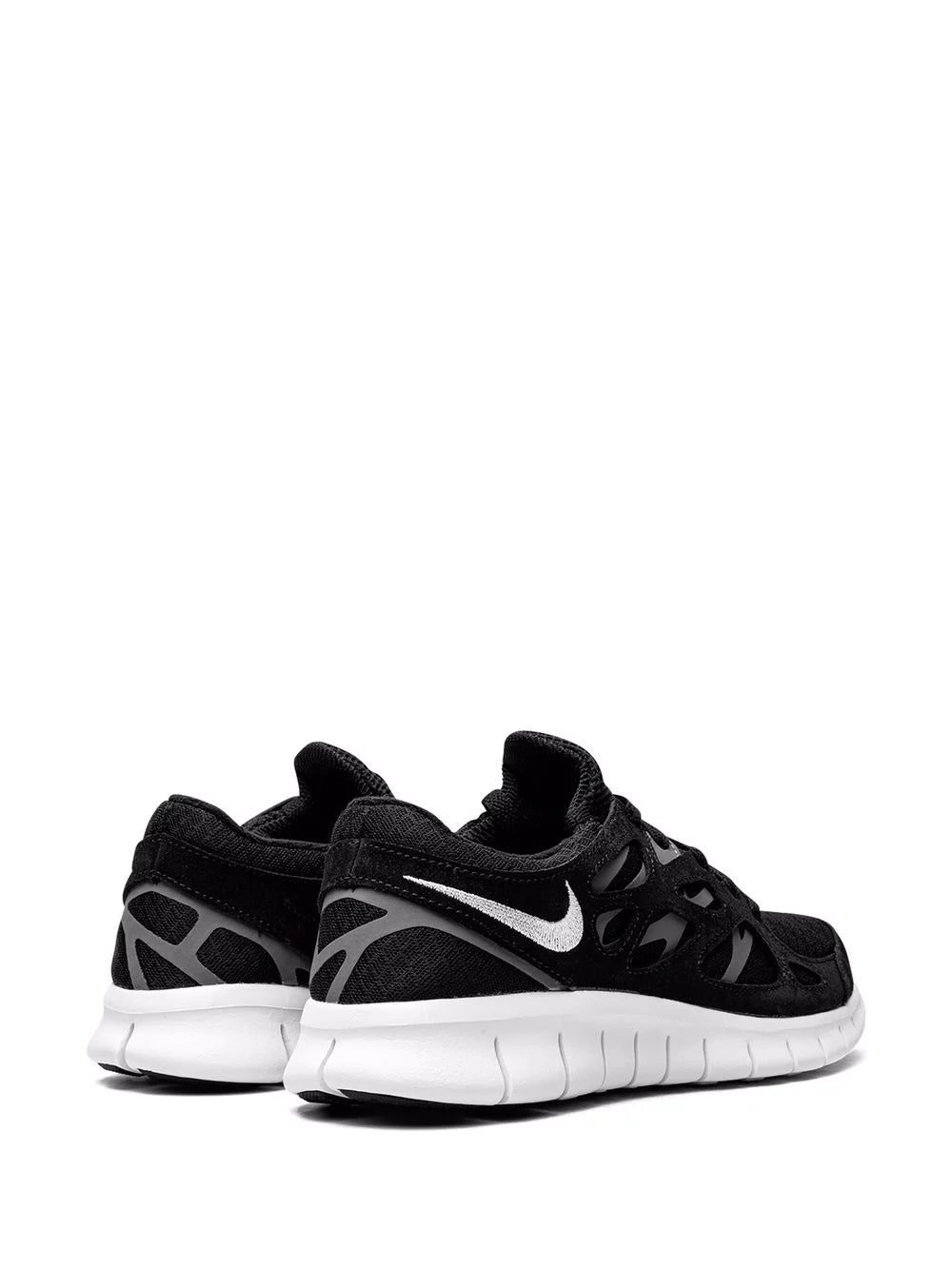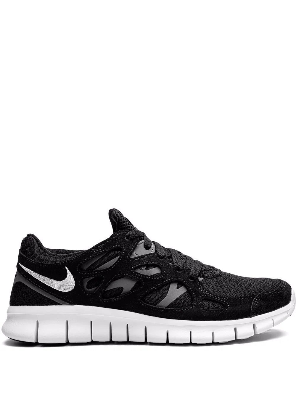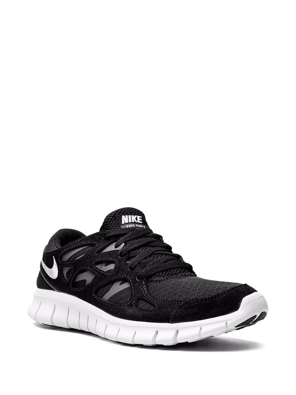Set atop the silhouette's signature Free 'barefoot-feel' rubber outsole, this pair of Free Run 2 low-top sneakers are presented in a black hue. Detailed with a contrasting white Swoosh logo, they feature a cut-out upper and foam rubber midsole.