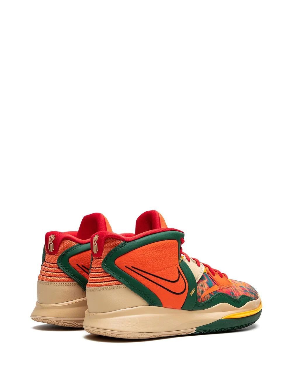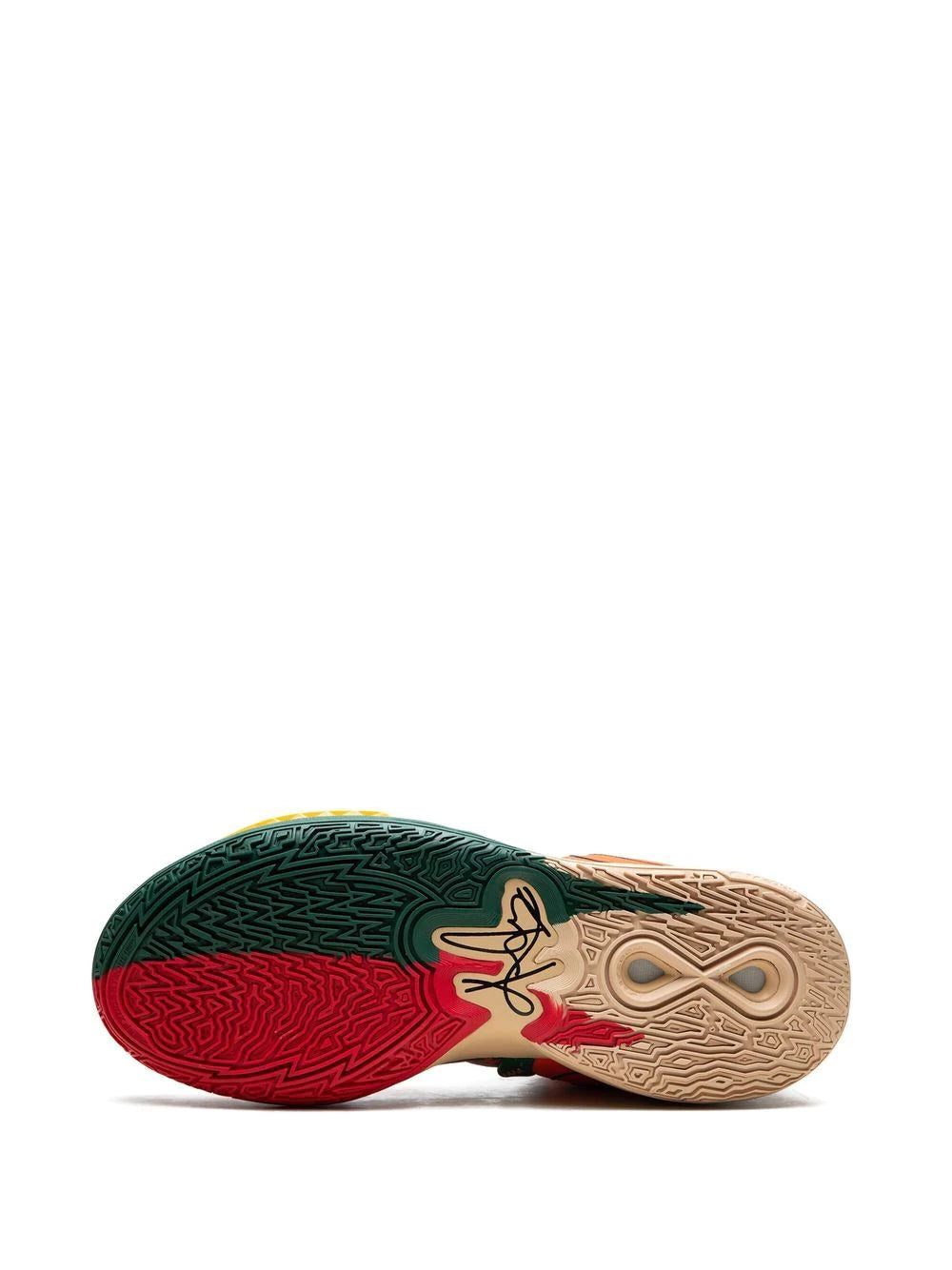 Nike's Kyrie Infinity now appears dressed in a dark green, orange and light beige colour scheme. This pair is crafted to a high-top silhouette with Kyrie logos on the tongue and heels. Underneath, a rubber outsole adds comfort and traction to the shoe.