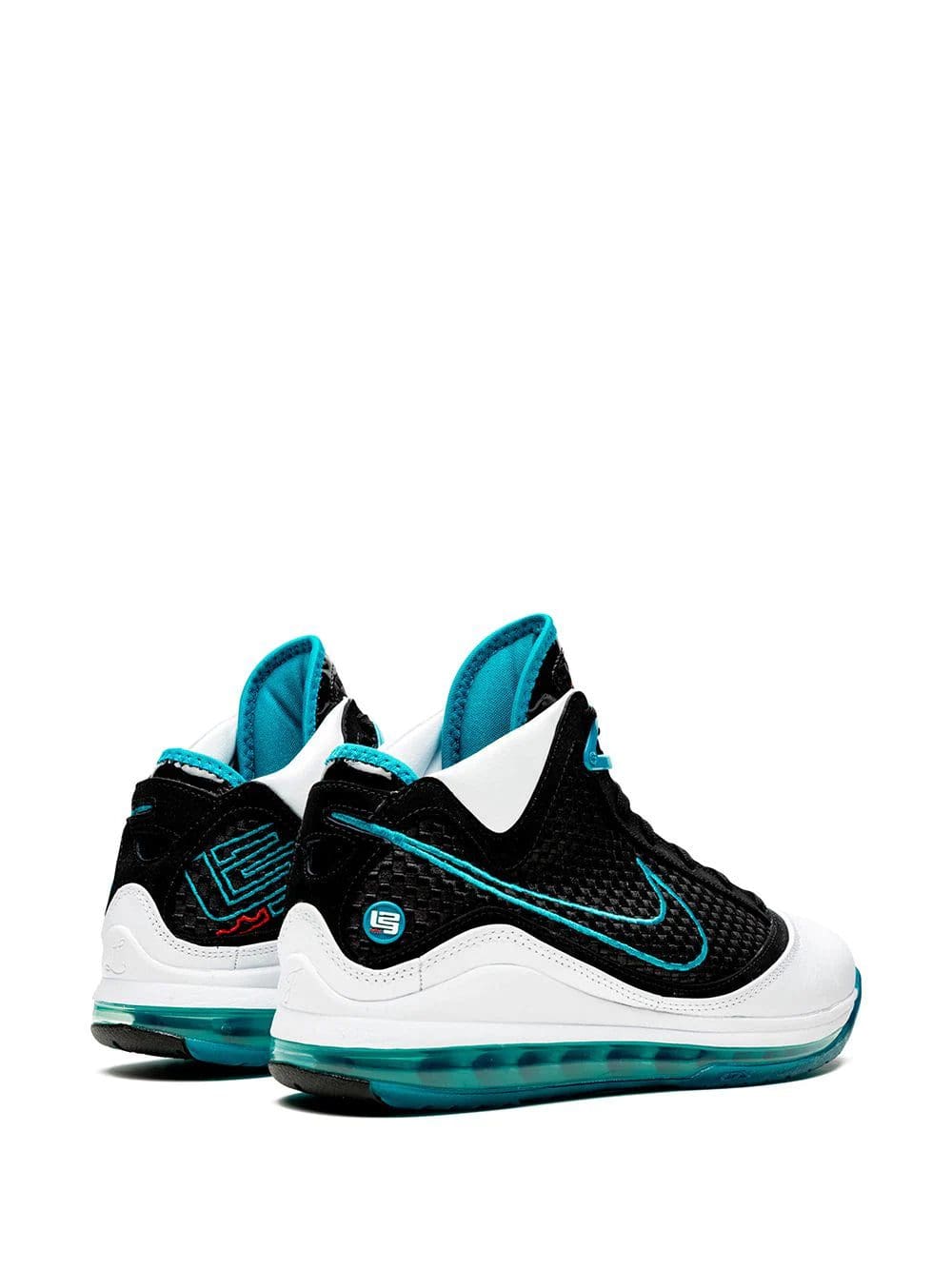Supplied by a premier sneaker marketplace dealing with unworn, already sold out, in demand rarities. Each product is rigorously inspected by experienced experts guaranteeing authenticity. These black, white and glass blue leather Lebron 7 high-top sneakers from Nike feature a round toe, a flat rubber sole, a lace fastening, a branded insole and a signature Nike swoosh.