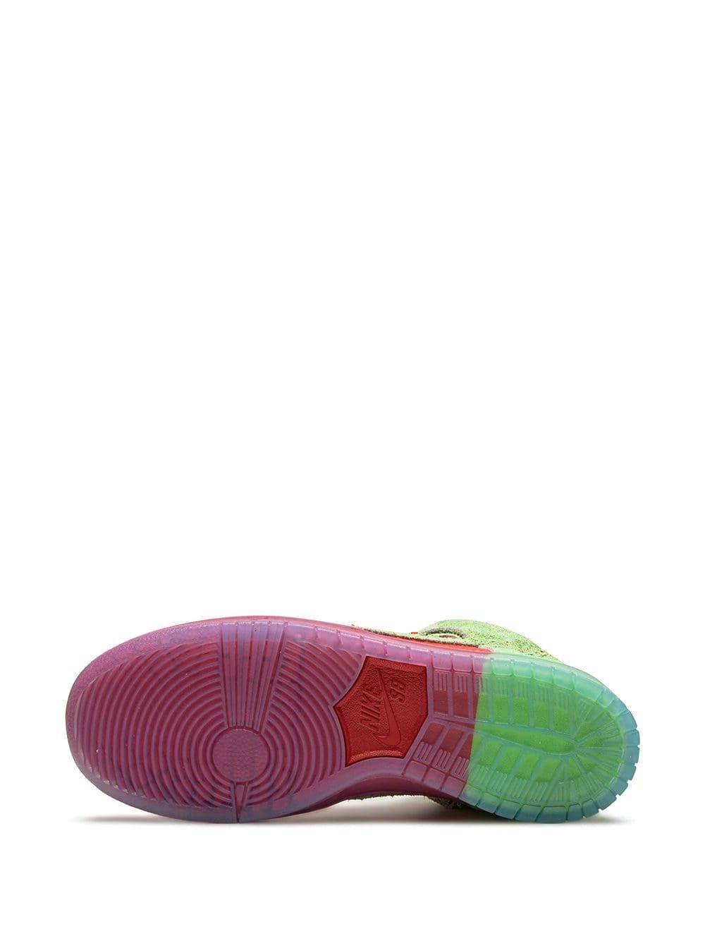 The Nike SB Dunk High “Strawberry Cough” is yet another covetable release from Nike’s skateboarding division to employ a playful marijuana-themed design. Taking inspiration directly from the marijuana strain of the same nickname, the “Strawberry Cough” Dunk features a red perforated leather toe, tonal leather overlays on the forefoot, and a red leather mid-panel, all with dot-textured accents reminiscent of seeds found in the tasty fruit. Modeled after the stem and leaves of a strawberry, the back half of the shoe is constructed with supple green suede and a velvet-like materiel along the collar, heel, and Swoosh. The look is pulled together by a whimsical coughing strawberry character embroidered onto the heel and a contrasting translucent midsole.