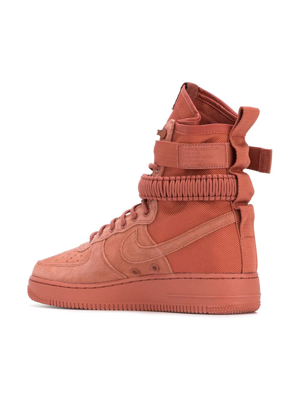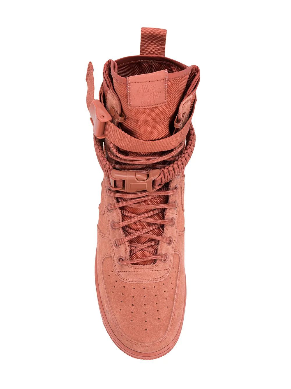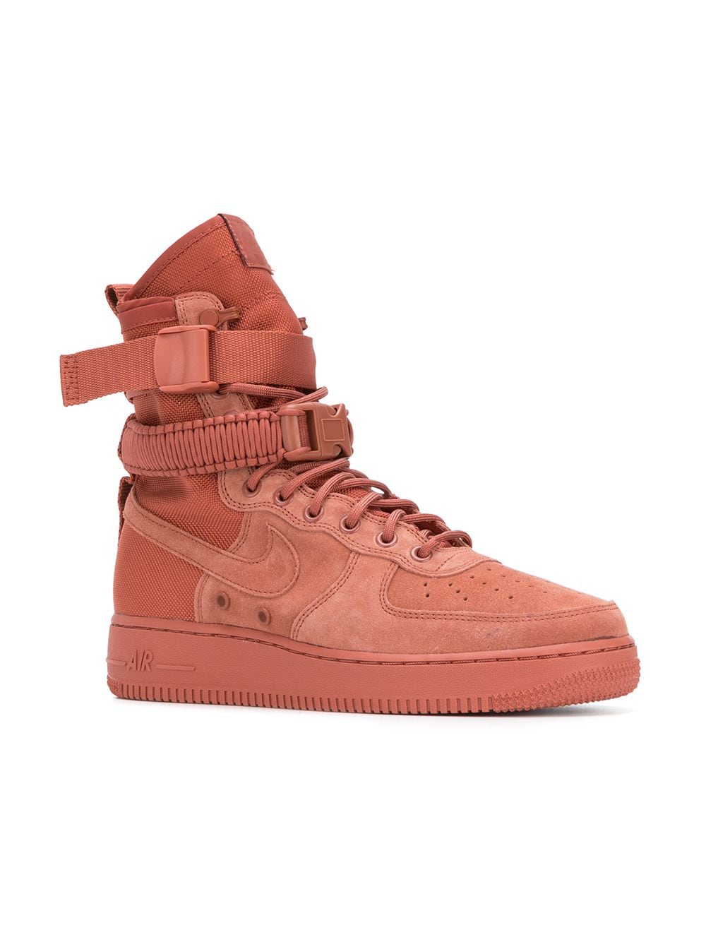 Dusty peach suede Special Field Air Force 1 sneakers from Nike featuring a round toe, a lace-up front fastening, a logo patch at the tongue, a signature Nike swoosh, eyelets, a pull tab at the rear, a rubber sole, two removable buckle fastening ankle straps and a perforated toe box.